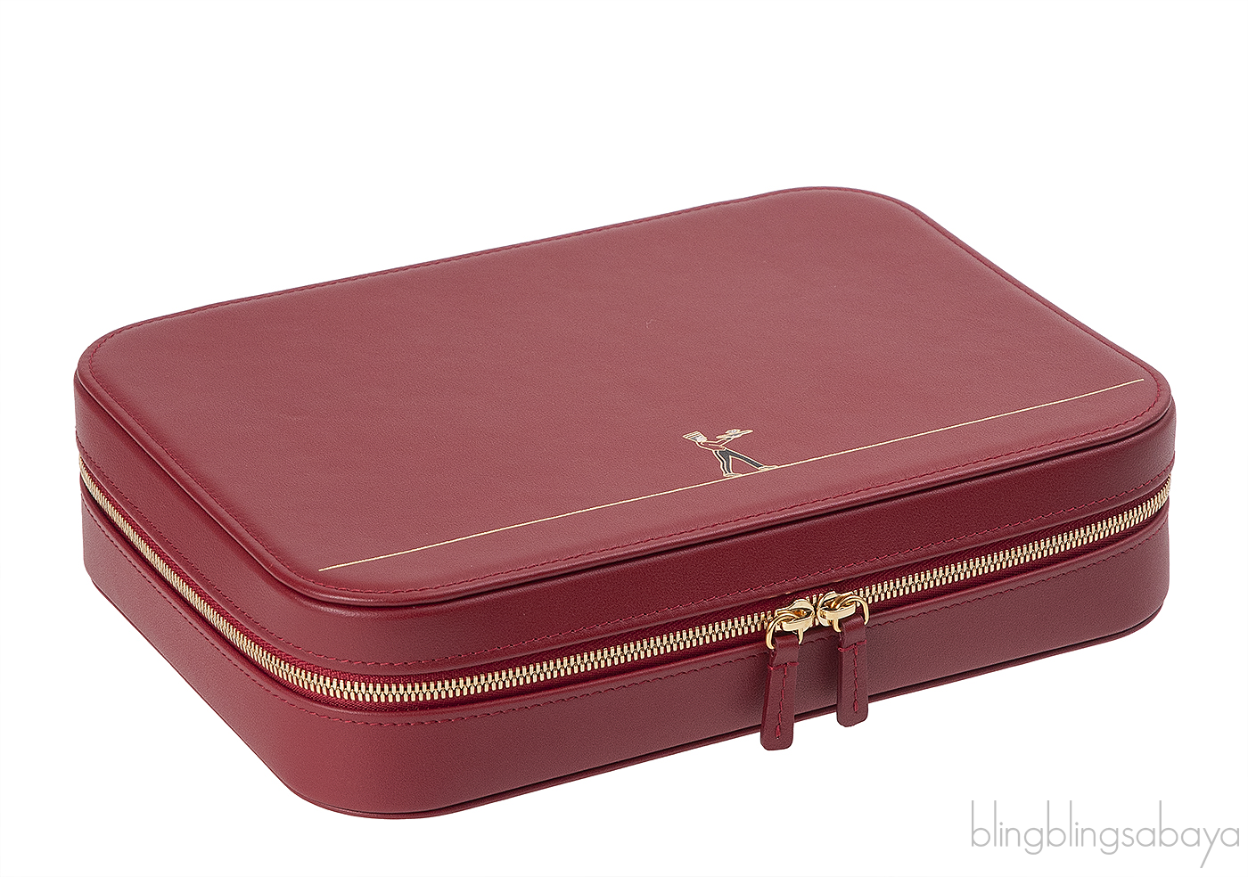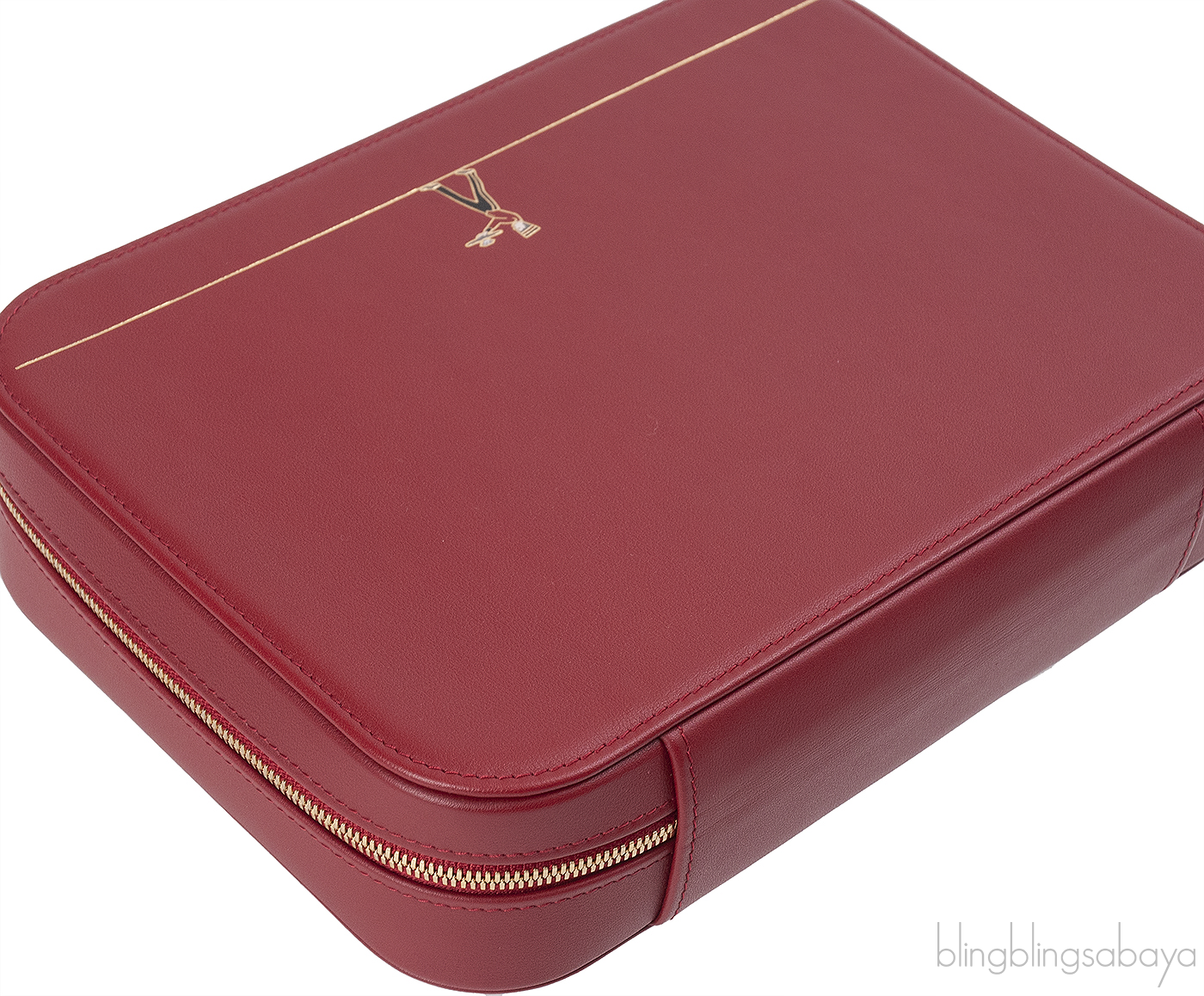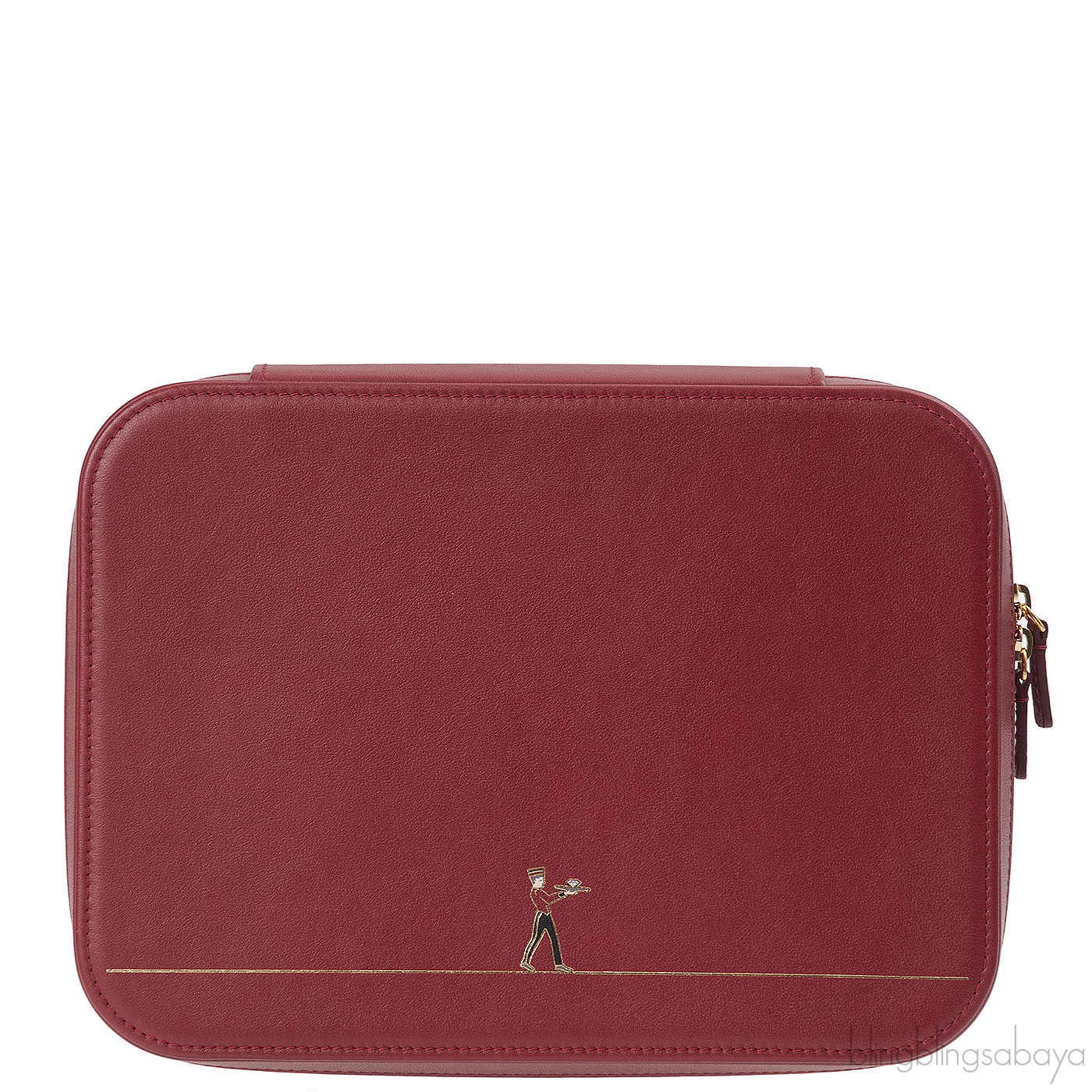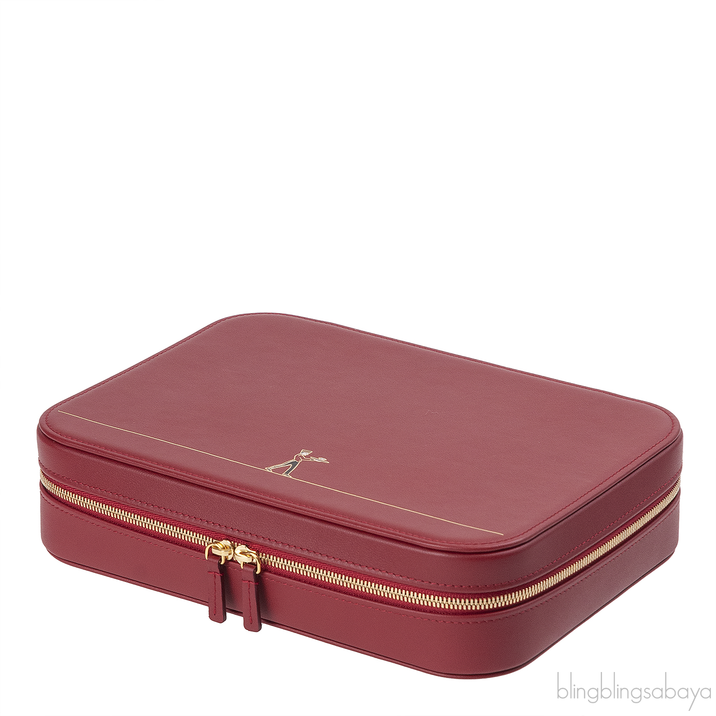 Cartier’s Diabolo de Cartier jewelry travel case offers a wallet-style design adorned with the signature Diabolo motif. Inside, it provides organized spaces for rings, bangles, bracelets, earrings, and pendants, along with two document slots on the lid and a detachable separator. Finished with a zip-around closure.