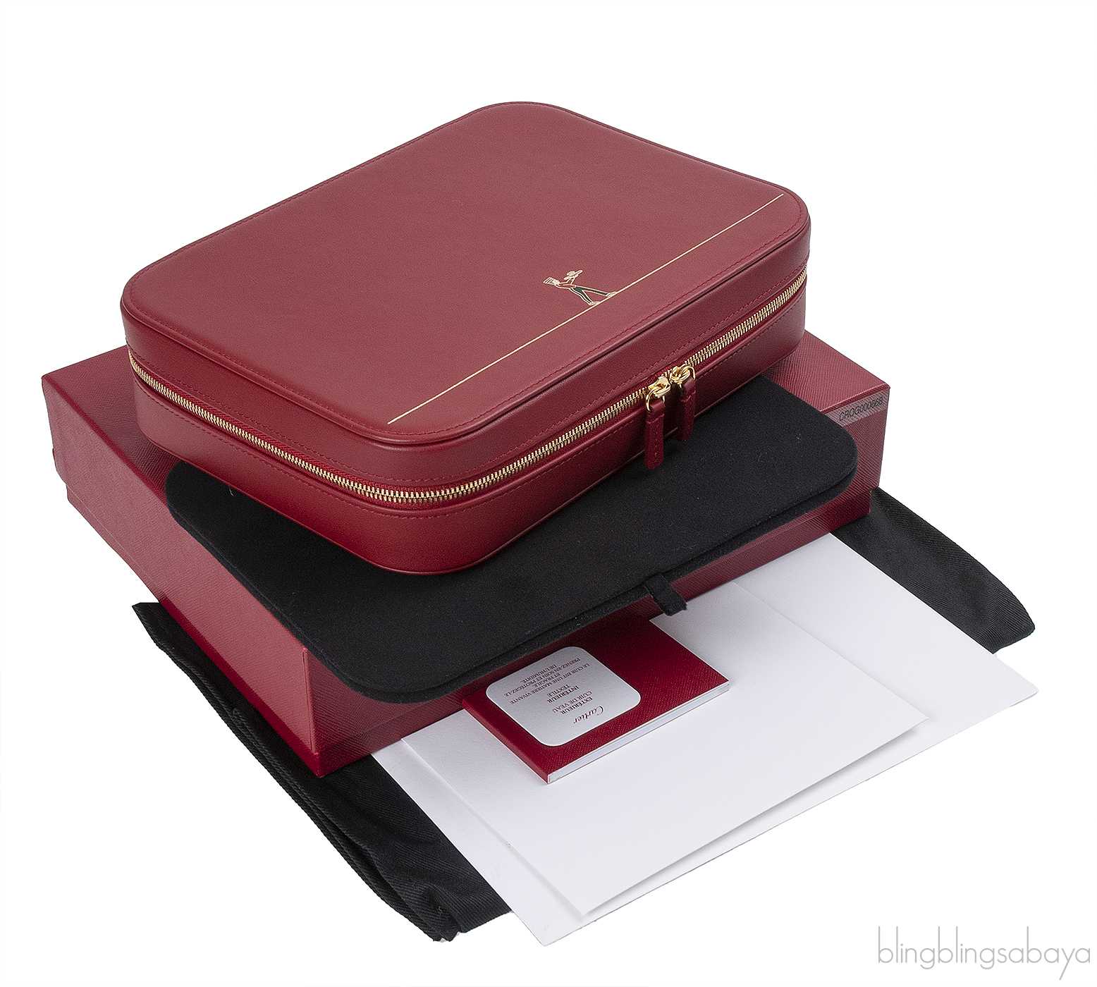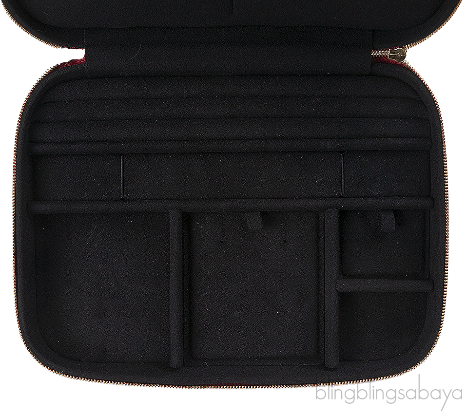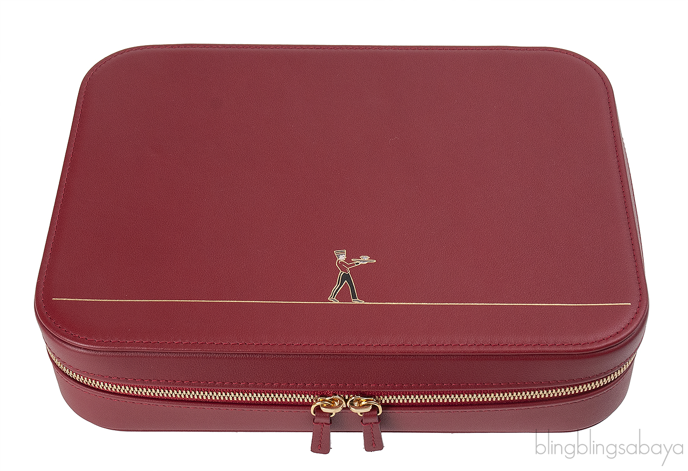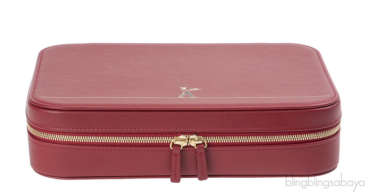 Cartier’s Diabolo de Cartier jewelry travel case offers a wallet-style design adorned with the signature Diabolo motif. Inside, it provides organized spaces for rings, bangles, bracelets, earrings, and pendants, along with two document slots on the lid and a detachable separator. Finished with a zip-around closure.