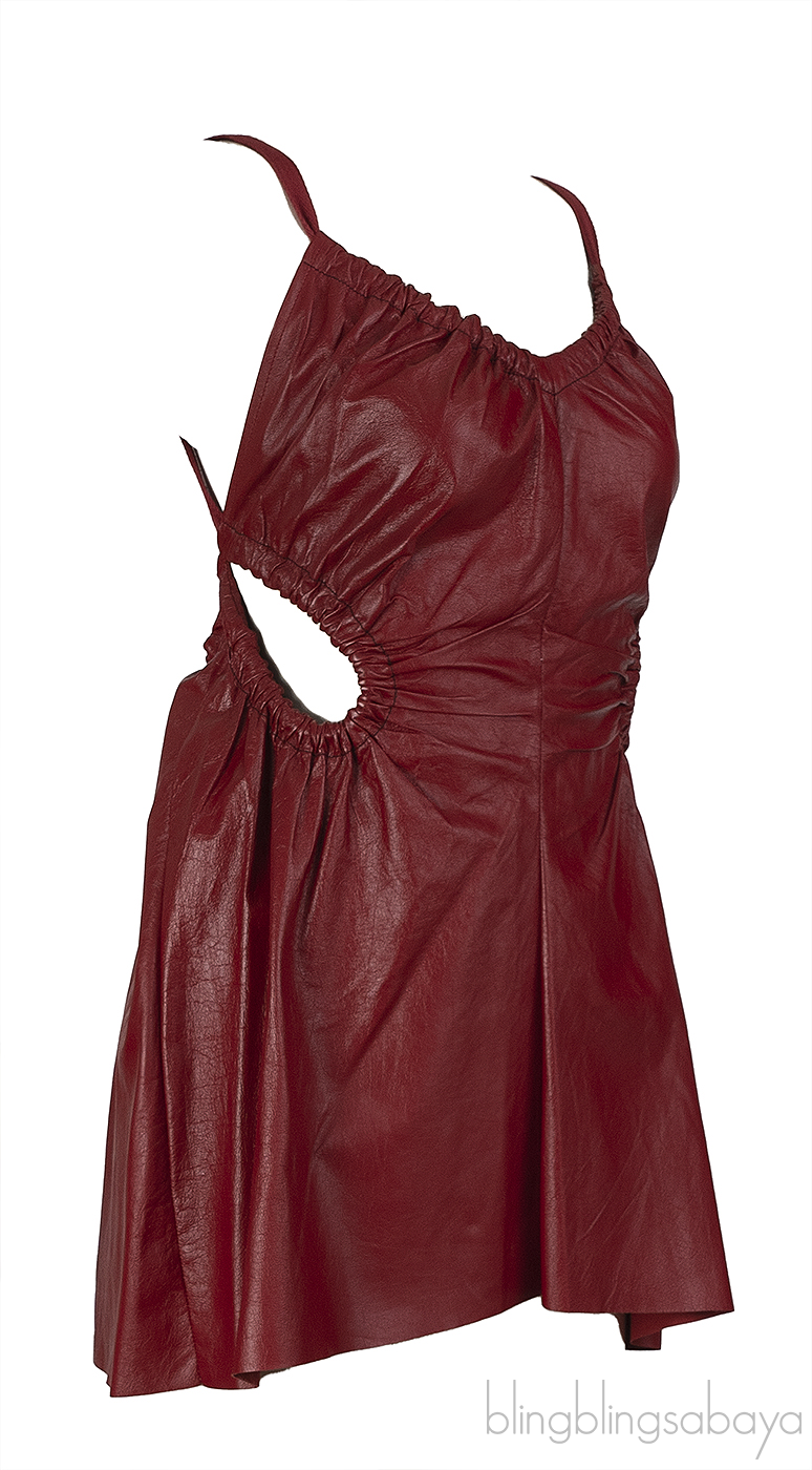 This Celine Burgundy Leather Cut-out Midi Dress is crafted from 100% lamb skin leather. This dress features a v-neckline, open back with ribbon fastening, cut-out on the side and mini length.