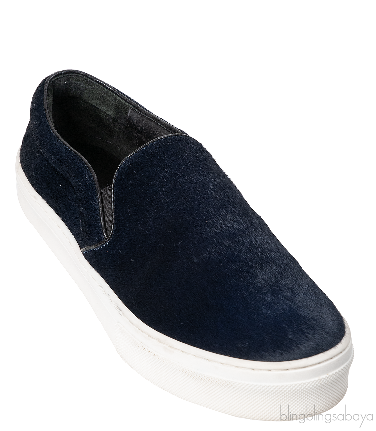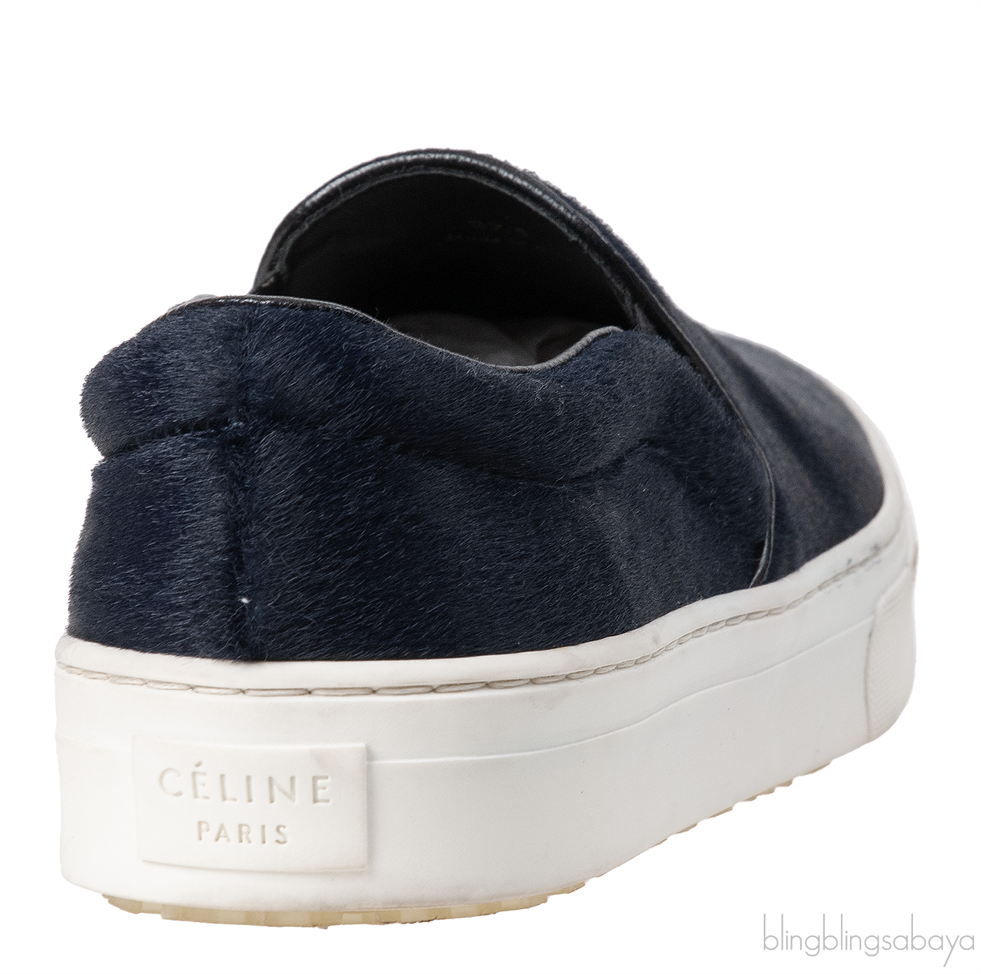 These Navy Blue Pony Sneaker from Celine is crafted in navy blue pony hair upper with black leather trimming collar featuring a round toe, a leather lining, and white rubber sole.