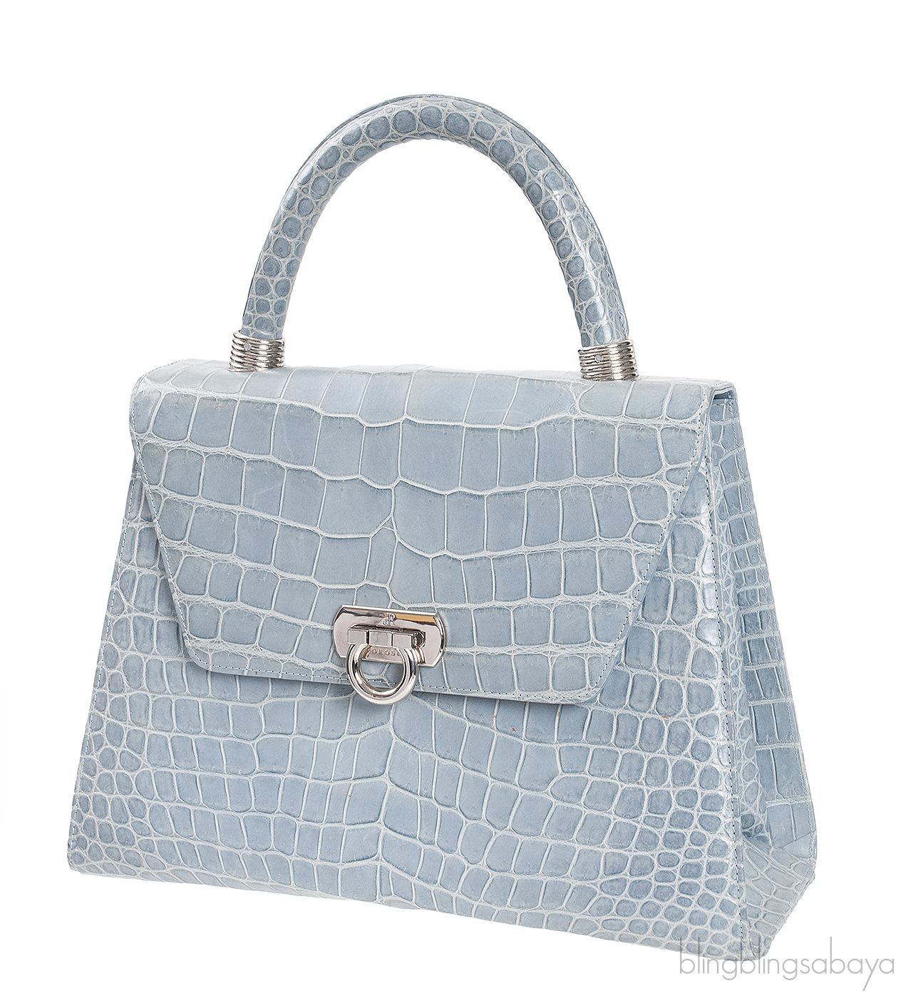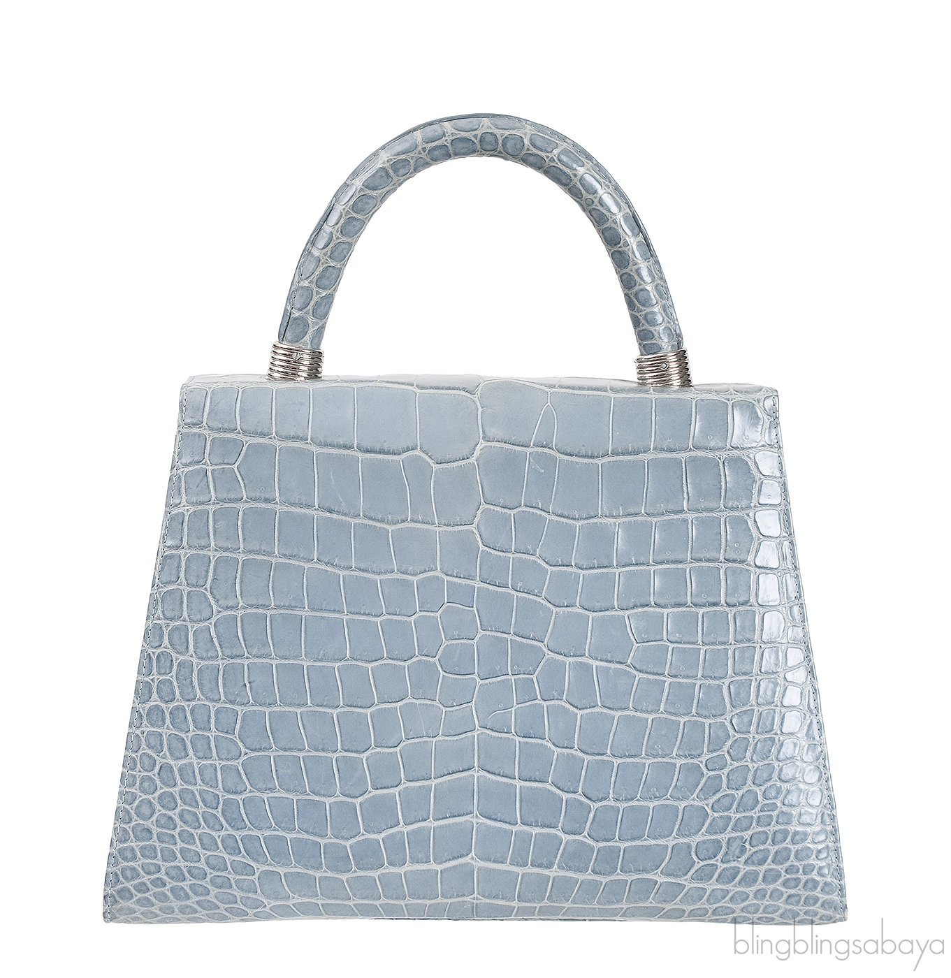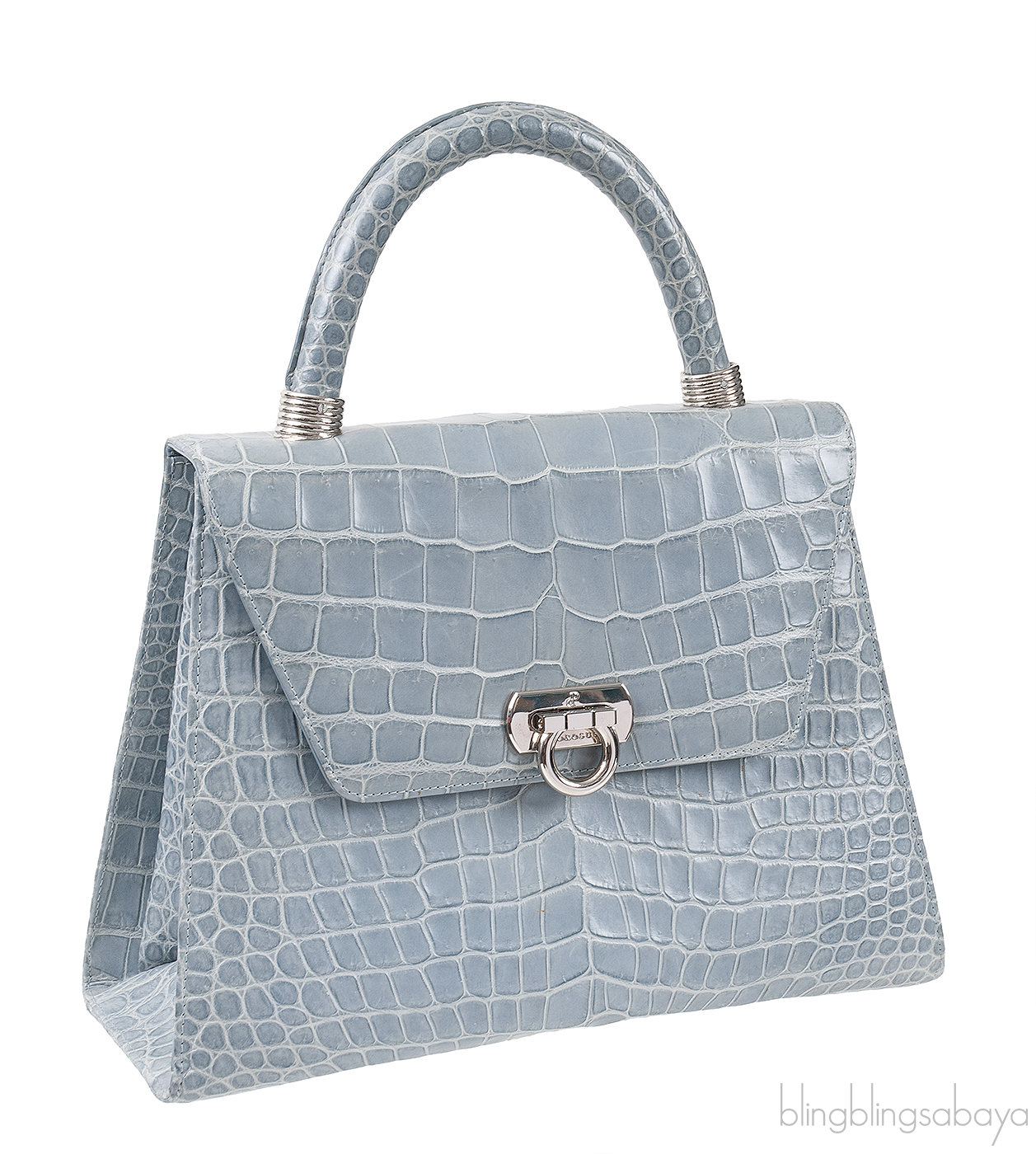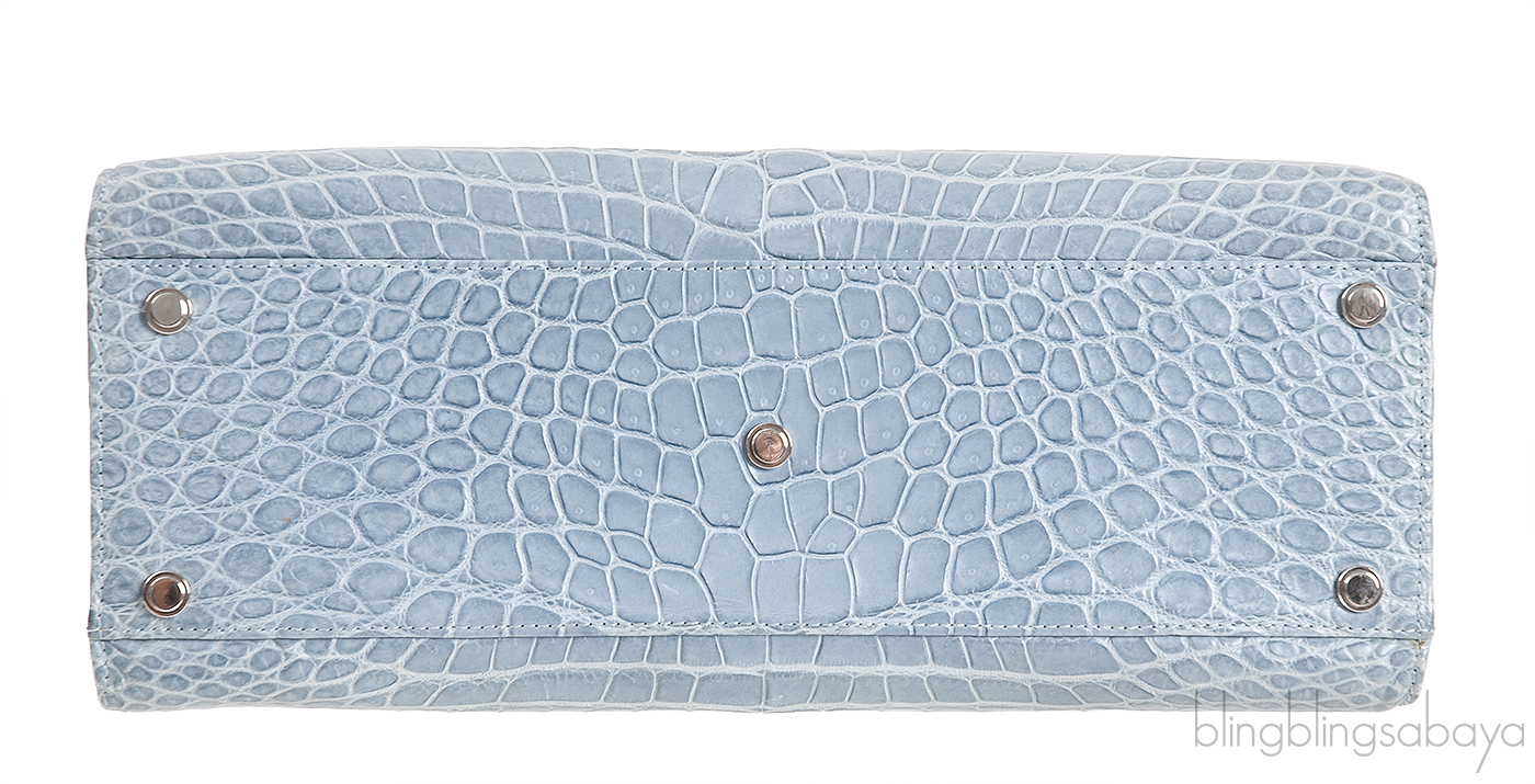 This Light Blue Gray Crocodile Handbag from Cesare Furs by Porosus is crafted in light blue gray crocodile leather accented with palladium hardware. This bag features a structured design with single rolled handle at top.