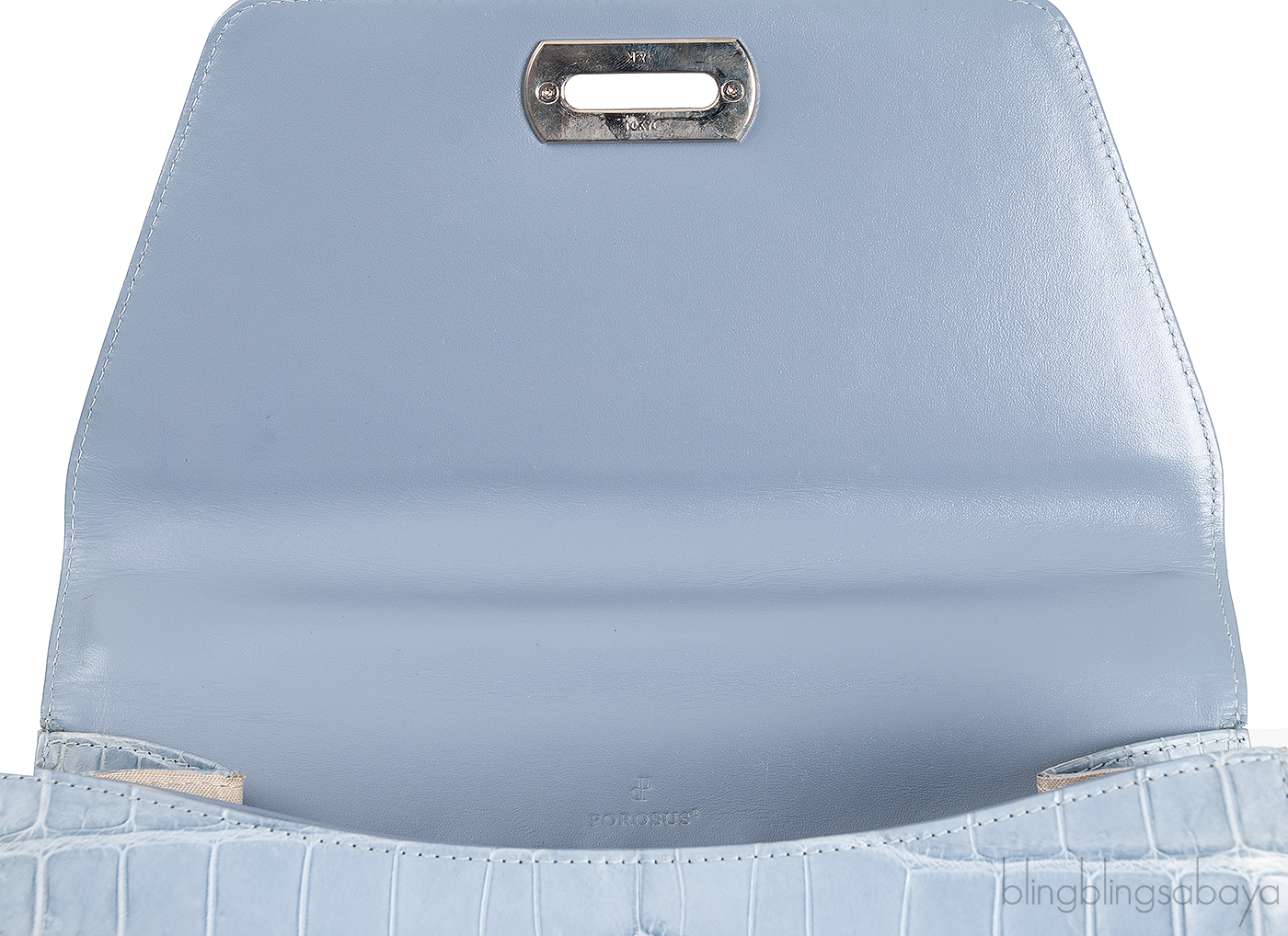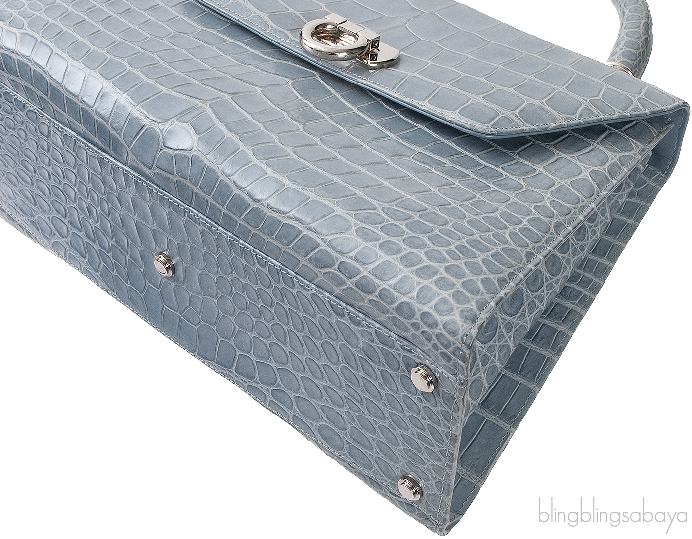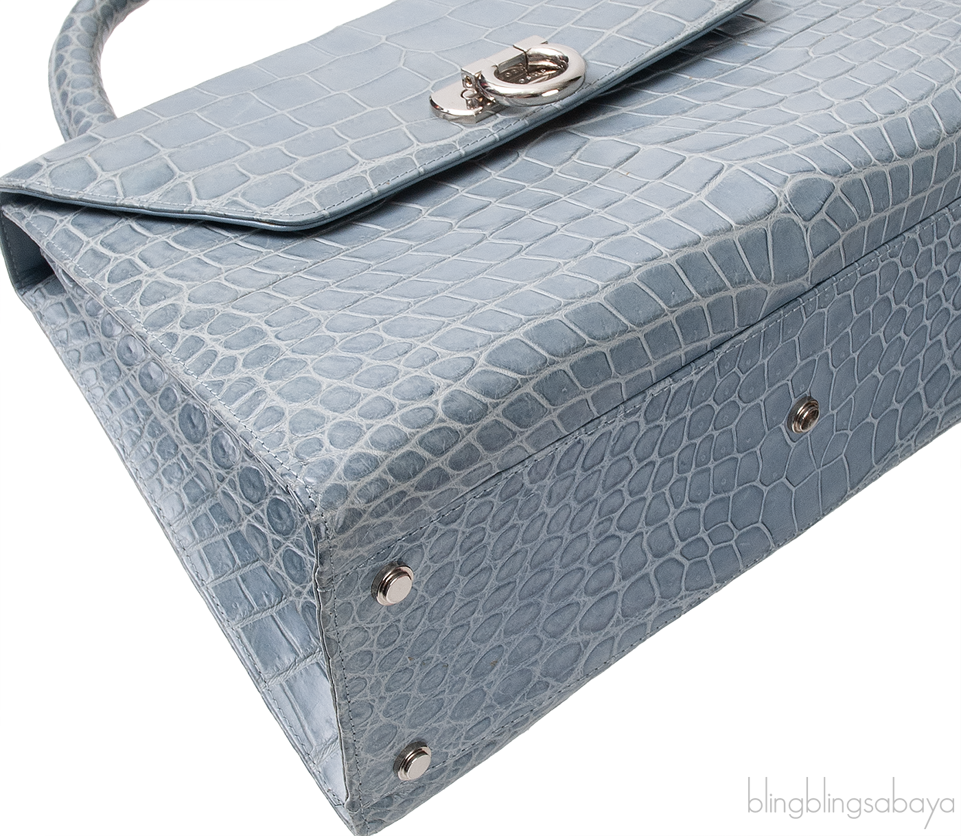This Light Blue Gray Crocodile Handbag from Cesare Furs by Porosus is crafted in light blue gray crocodile leather accented with palladium hardware. This bag features a structured design with single rolled handle at top.