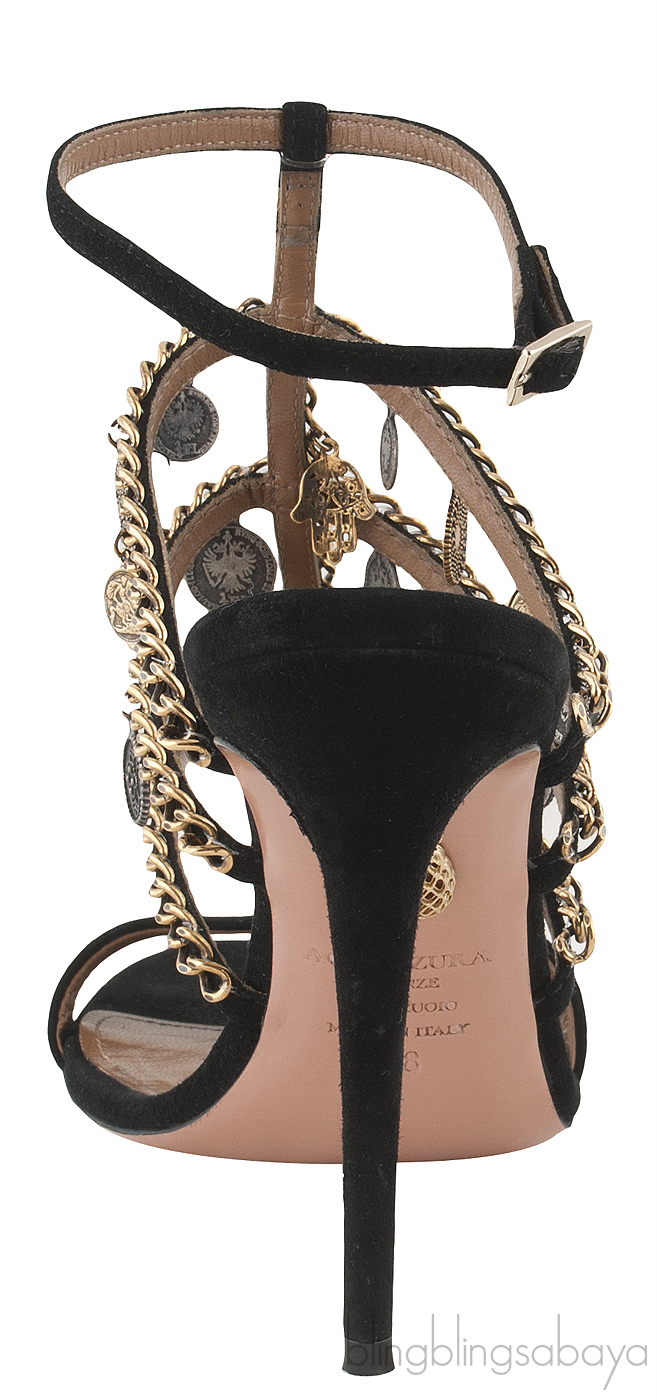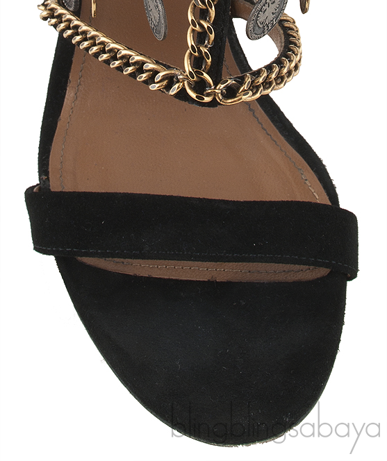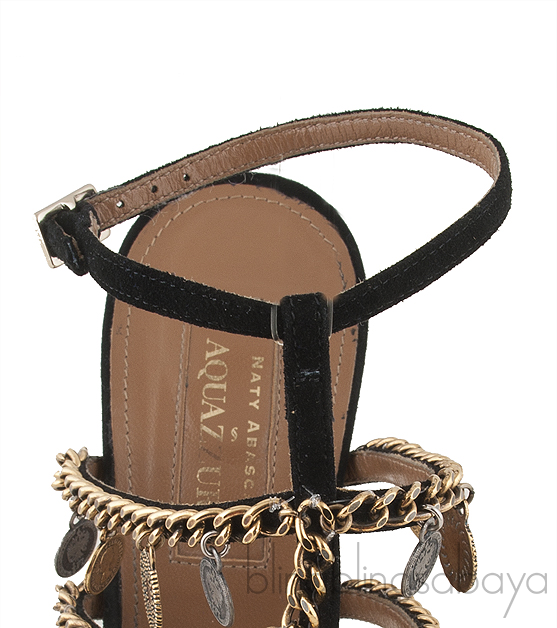 This Chain Coin Slingback Sandals from Aquazzura is crafted in black suede fabric with brown leather lining. These heels features a strappy upper with gold chain detailing and dangling black coins at front, peep almond toe, slingback with gold buckle fastening. leather lined insole, heels measuring 4.25 inches high and leather sole.