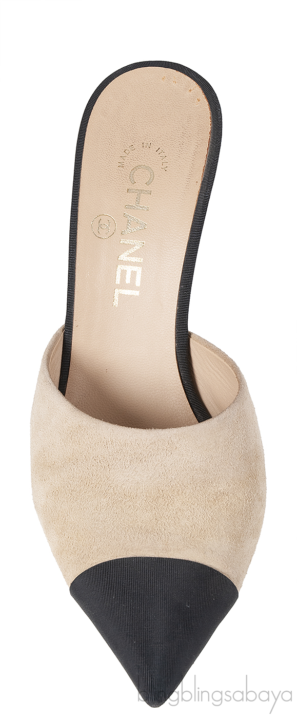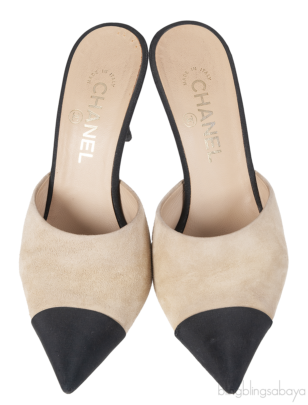 CHANEL BEIGE AND BLACK SUEDE POINTED MULE!