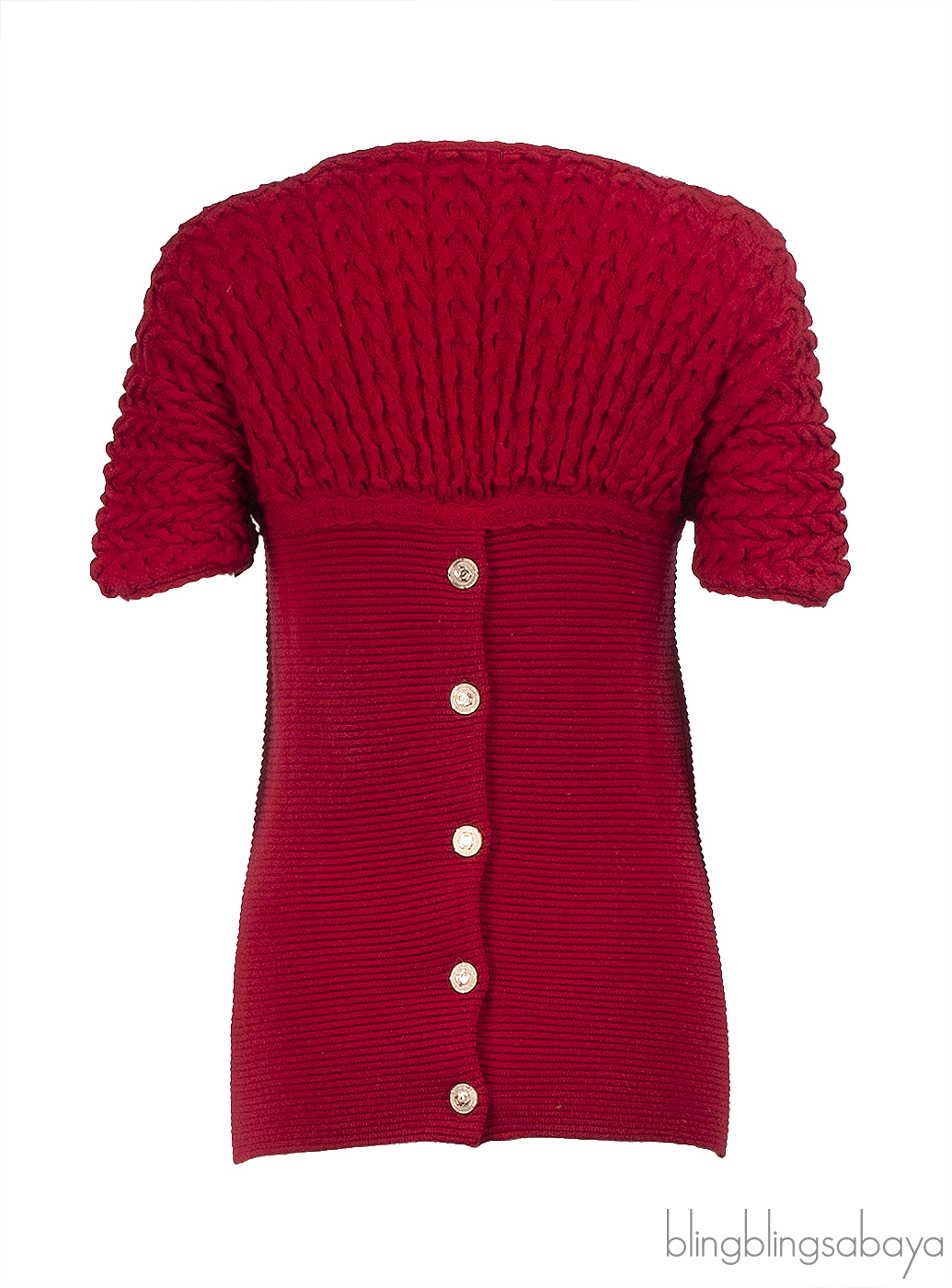 This vintage Chanel top is made from 100% wool in a rich red shade. It features a square neckline, short sleeves, a pull-over design, and elegant gold button accents at the back.