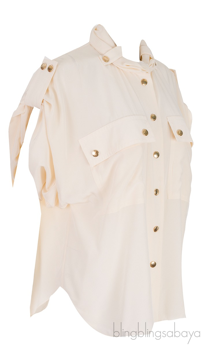 This Chest Pocket Blouse from Chloe is crafted from 100% Silk fabric in buttercream hue. This blouse features a straight fit, front snap fastening, two chest pockets , adjustable short sleeves and curve hemline.