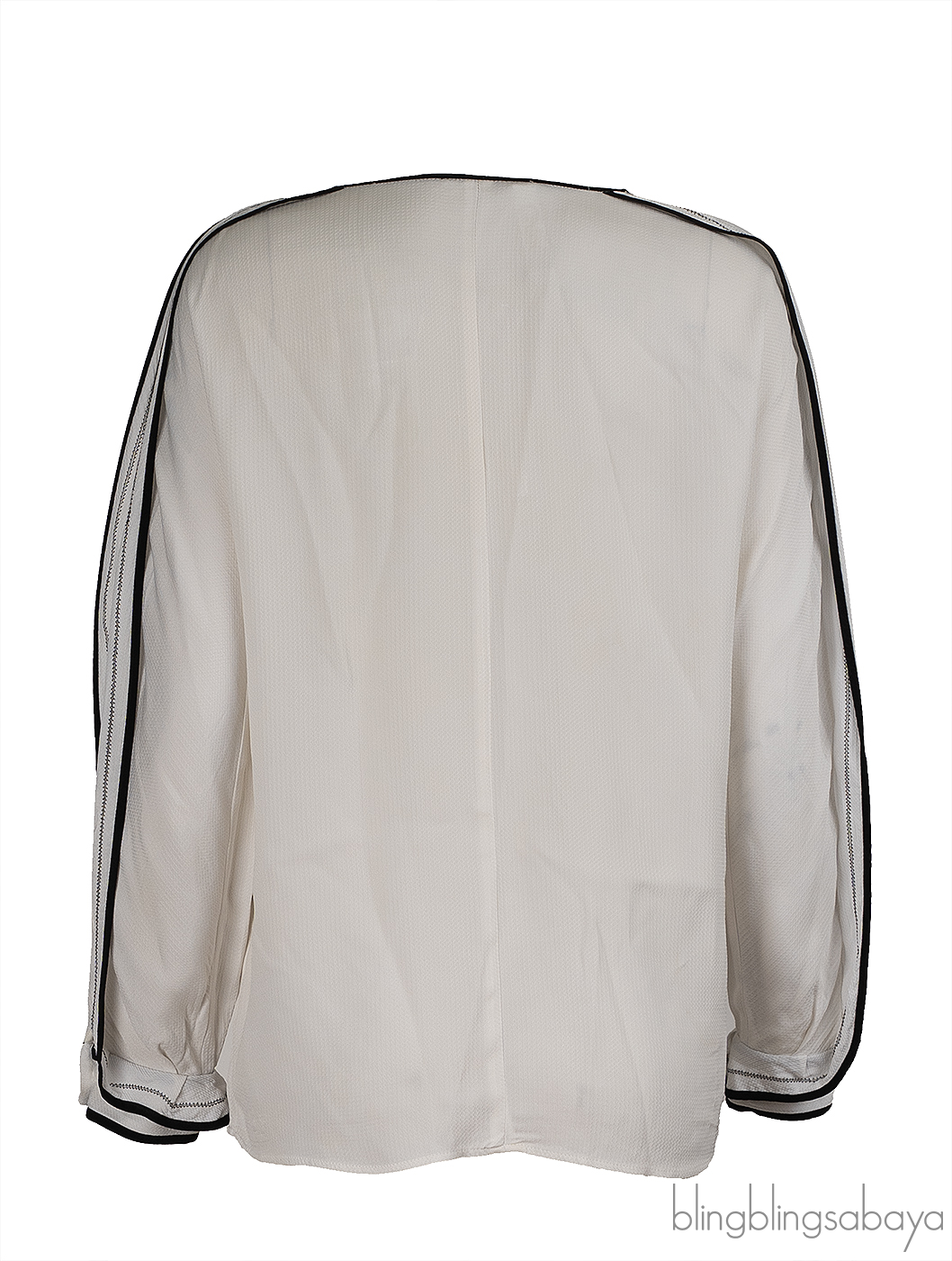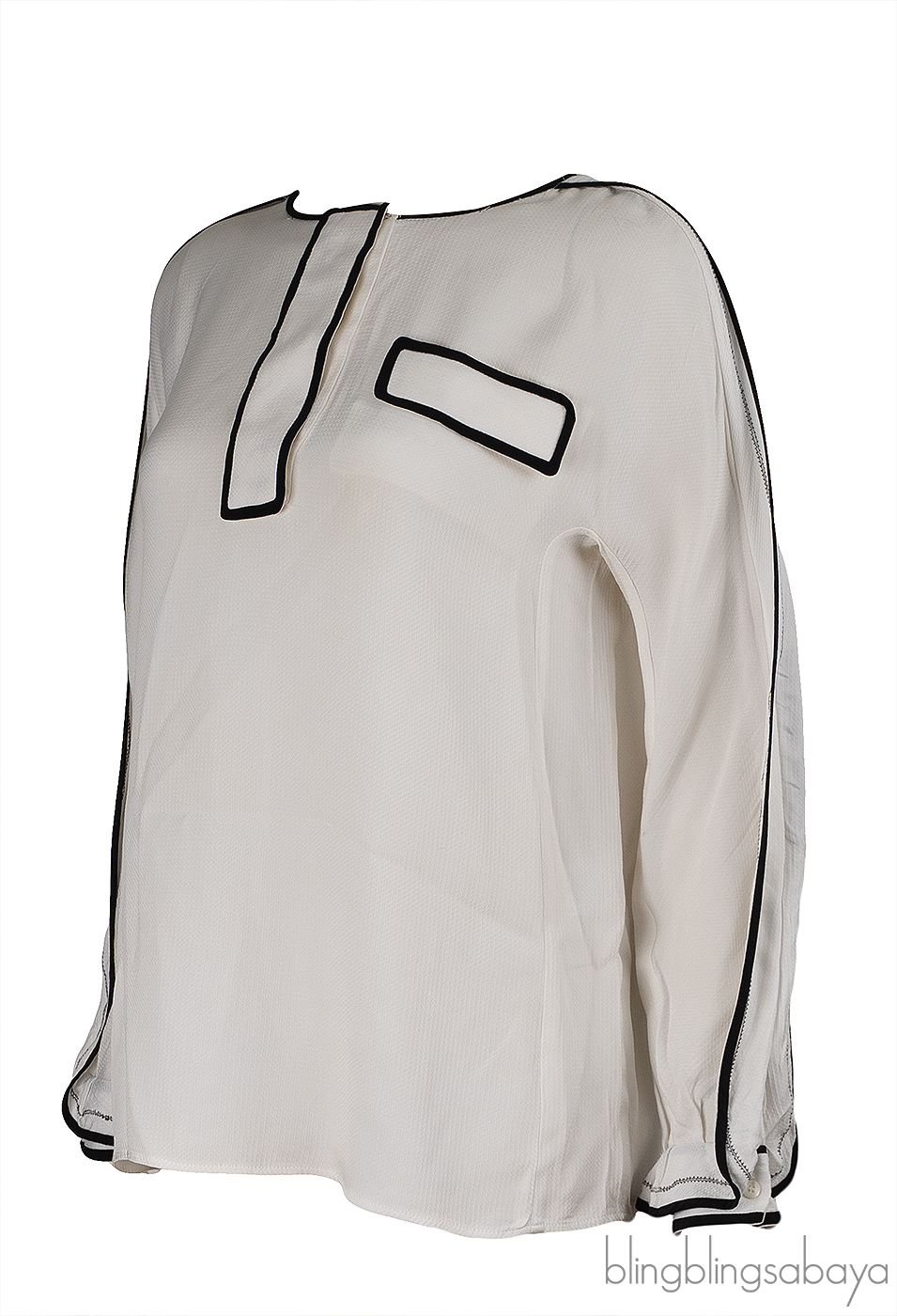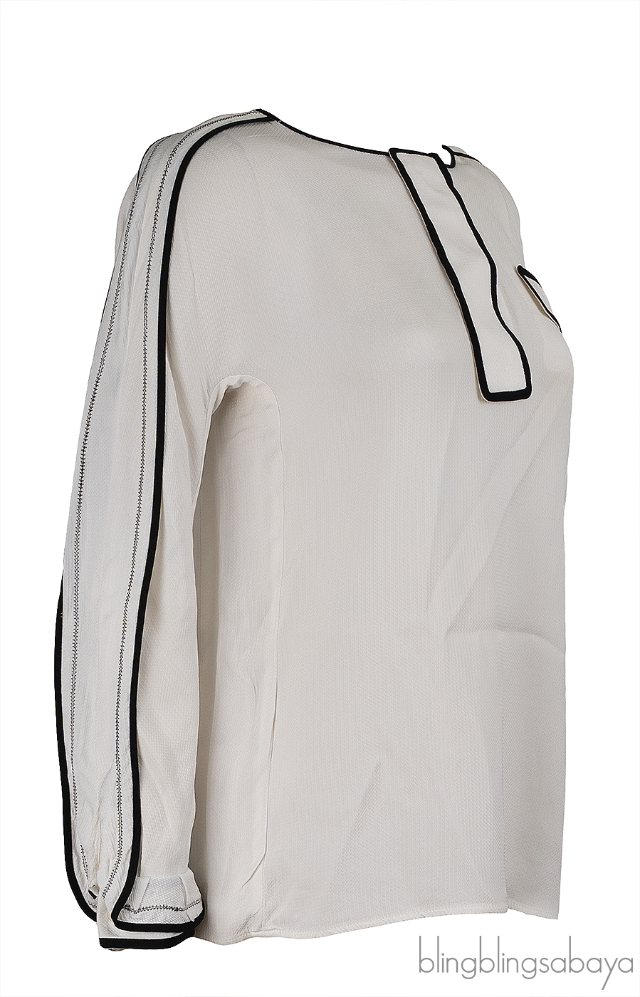 This Chloe Milk-White and Black Trim Blouse is Crafted from a soft blend of 90% viscose and 10% silk. This blouse features a round neckline and partial front button fastening. Designed with long sleeves finished with ruffles and buttoned cuffs, it is detailed with a chest patch pocket and contrasting black trim for a subtle graphic finish.