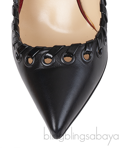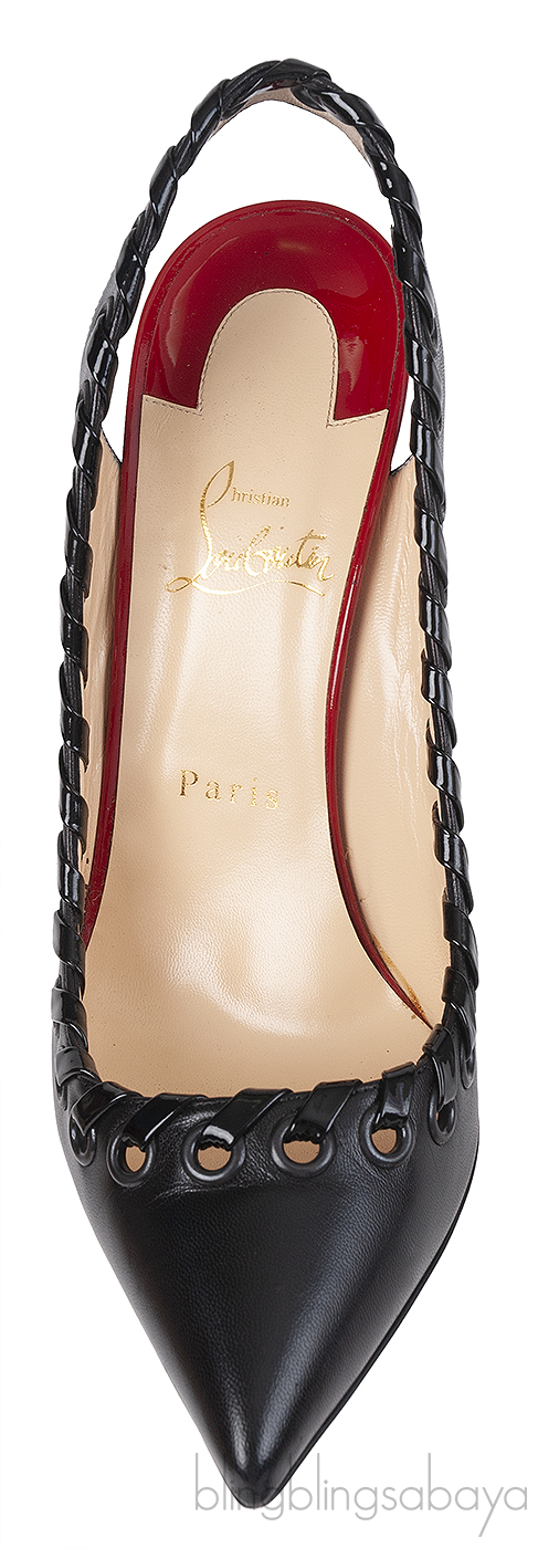 This Black leather Ostri Sling 100 Heels from Christian Louboutin features a pointed-toe slingback pumps with cutouts and covered heels. aesthetic with elegant pointed toe and edgy whip stitched grommets.
