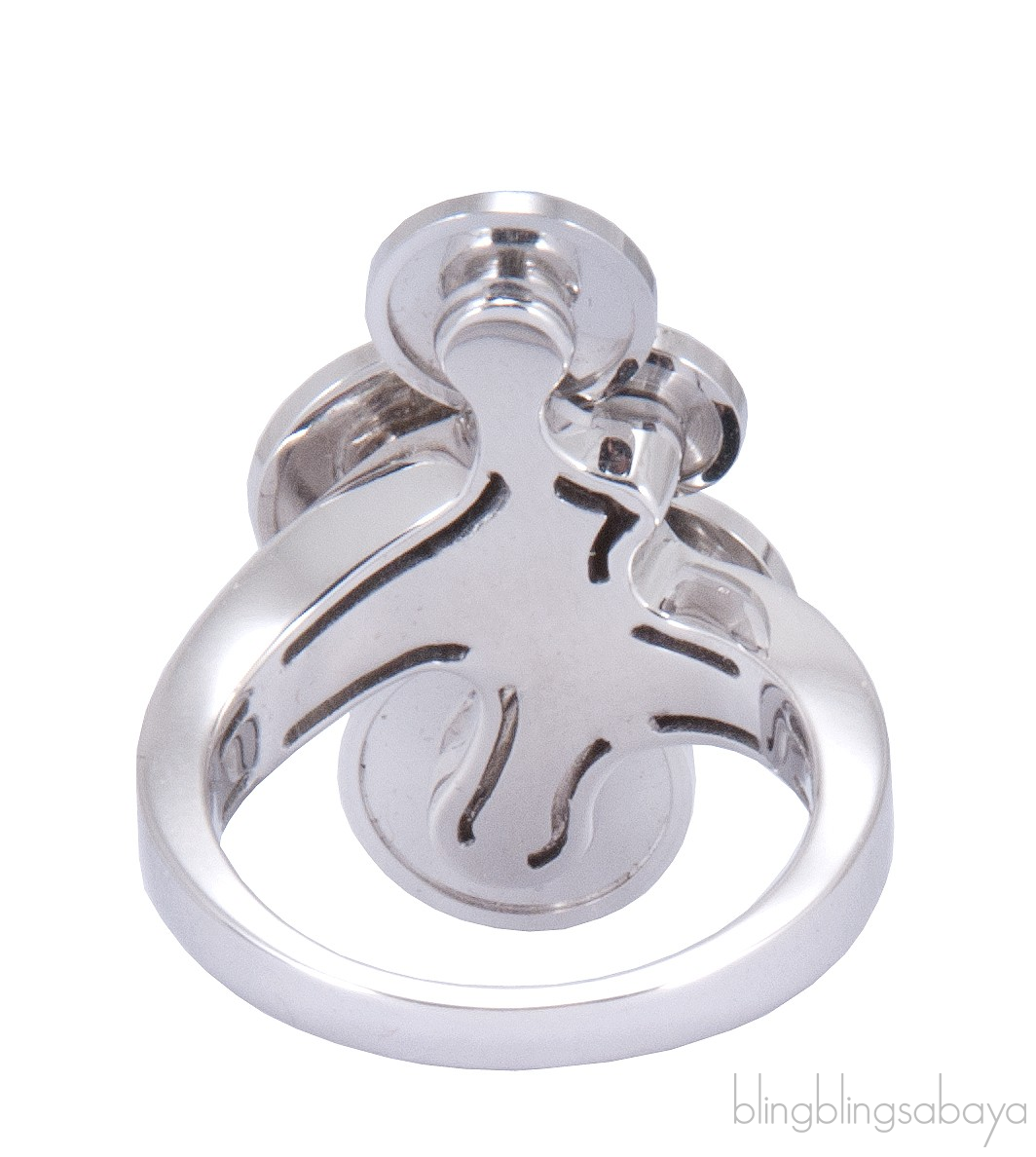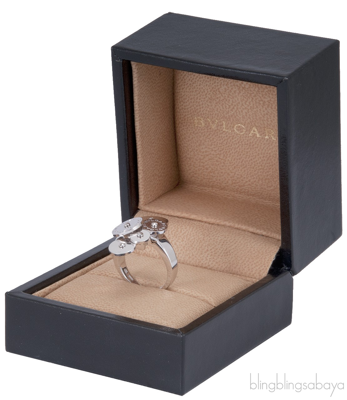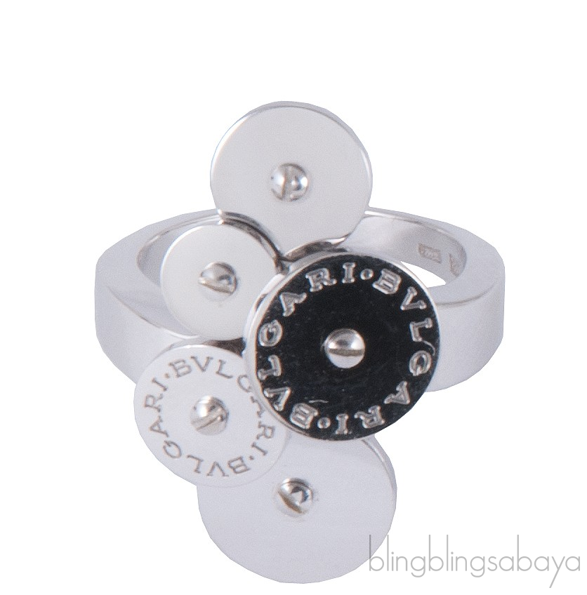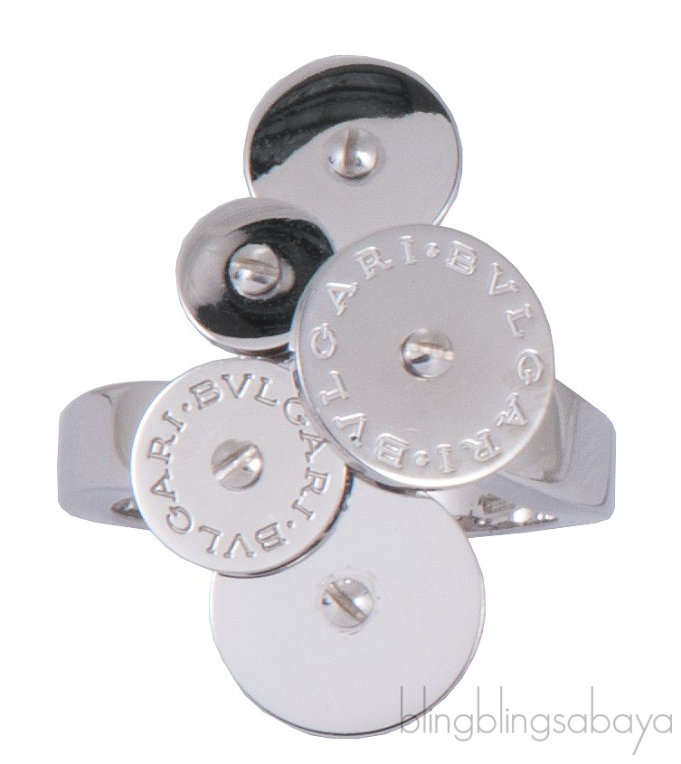 This Cicladi White Gold Ring from Bvlagari's Cicladi Collection was named after the Cyclades group of Greek Island. This beautiful ring is crafted in 18 ct white gold featuring assymetrical movable disc and two with logo2 engraving.