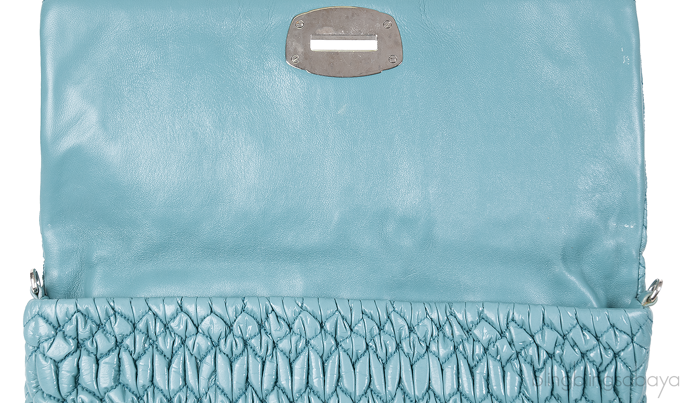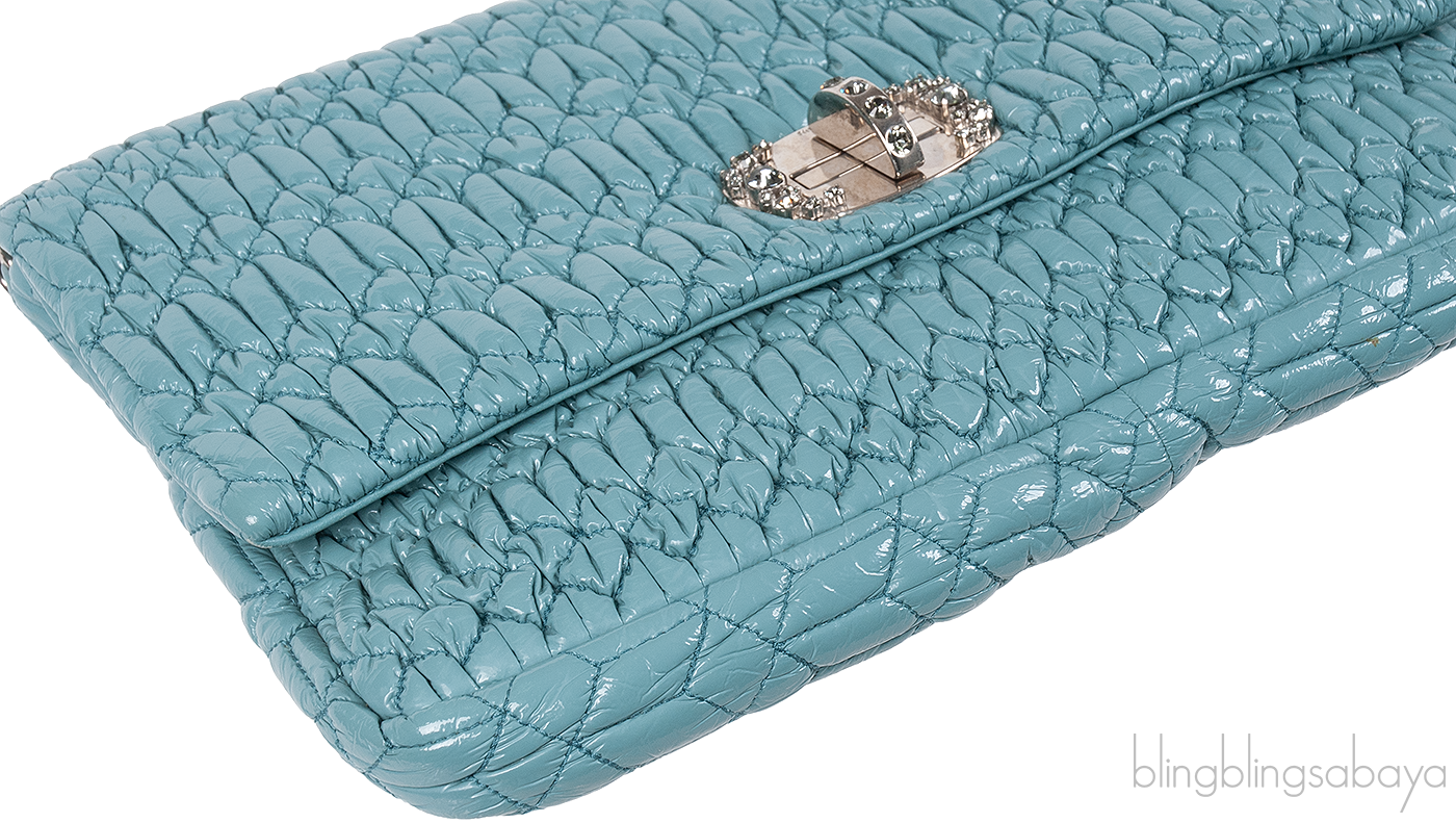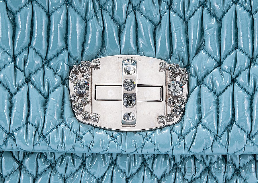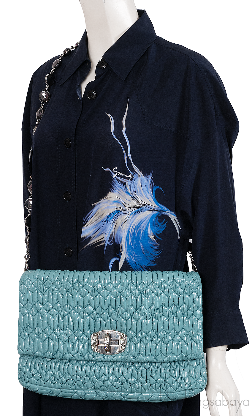 One of the hottest among Miu Miu Collection is this Cloquet Cyan Blue Stage Clutch Bag. Crafted in Cyan Blue Nappa pleated Leather accented with polished silver Hardware. It has detachable strap made of elegant Plexiglass & Swarovski crystal gems that really give the purse an expensive look.