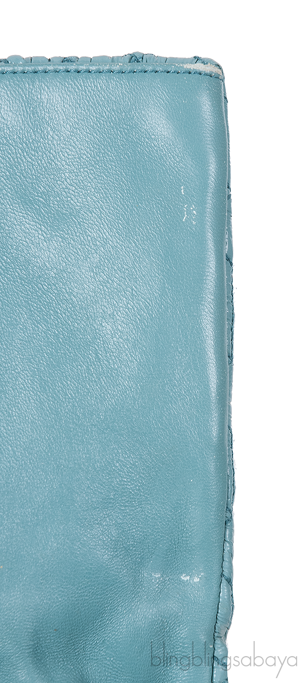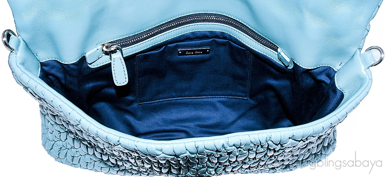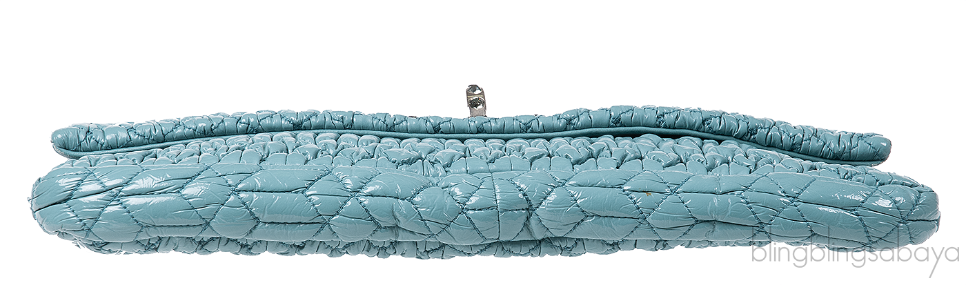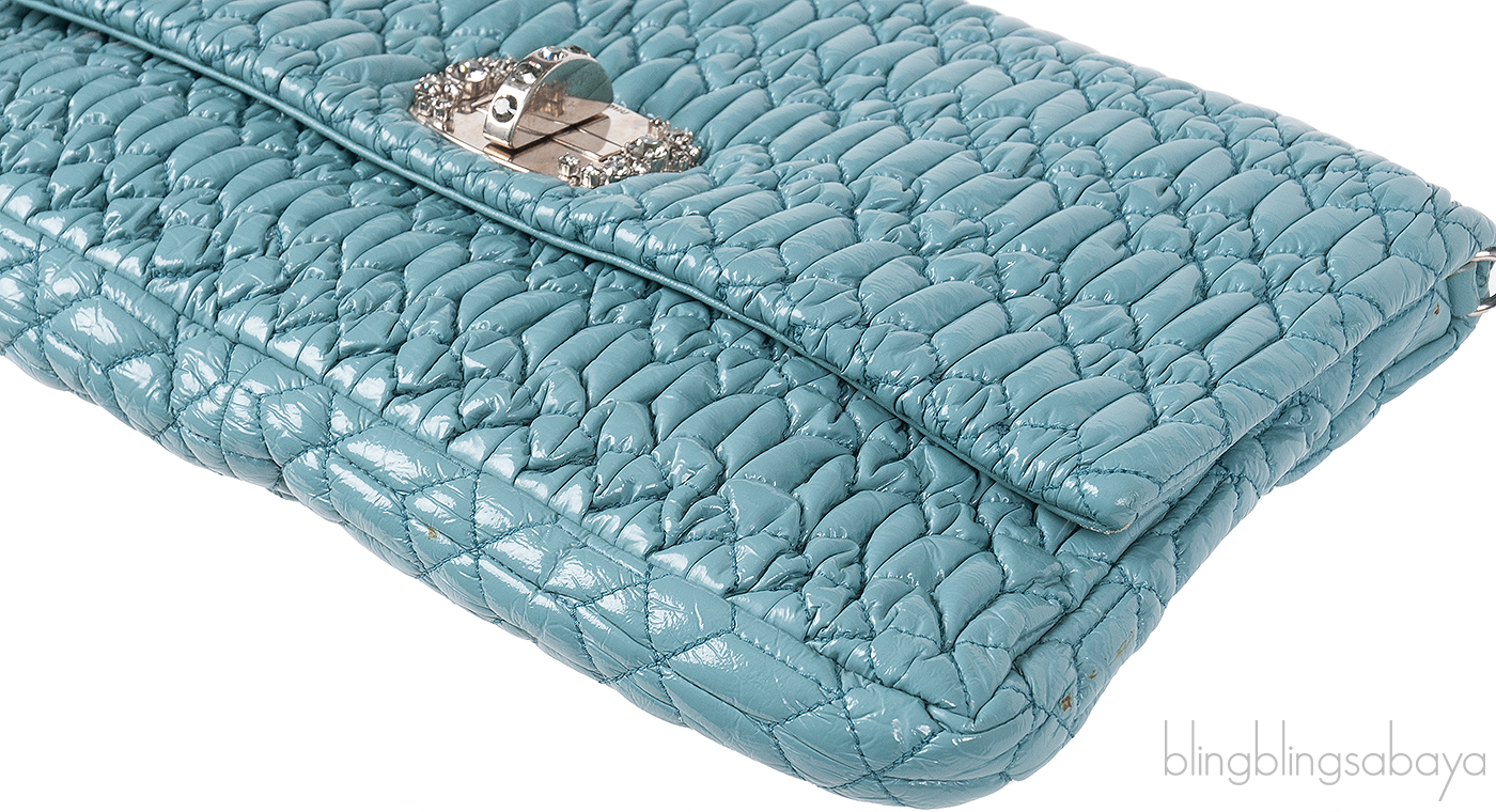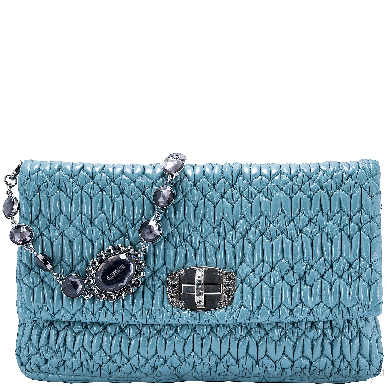 One of the hottest among Miu Miu Collection is this Cloquet Cyan Blue Stage Clutch Bag. Crafted in Cyan Blue Nappa pleated Leather accented with polished silver Hardware. It has detachable strap made of elegant Plexiglass & Swarovski crystal gems that really give the purse an expensive look.