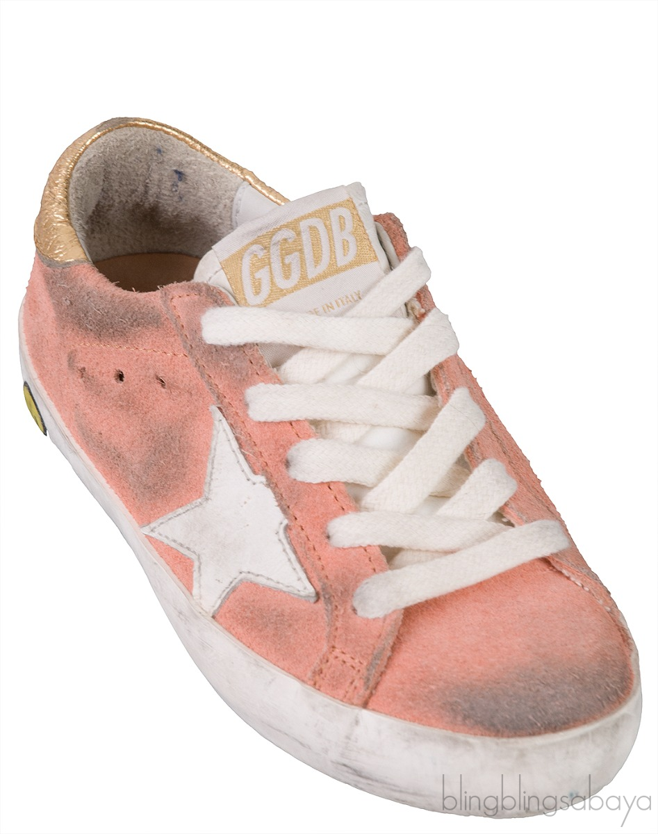These Coral & Gold Super Star Kids Sneaker from Golden Goose is crafted from suede fabric upper in coral pink hue with white star and gold leather detailing on the heel counter. This low top sneakers features a white shoe laces, brand printing at the back, brown leather insole and white rubber sole.