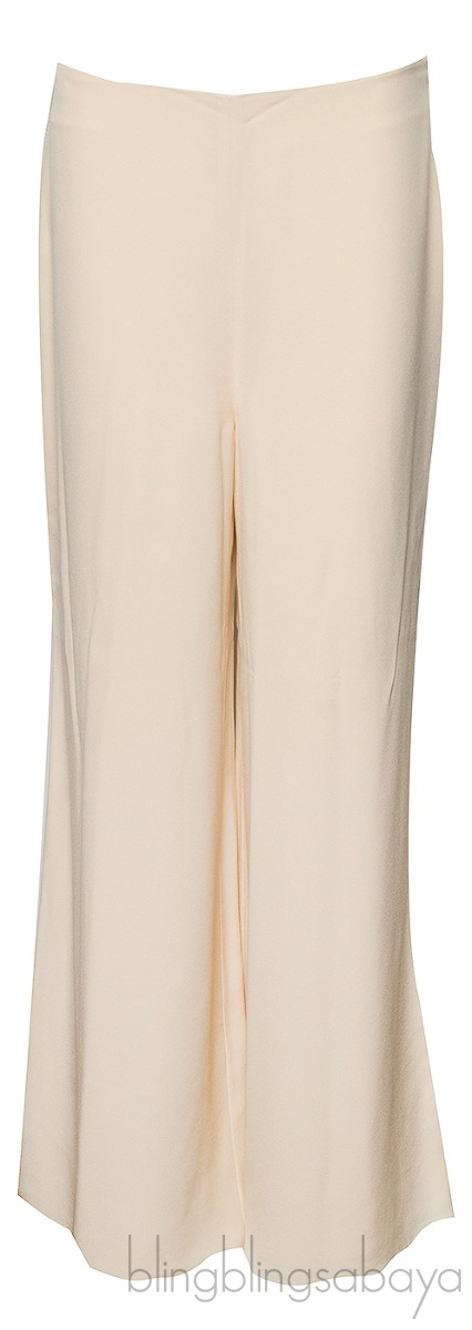 Trouser is crafted from silk in beige hue featuring a wide leg desigg, pocket at rear and has zip fastening on the side.