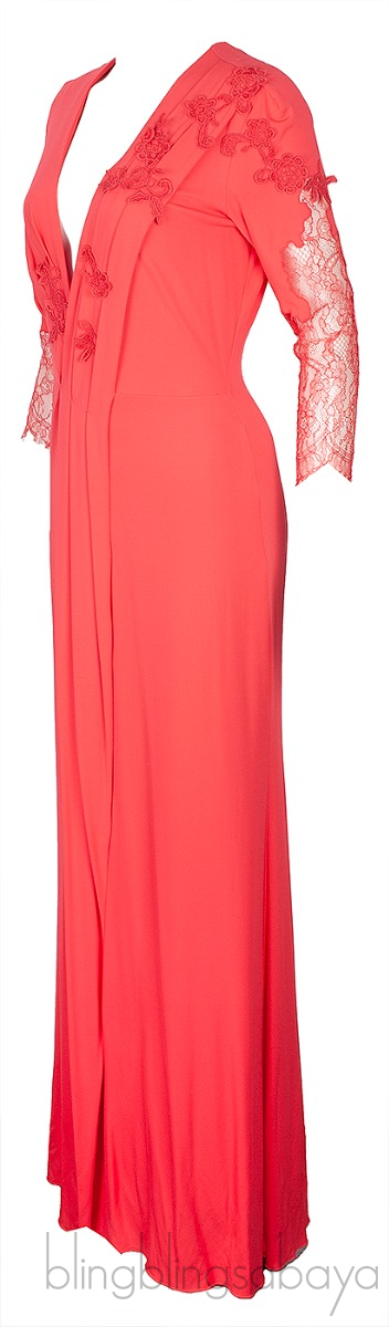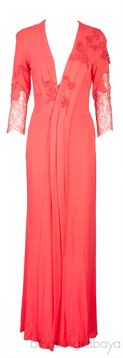 This Coral Pink Lace Sleeve Dress from Bluemarine Anna Molinari is crafted from viscose and elastane fabric in coral pink hue. This dress features a deep v-necklne, long sleeves with lace trim, floral patches at front and sleeves, zipper fastening at rear and maxi length.