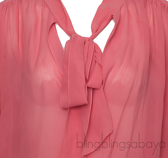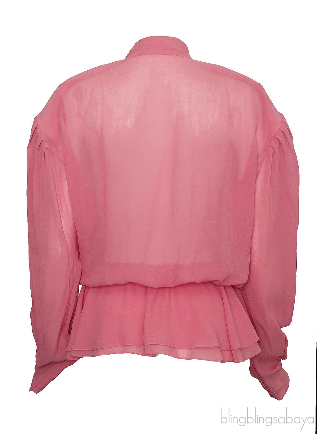 This Coral Pink Peplum Shirt from Balenciaga is crafted in 100% Silk fabric in a coral pink hue. this shirt features a semi-sheer fabric with long sleeves with zip on cuffs, gathered on the shoulder, self-bow tie fastening at front, pull-over style with a layered peplum hem.