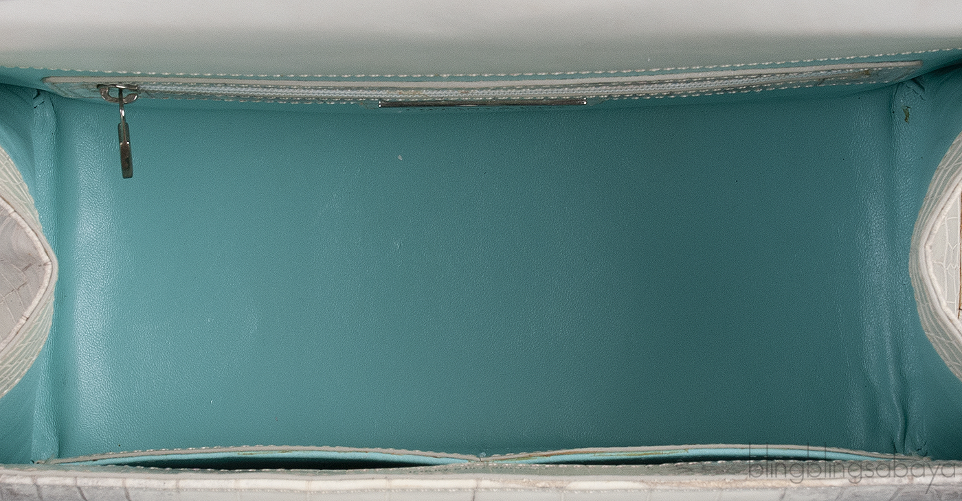 The flap opens to reveal a very roomy interior lined with tiffany blue leather lining and has two patch pockets and zip wall pocket with silver metal logo2 plate inside.