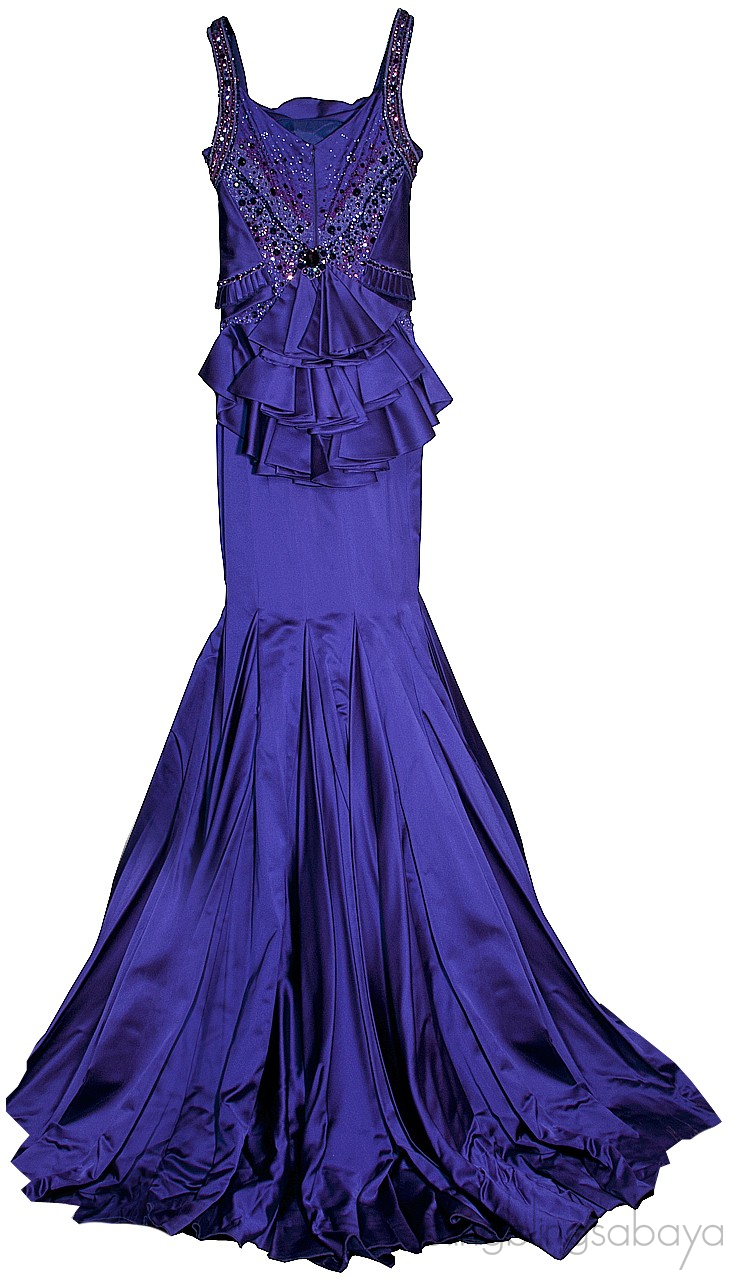 This Crystal Embellished Purple Dress from Walid Atallah features a stunning multicolor assymetrical size crystal embellishment at top and back, fully embellished shoulder straps, scallop neckline, sleeveless, ruffles detailing at rear, a back zip fastening and a mermaid hem. (measurements are approximate)