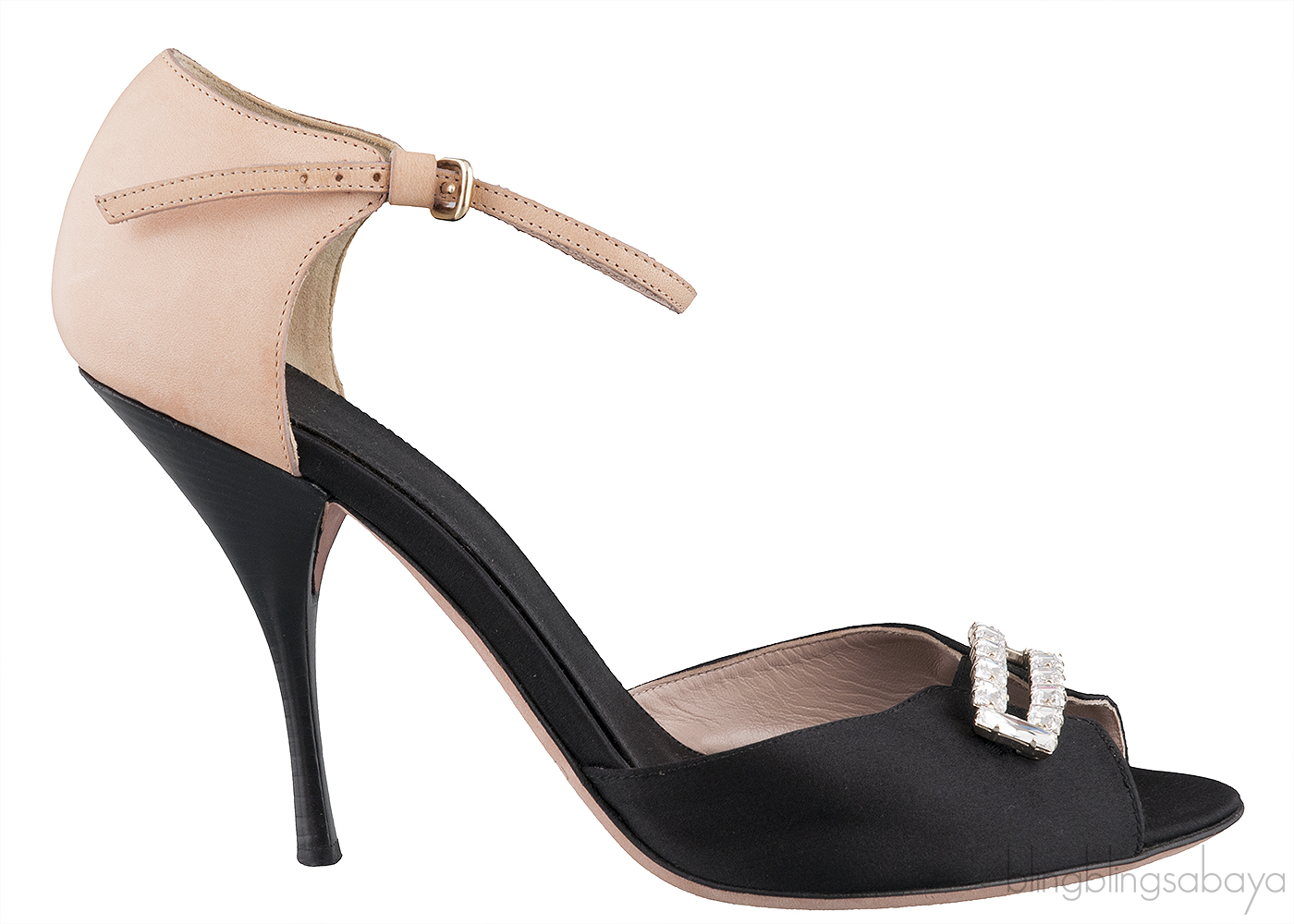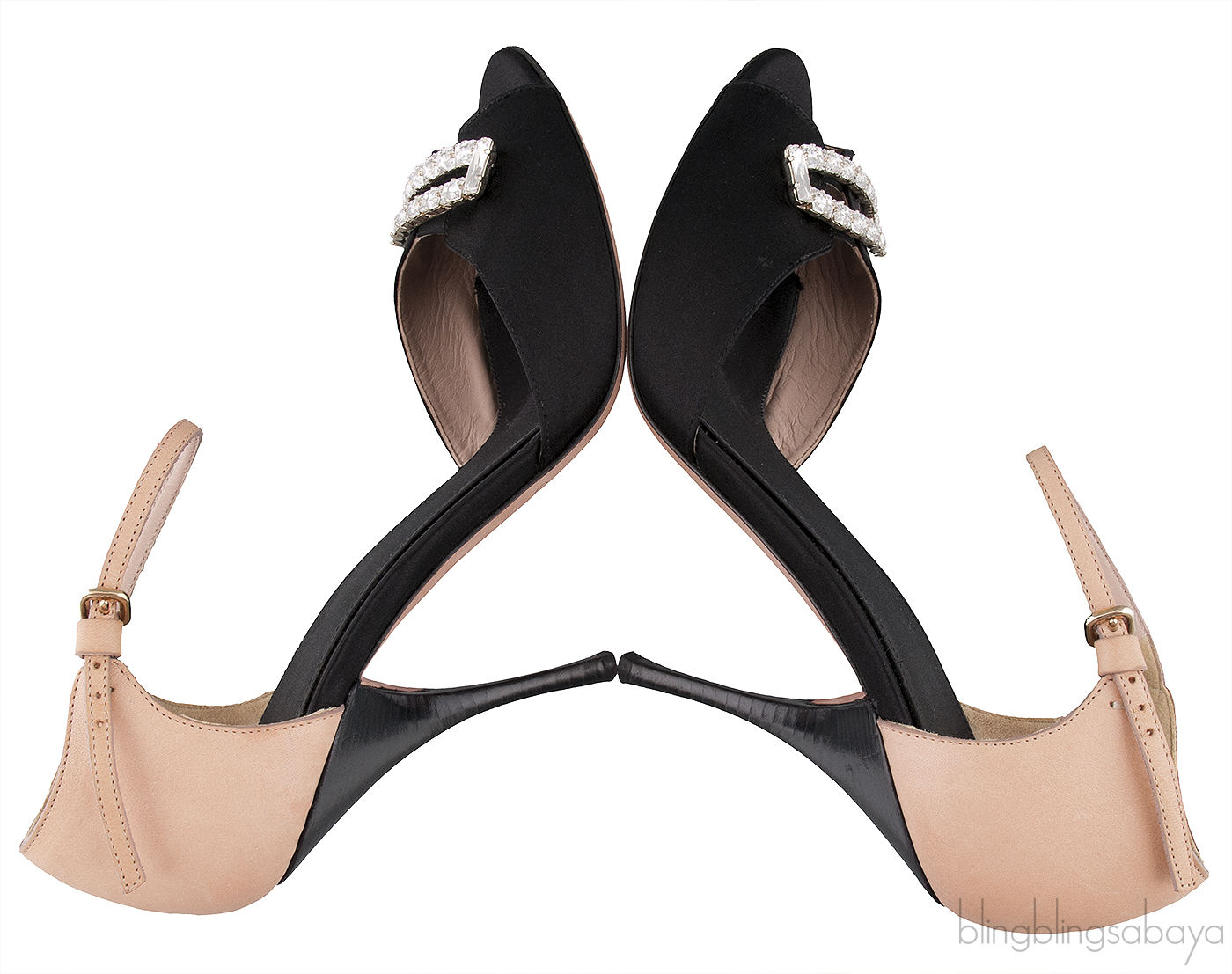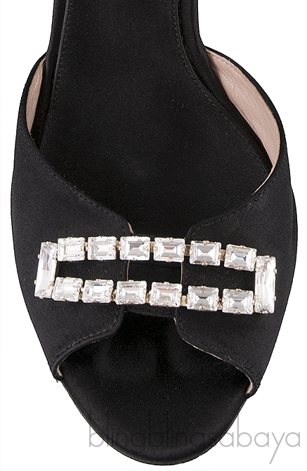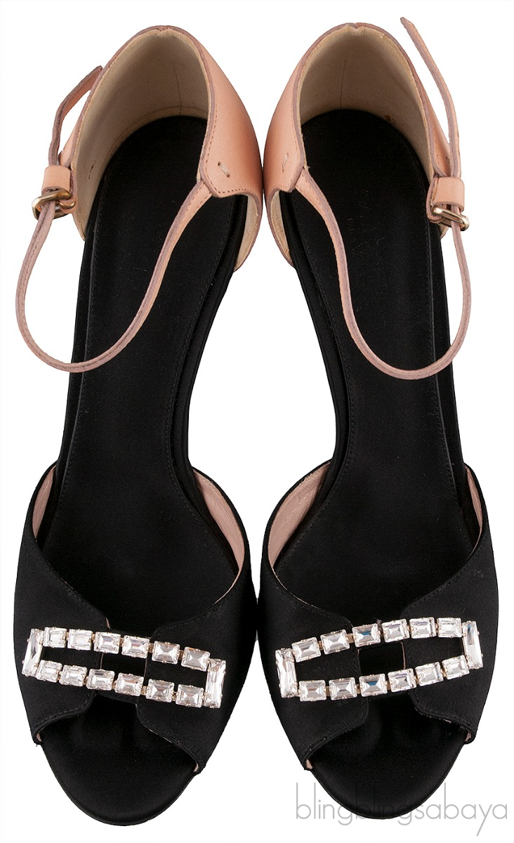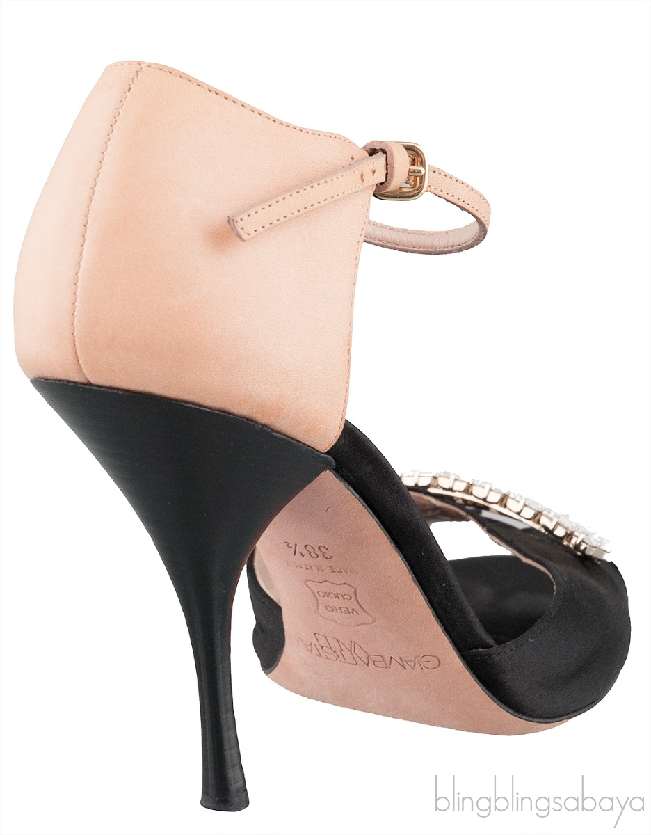 These Crystal Peep Toe Slingback Heels from Giambattista Valli are made of black satin and nude leather upper. These heels features a crystal embellishment at the vamp, peep almond toe, slingback with buckle fastening, leather lined insole and sole and heels measuring 100 mm high.