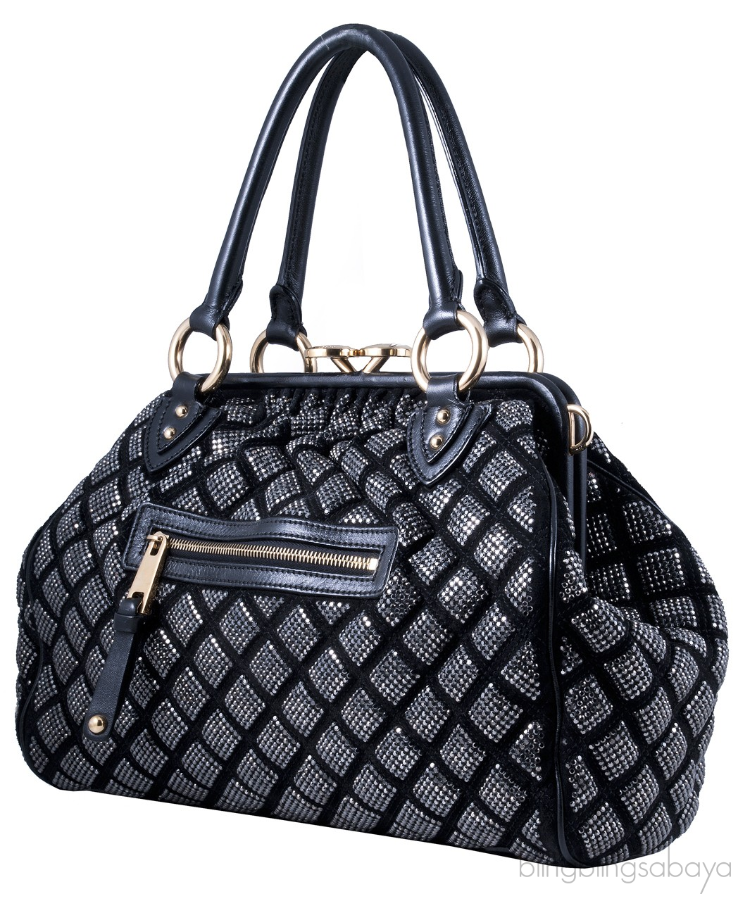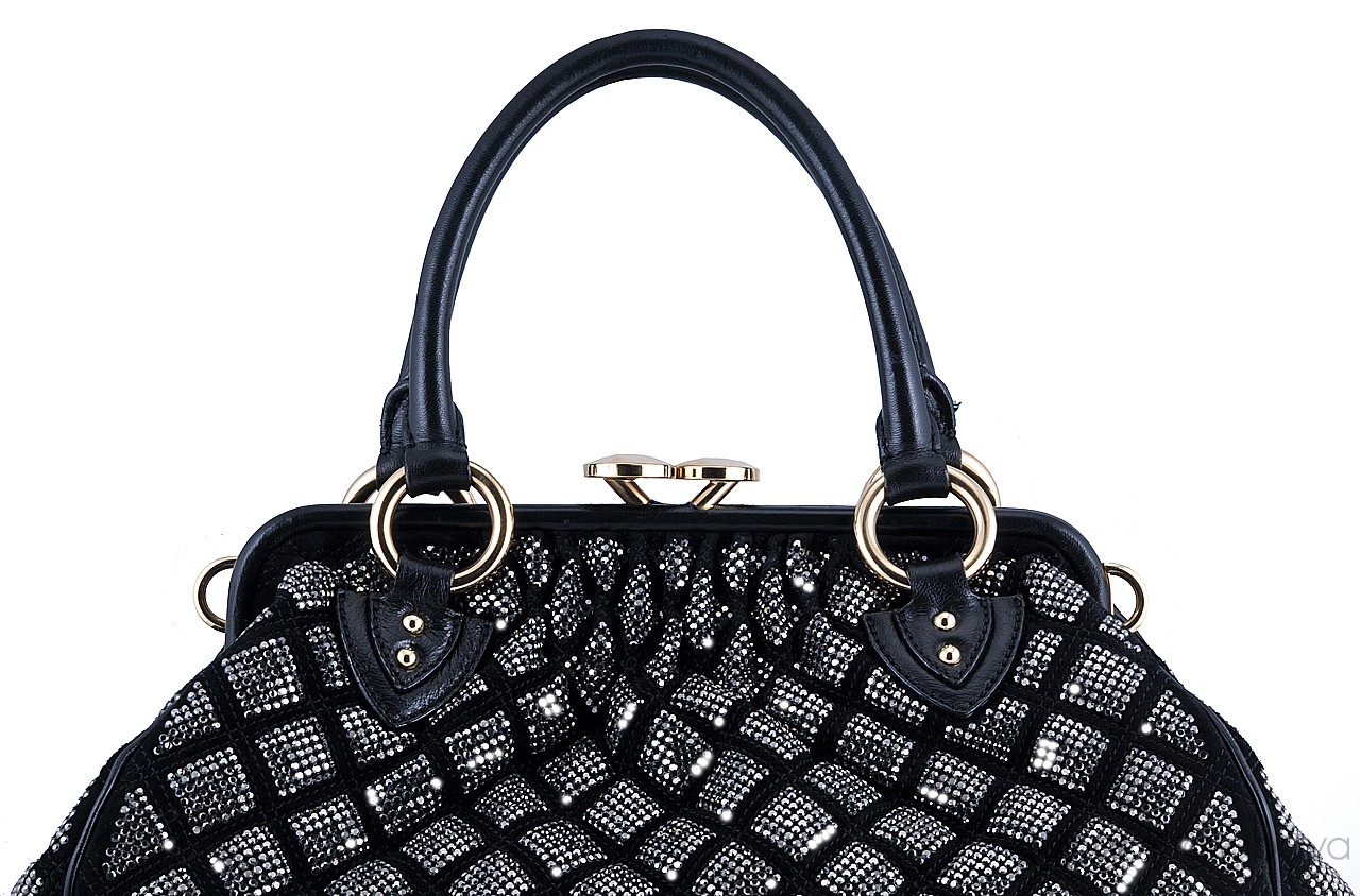 This iconic stam bag from Marc Jacobs features a quilted leather with Swarovski crystal detailing throughout. It has a golden tone hardware and a zip pocket in the front. This Marc Jacobs satchel is sealed with a signature kiss lock, interior is lined with black satin fabric and has one zippered compartment with leather trim.