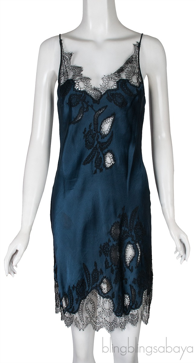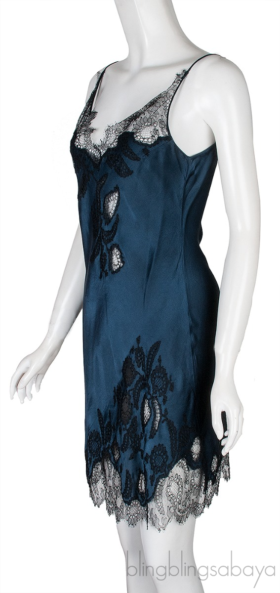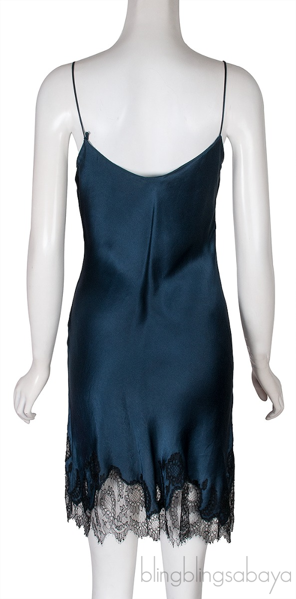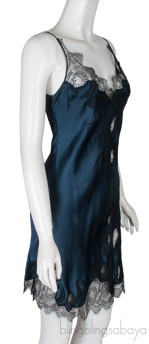 This Dark Blue Lace Trim Cami Sress from Carine Gilson is crafted from 100% Silk fabric in dark blue with black lace trimming, sleeveless, spaghetti strap and lace embellishment at front.