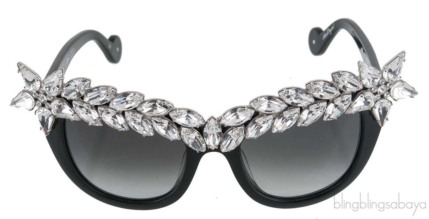 This Decadence Sunglasses from Anna-Karin Karlsson features a cat eye-frame shaped black sunglasses with tinted gradient lenses, dazzling border of Swarovski crystals in star motif. Lens measures 65 mm / Bridge 10 mm / Arm 150 mm