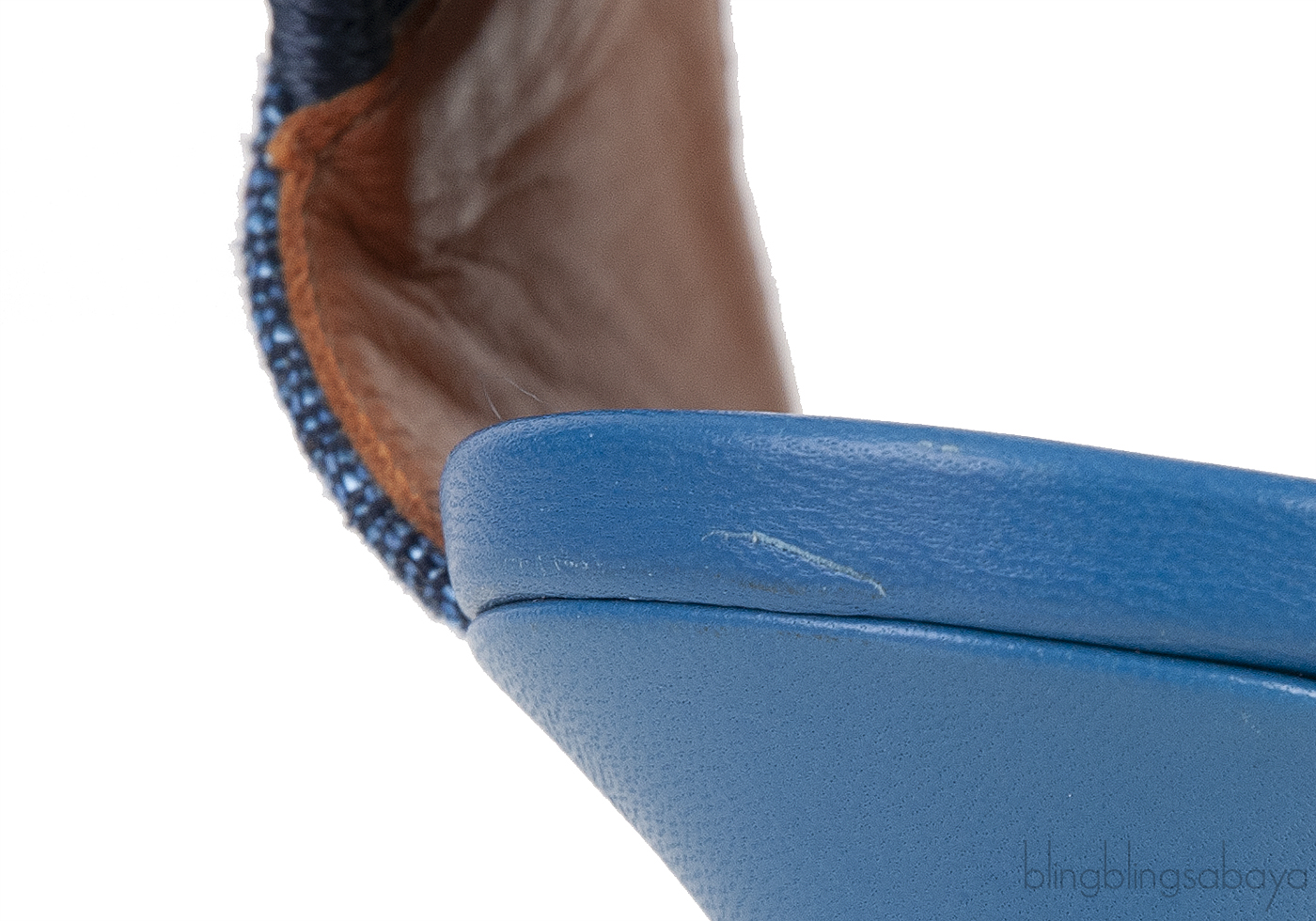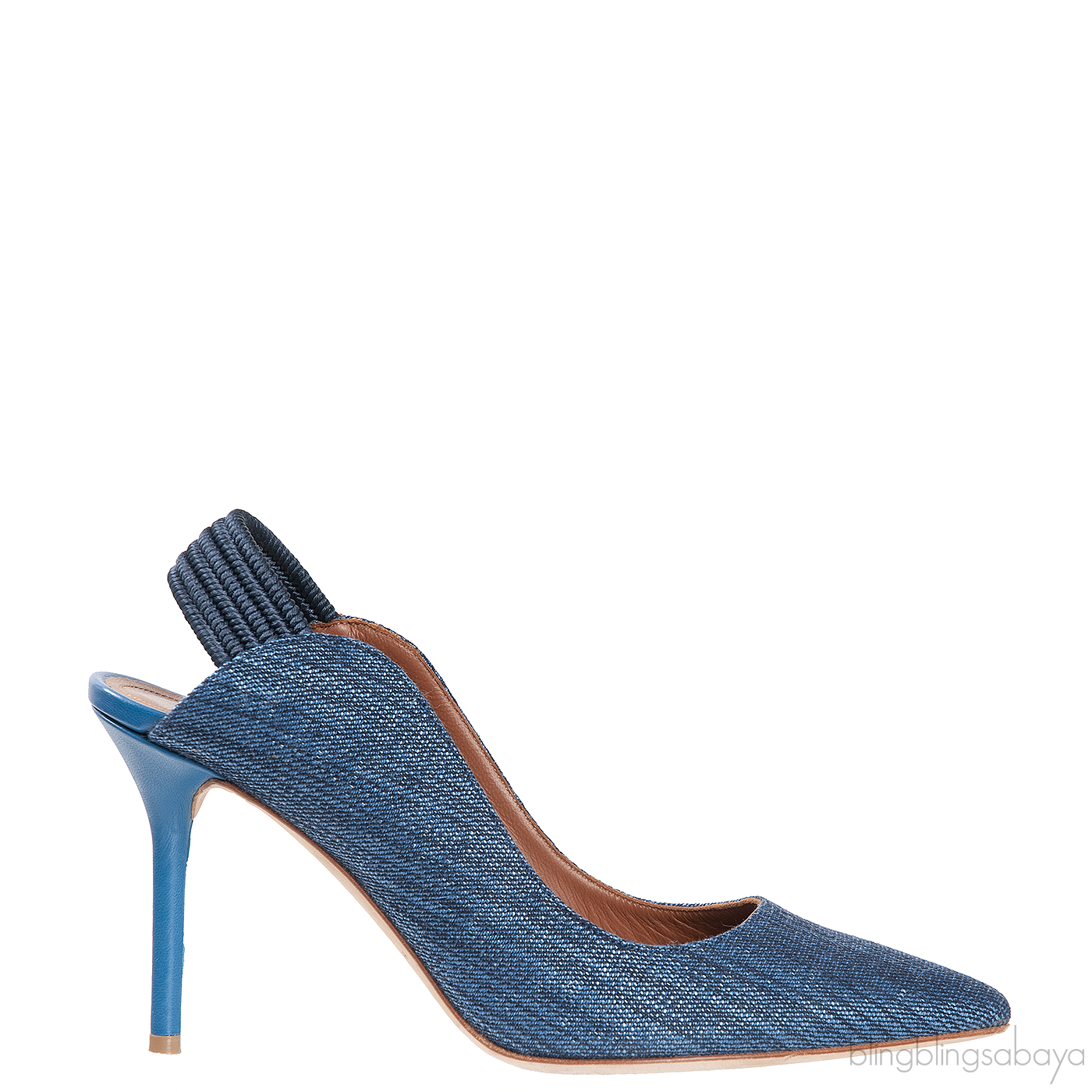 These Denim Pointed Toe Slingback Heels from Malone Souliers are crafted from blue denim upper with brown leather lining. These heels features a pointed toe, plain denim upper, elastic slingback, leather lined insole and heels measuring 90 mm high.