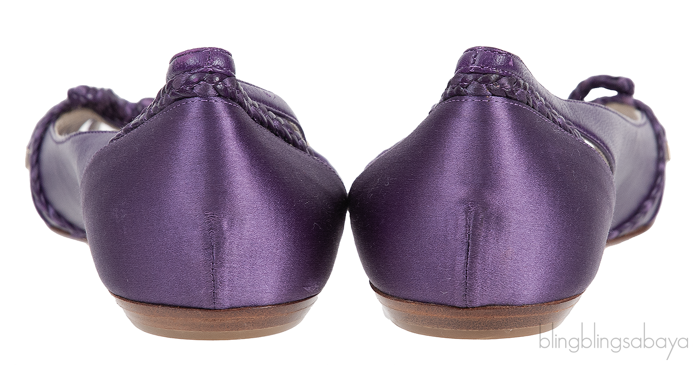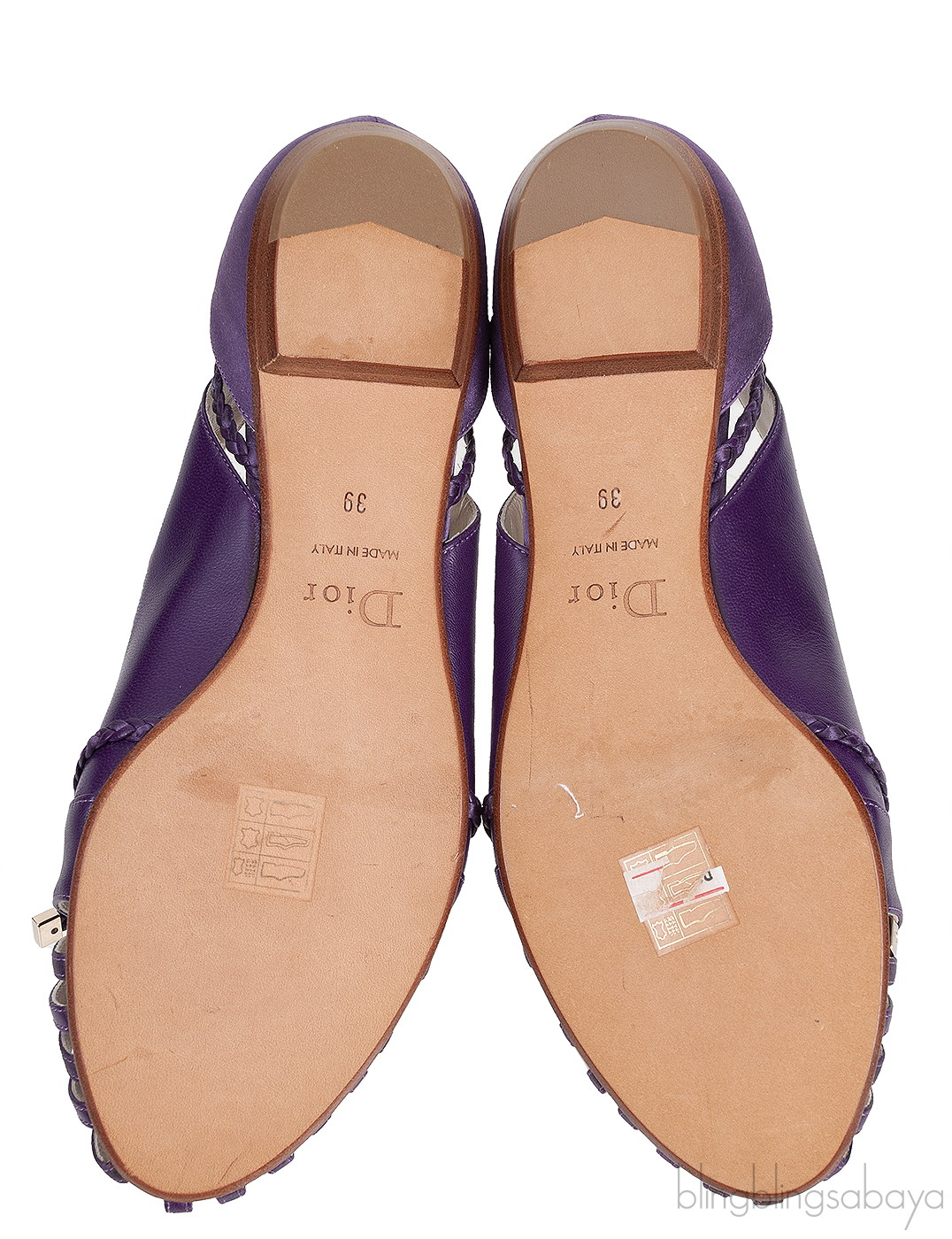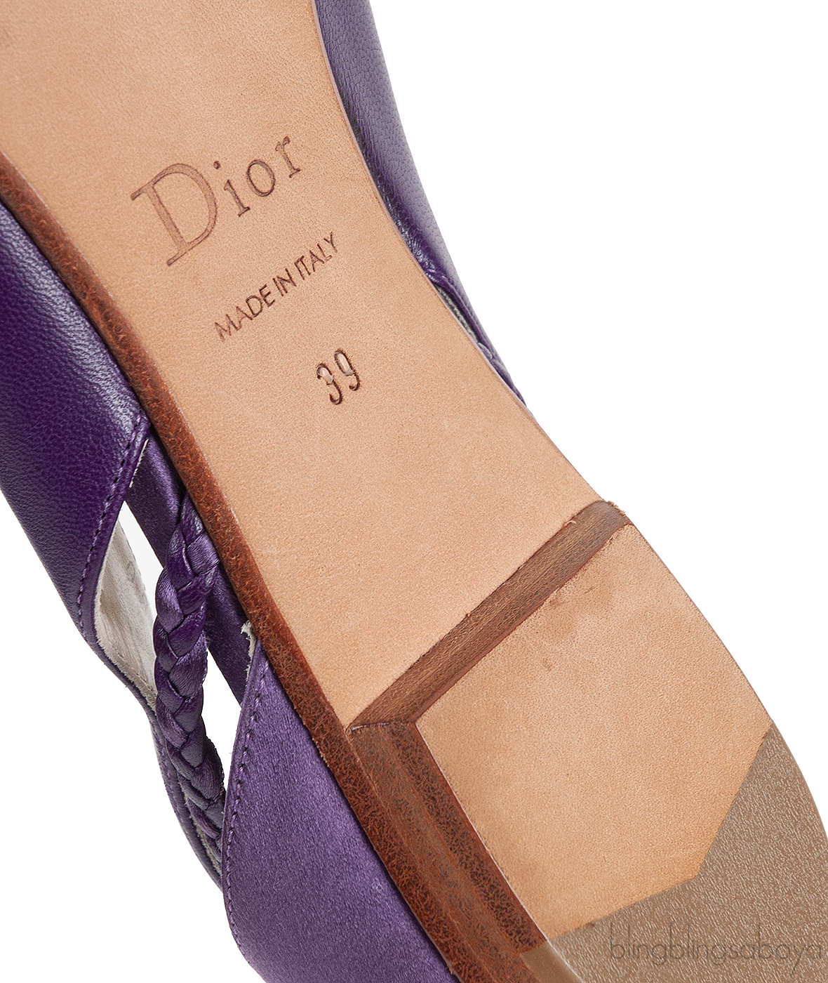 This casual chic Ballet Flat from Christian Dior is crafted in Leather and Purple Satin Fabric. This features a cut-out toes and back with braided satin detailing, braided satin bow on the vamp has C & D charms at the edge. Padded insole with Christian Dior logo2.