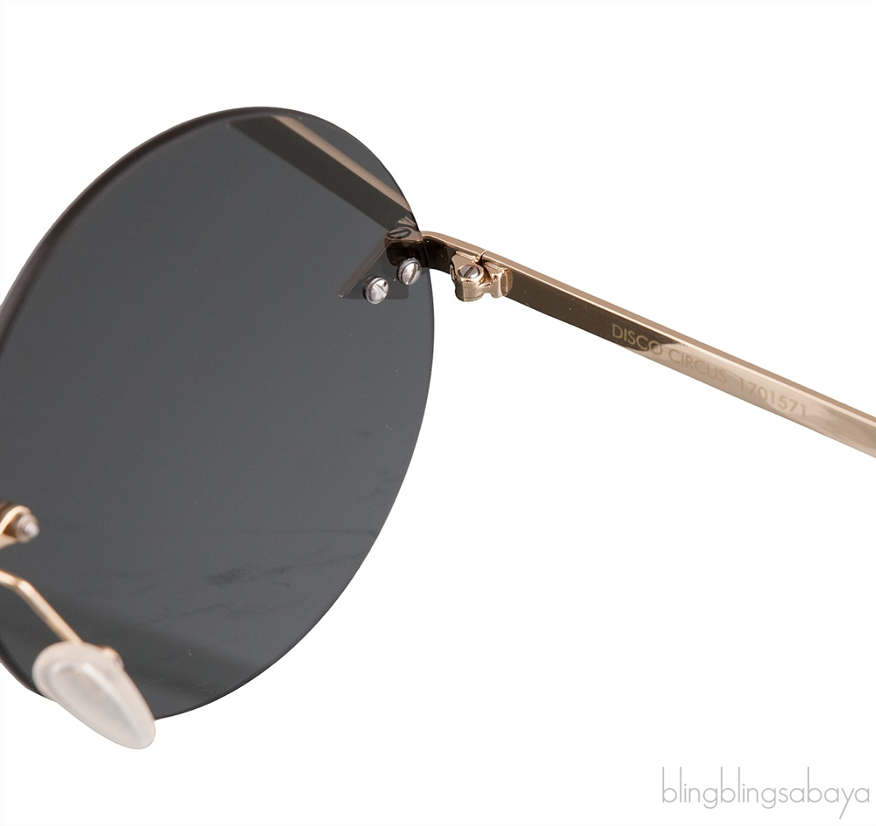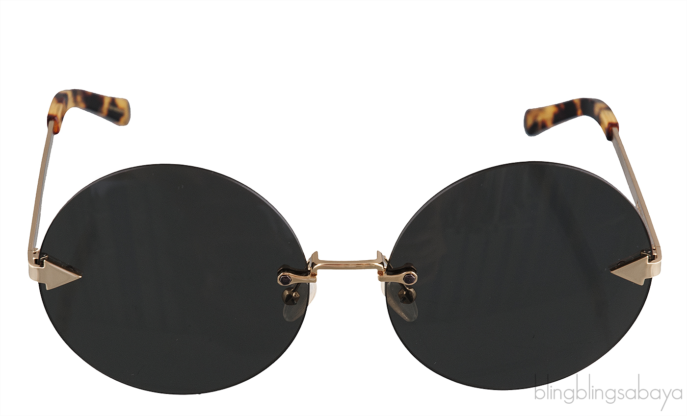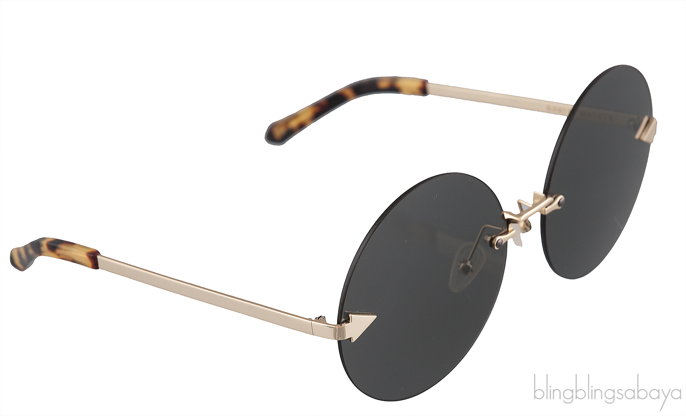 This Disco Circus 1701571 Sunglasses from Karen Walker features a rimless grey tinted round lenses, signature arrow at the temple, gold metal hardware, nose pads, and tortoise acetale temple tip.