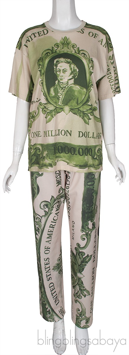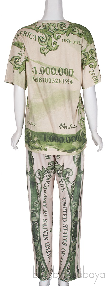These Dollar Print Top & Trouser from Moschino are crafted from 100% Cotton the top, and 100% Polyester the trouser. These pair features a US dollar in off-white and green hue. Top features a round neckline and short sleeves. Trouser features an elastic waist with drawstring fastening, straight cut and side pockets.