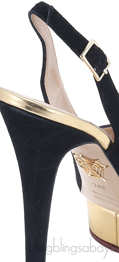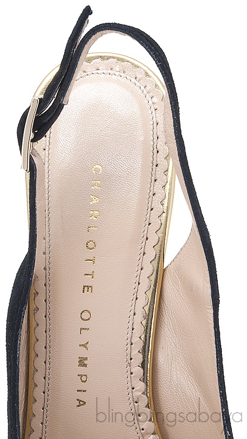 This stunning Dolly Slingback Pump from Charlotte Olympia is done in smooth velvety suede and calf leather. This features a 150 mm covered heels, almond toe, gold patent leather island platform, buckle fastening slingback strap and signature gold web plaque at sole.