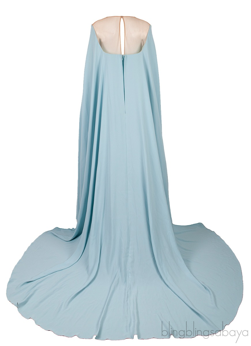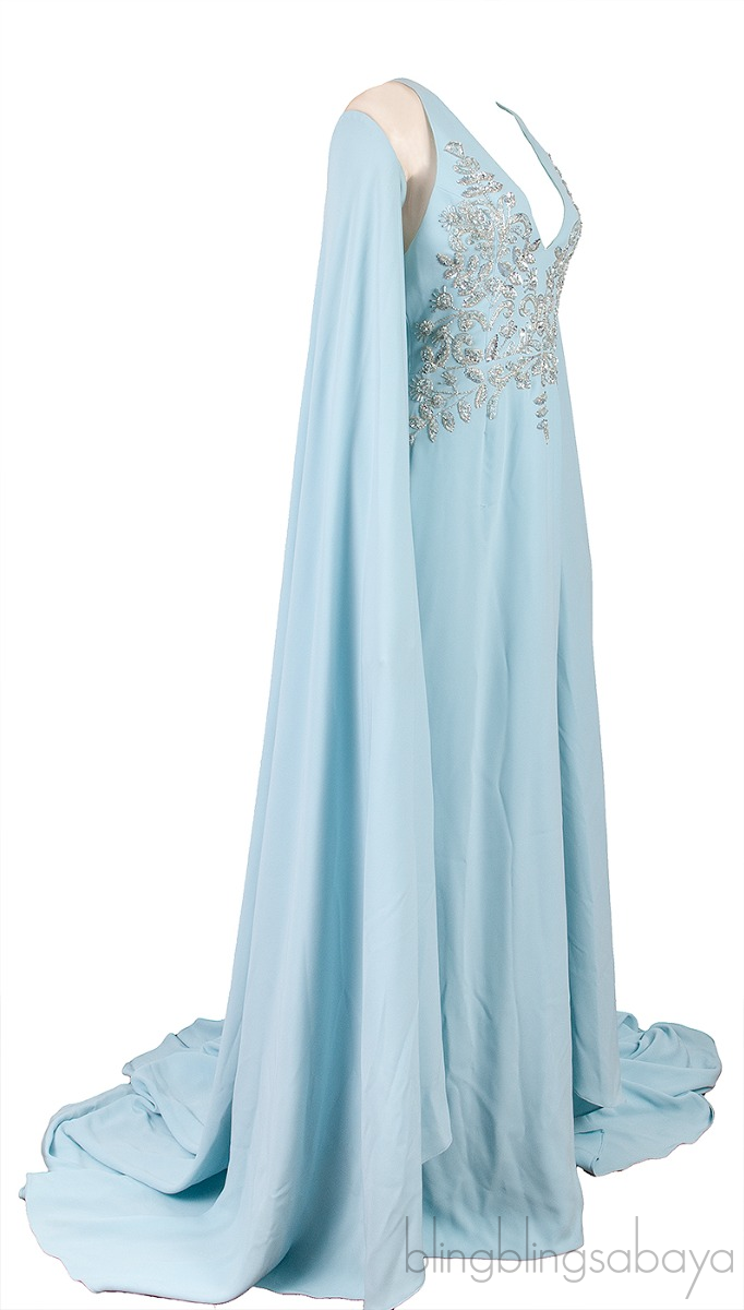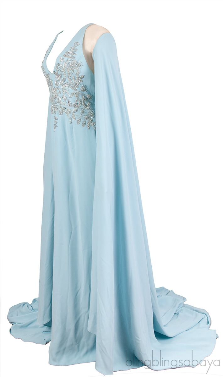 This Light Blue Crystal Embellished Cape Gown from George Hobeika is crafted from 80% Acetate and 20% Viscose. This dress features a v-neckline, mesh detailing at top, cape sleeves, sweep length, chapel train and has bead and sequin embellishment at front.