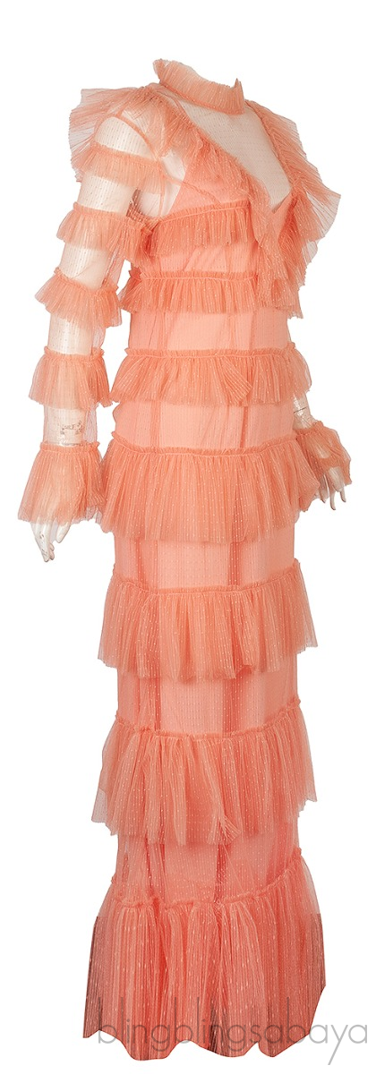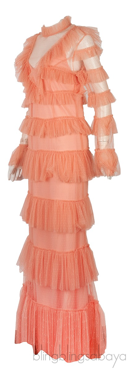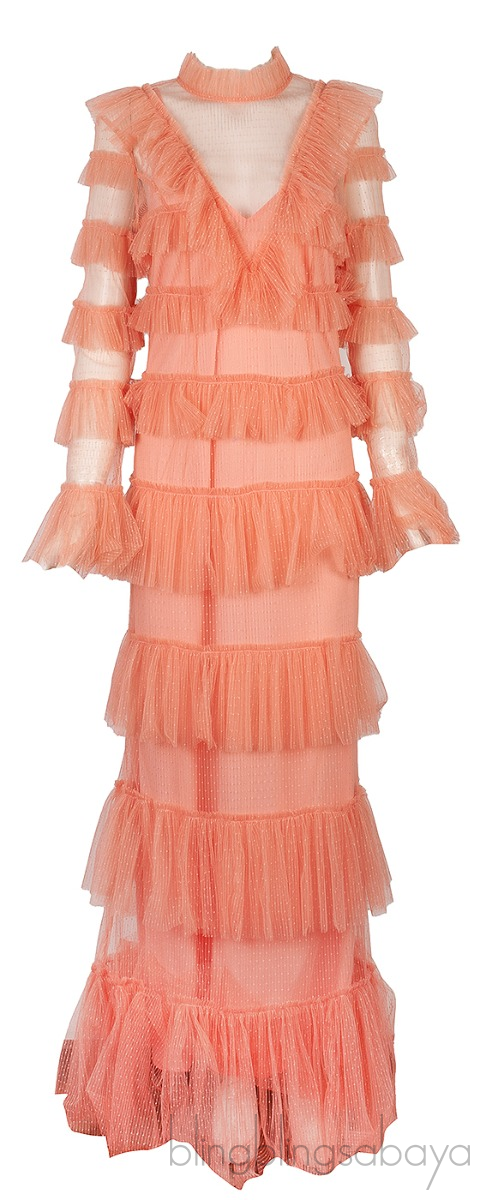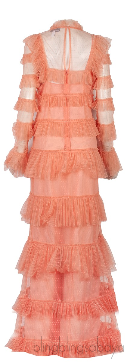 This Dusty-Rose Say Yes Tiered Frill Dress from Alice McCall is crafted from 100% Polyester fabric featuring a high neckline, long sleeves with flared cuffs, frill detail along shoulders, tiered dotted mesh frills, centre-back concealed zip fastening, partial lining and maxi length.