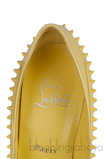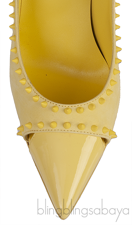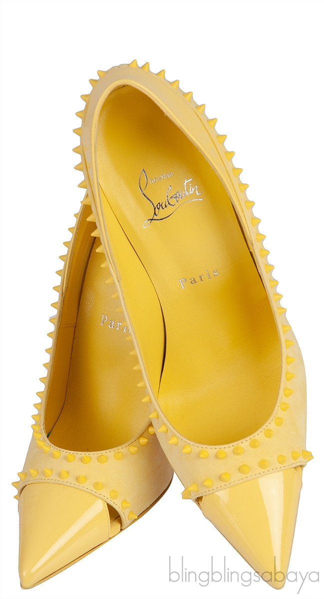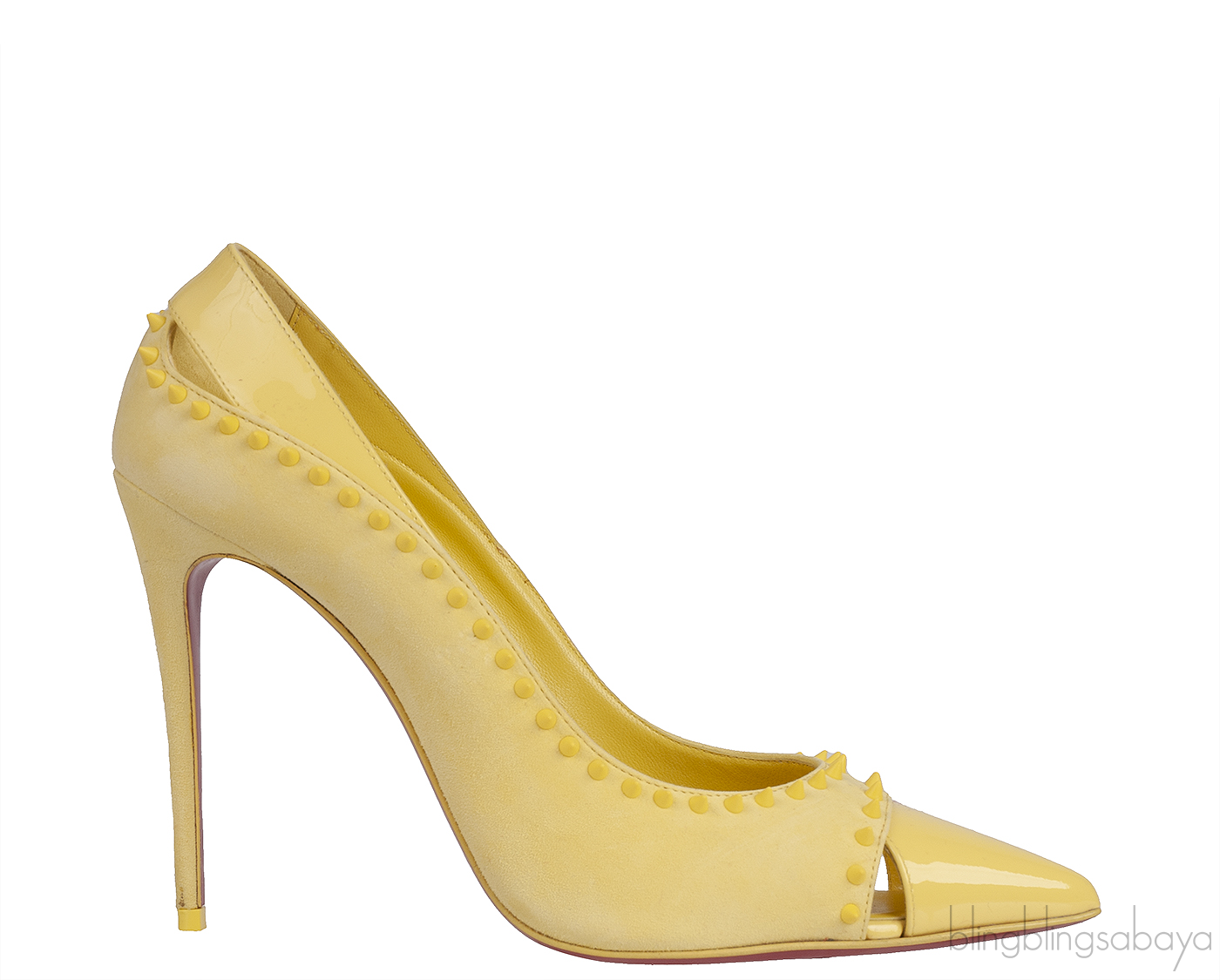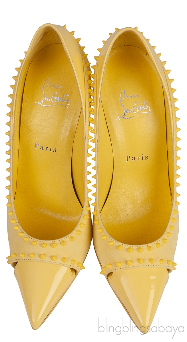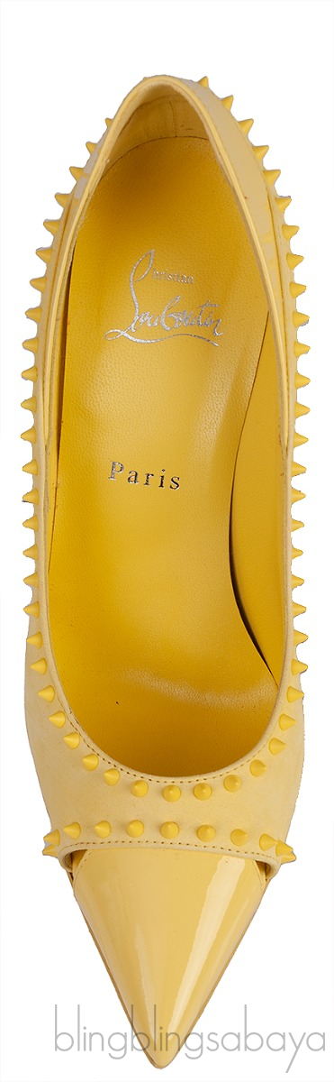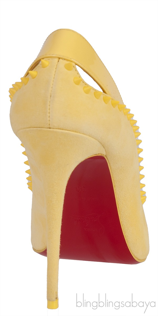 These Duvette Spikes 100 Suede Yellow Pumps from Christian Louboutin are crafted from suede and patent leather with leather lining in fresh and young yellow hue. These heels features a yellow spike trim, cut-out at vamp, pointed toe, leather lined insole, signature red leather sole and sexy stiletto heels measuring 100 mm high.