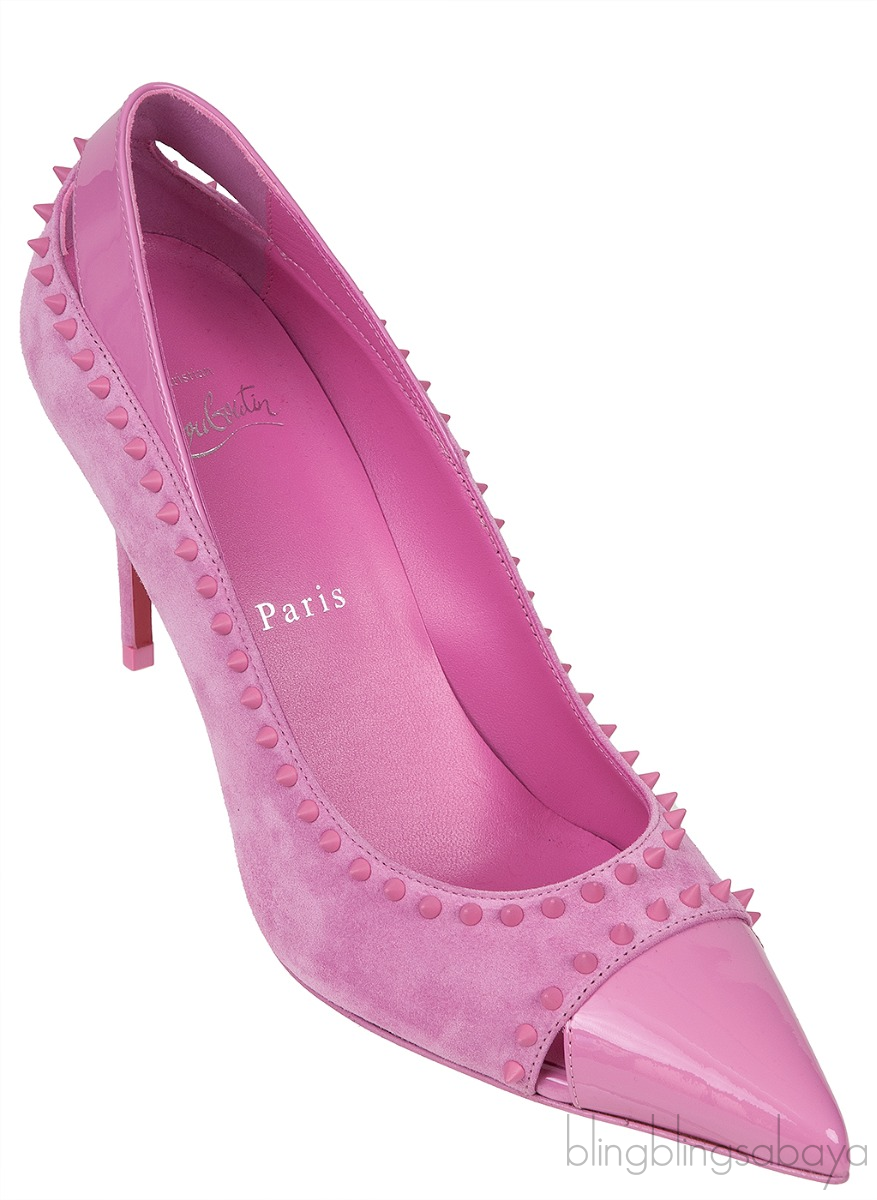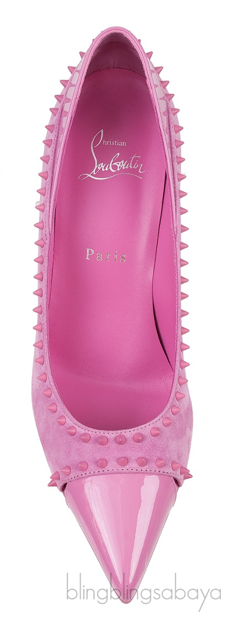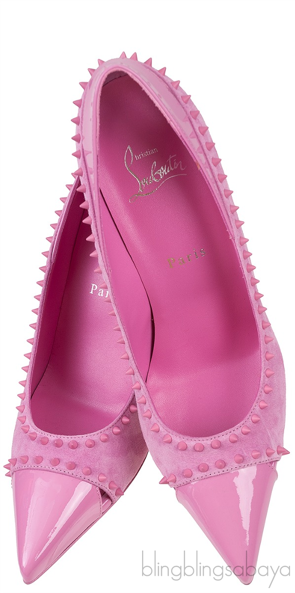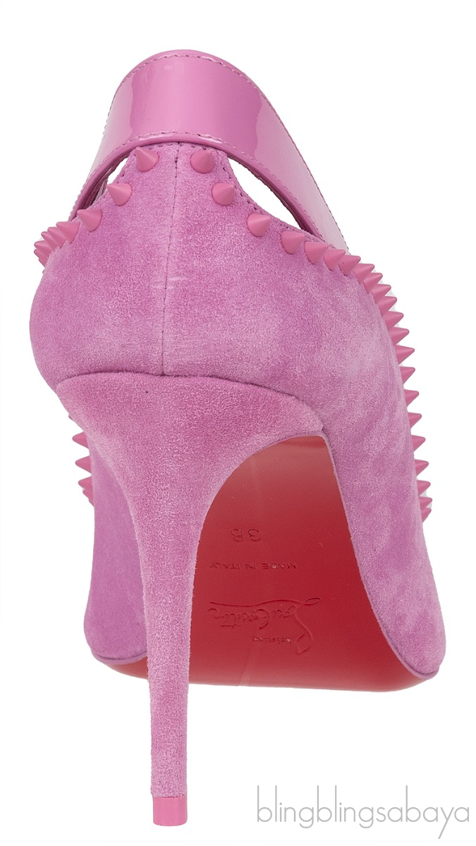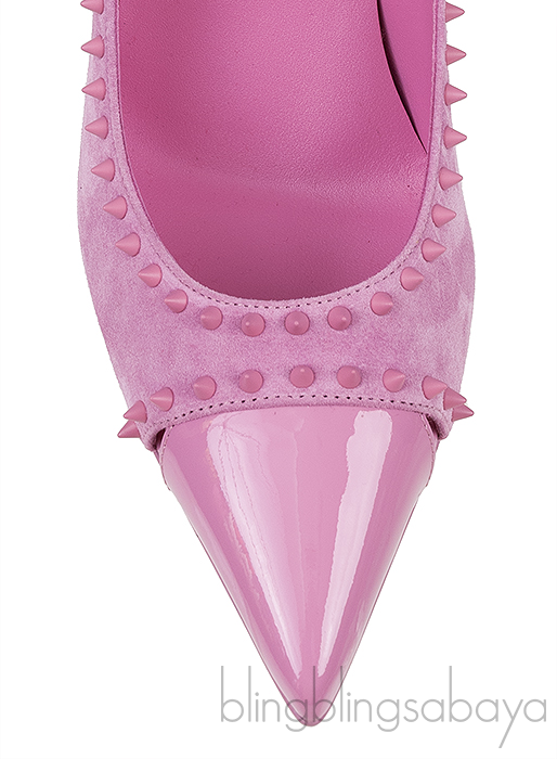 These Duvette Spikes 85 Suede Pink Pump from Christian Louboutin are crafted from suede and patent leather with leather lining in pretty pink hue. These heels features a pink spike trim, cut-out at vamp, pointed toe, leather lined insole, signature red leather sole and sexy stiletto heels measuring 85 mm high.