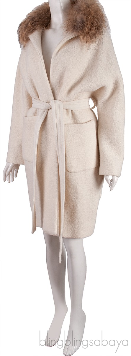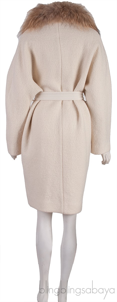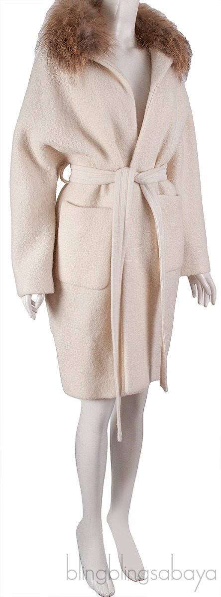 This Ecru Lady Coat Fur Collar from Ba&sh is crafted from ecru thick fabric featuring a fur collar, open fron, patch pockets, long sleeves and fabric belt to cinch the waist.
