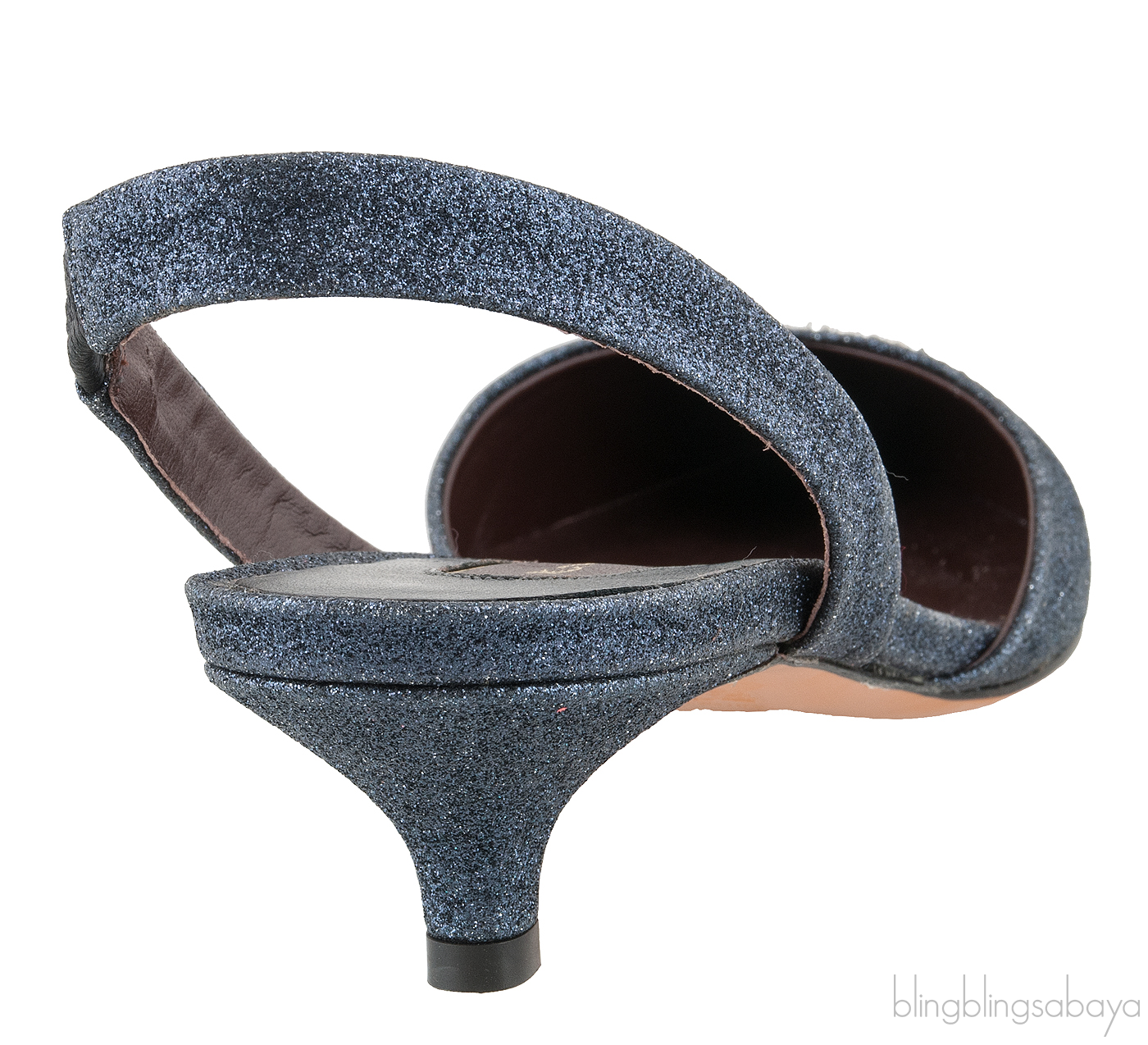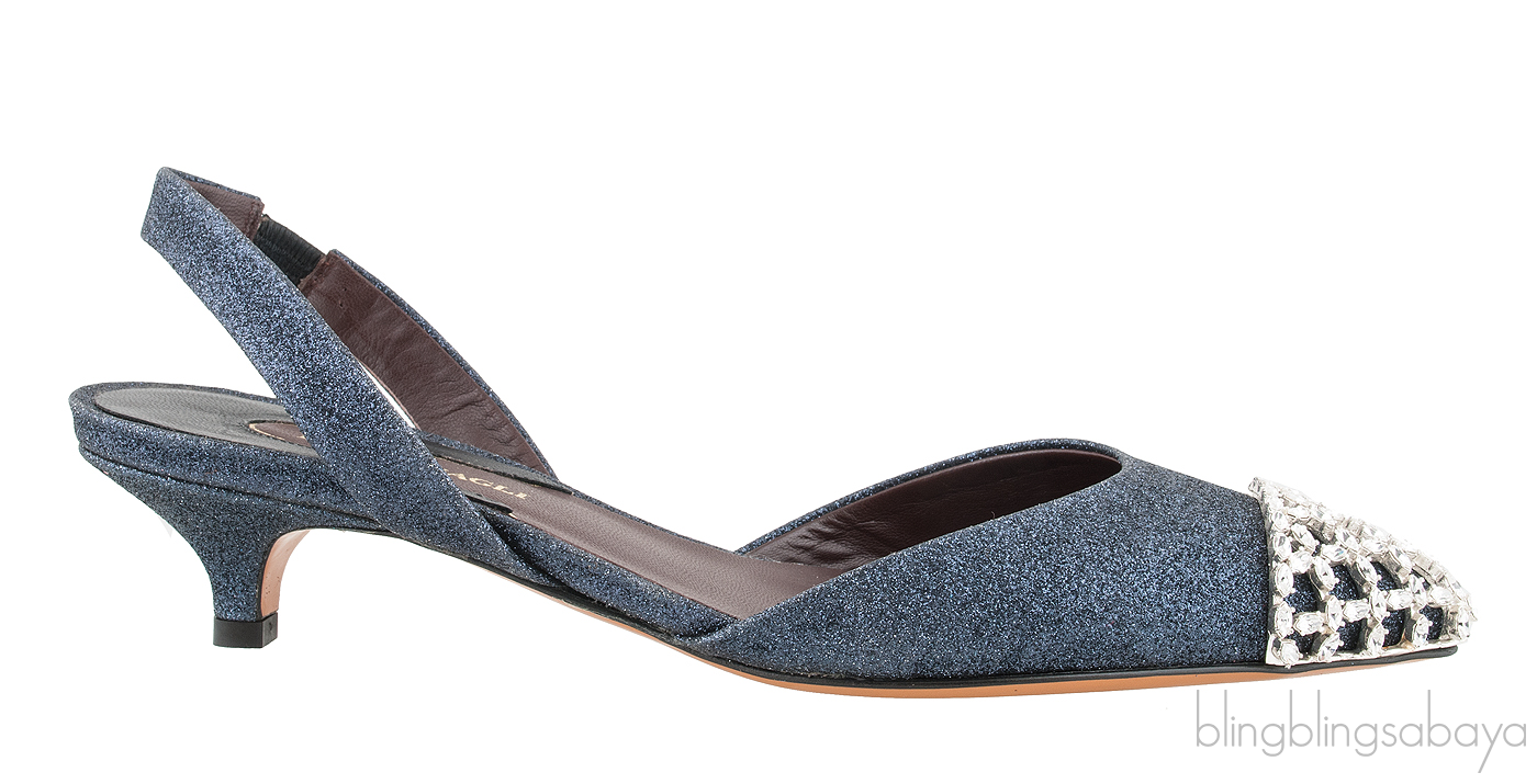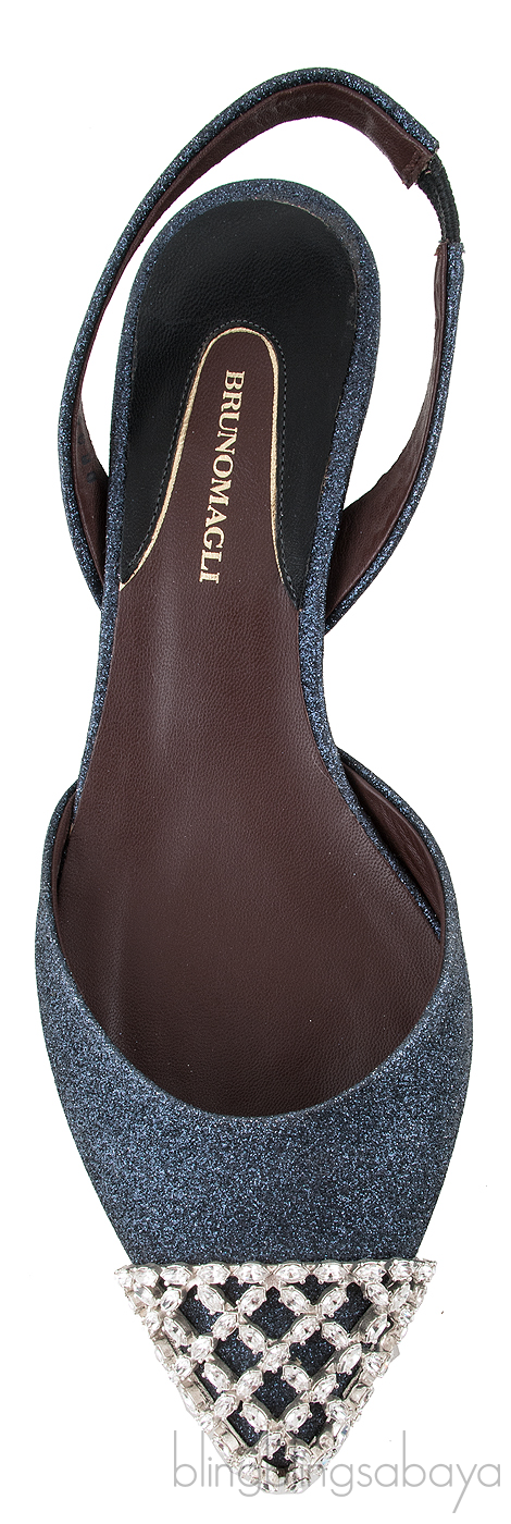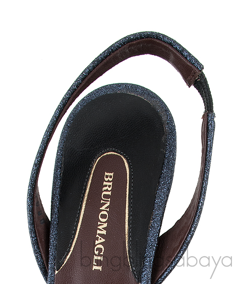 These Efia Blue Grey Glittered Crystal Toe Sandals from Bruno Magli are crafted from blue grey glittery upper with dark brown leather featuring a slightly pointed tow with crystal cap, slingback, mini kitten heels measuring 50 mm and brown leather sole.