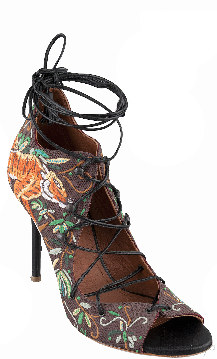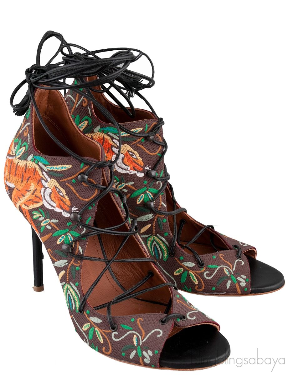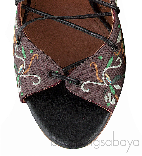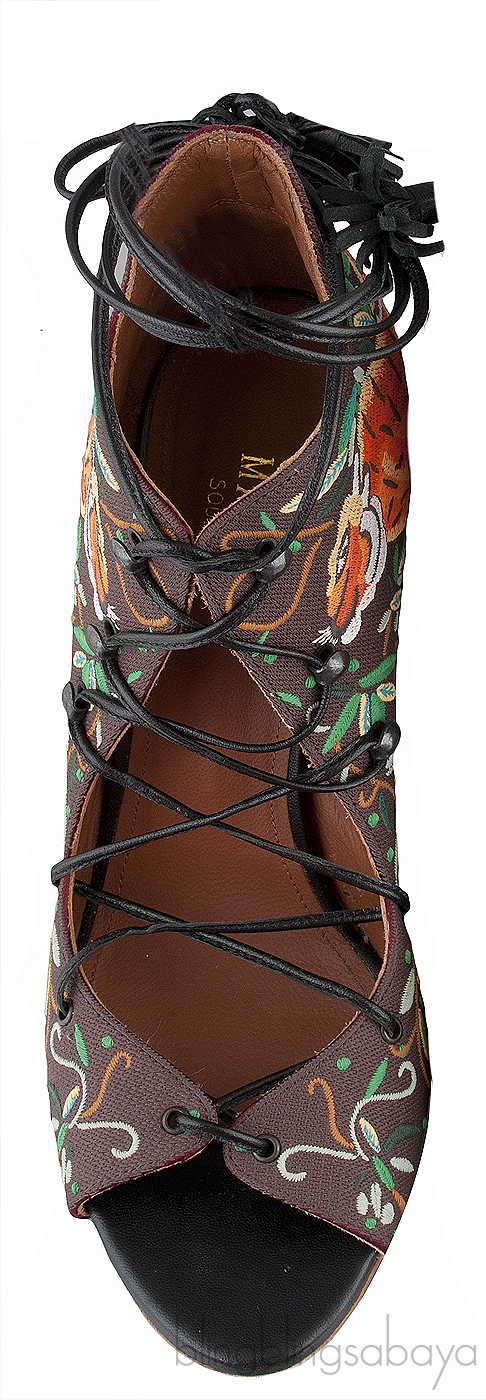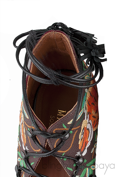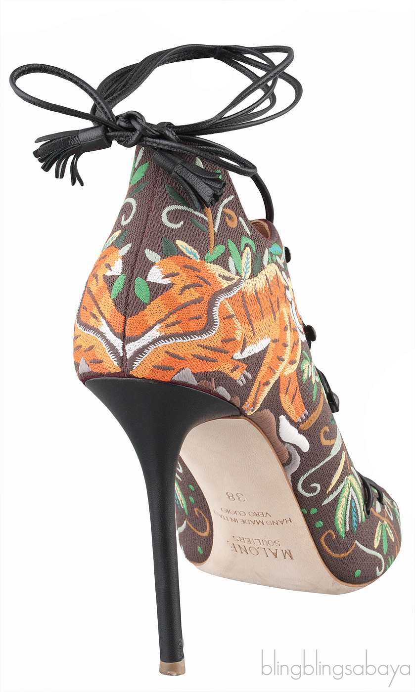 This Embroidered Lace Canvas Sandals from Malone Souliers is crafted in brown canvas upper with brown leather lining.These sandals features a multi-color embroider. lace-up front. peep almond toe, leather lined insole and black stiletto heels measuring 100 mm high.