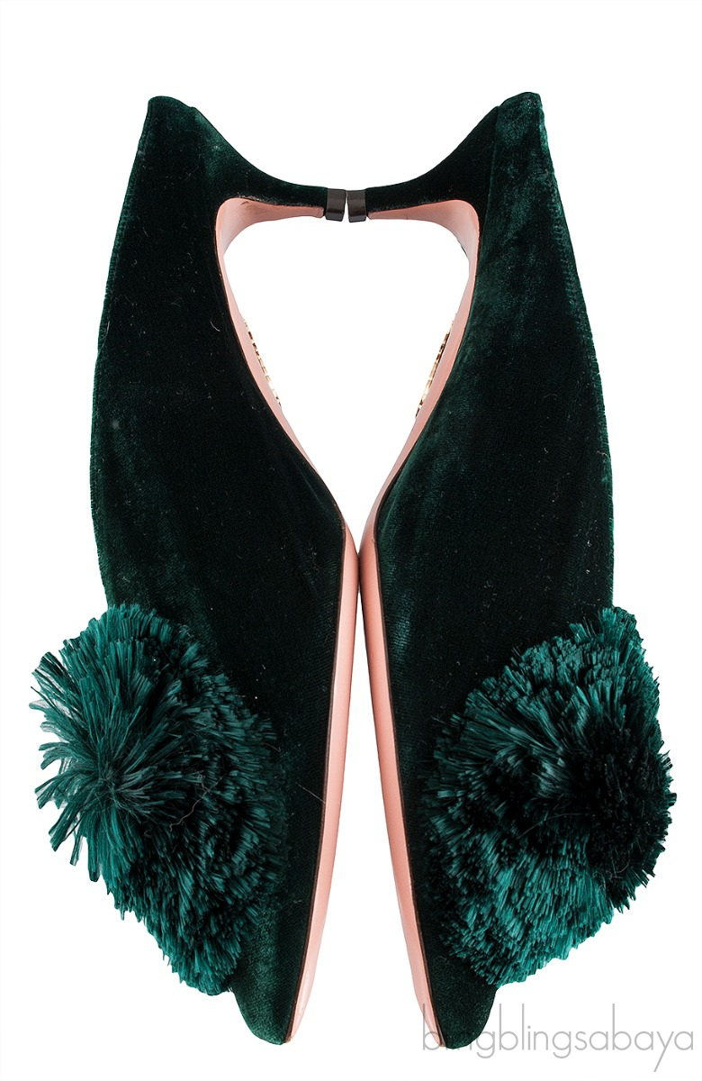 This Emerald Green 45 Velvet Mules from Aquazzura is crafted from Emerald green velvet fabric upper with nude leather lining. This mule features a leather lined insole and sole, pointed toe with pompom detailing at vamp and mini kitten heels measuring 45 mm high.