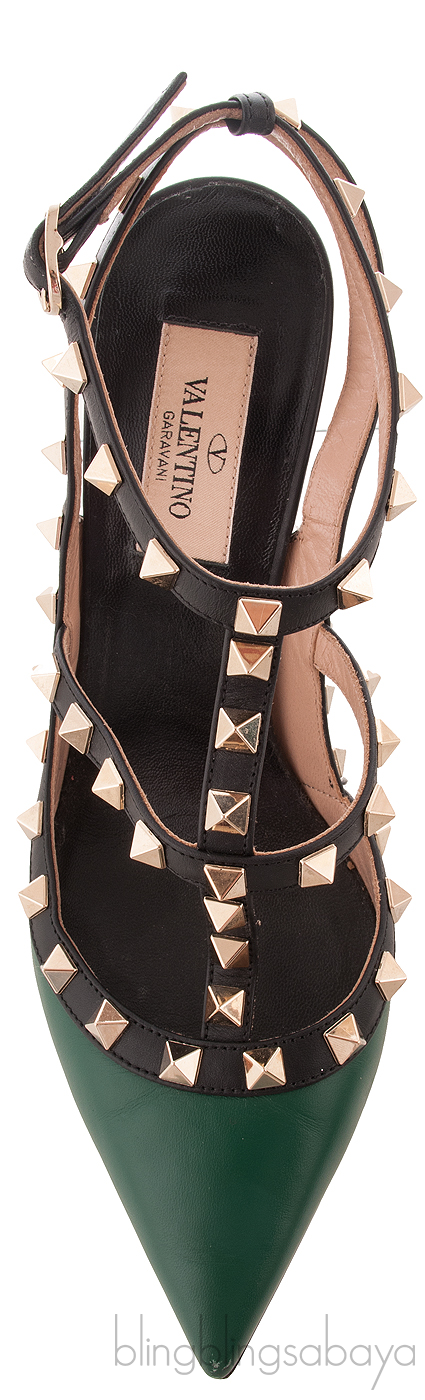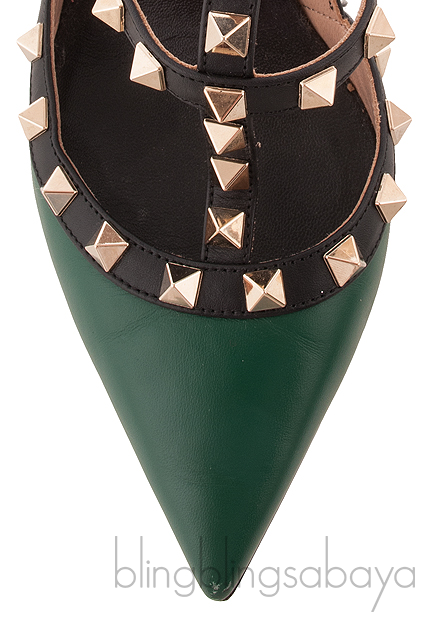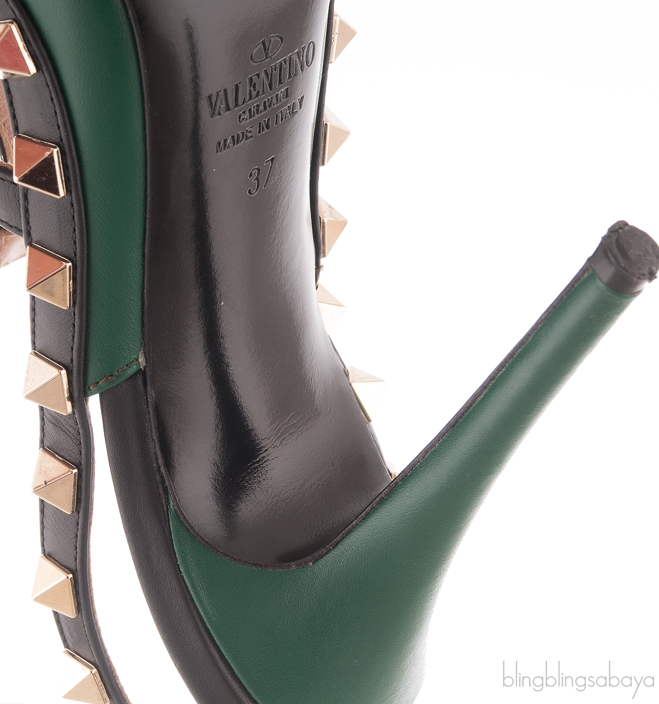 This extravagant Emerald Green Rockstud Heels Heels from Valentino are crafted in matte emerald green Leather with black leather trimming and strap. This stunning pump has the hand-applied and galvanized pyramid studs giving the shoes a rock & funky look. It has a pointed toe, a golden buckle fastening ankle strap, brand embossed insole and black covered heel measuring 100 high.