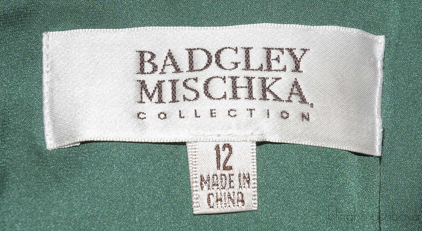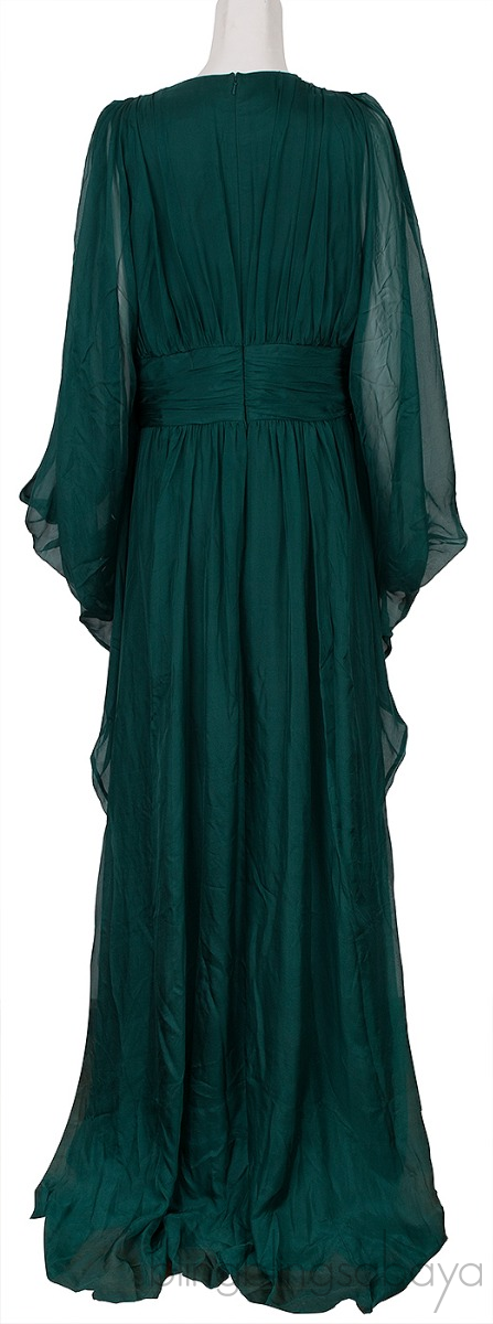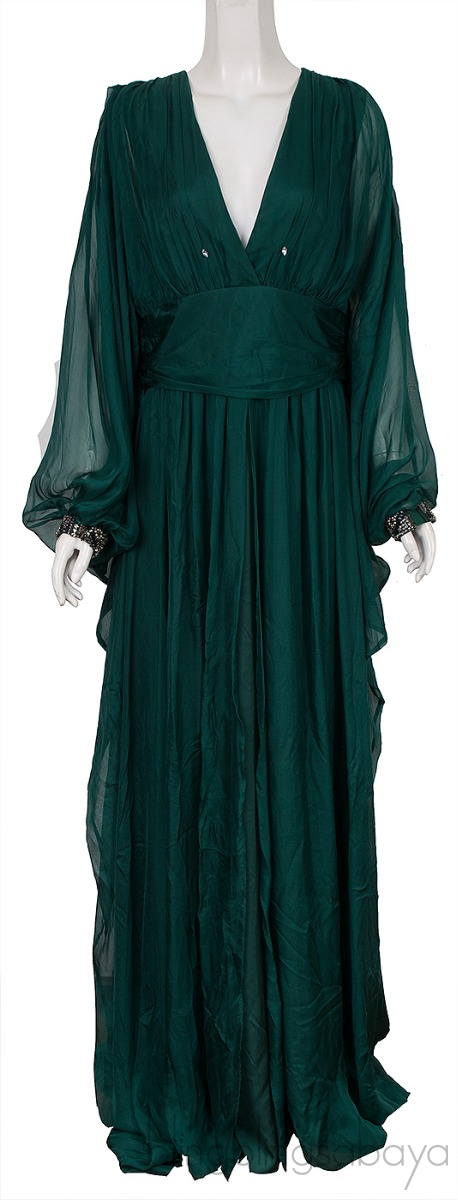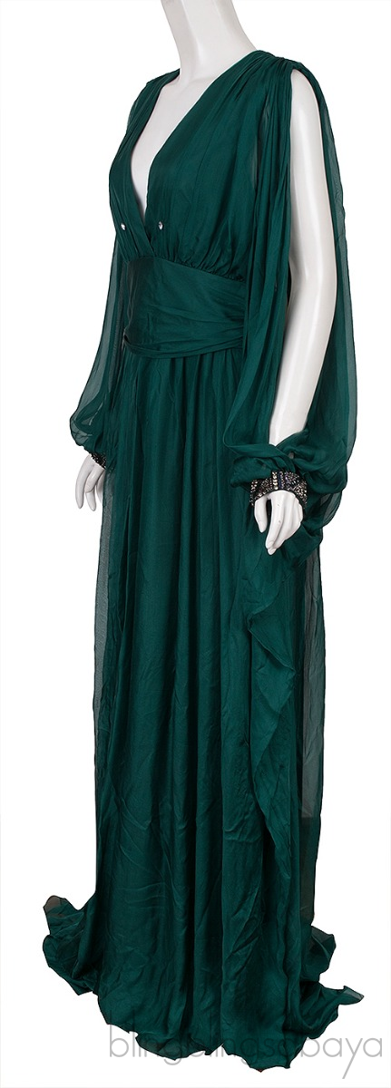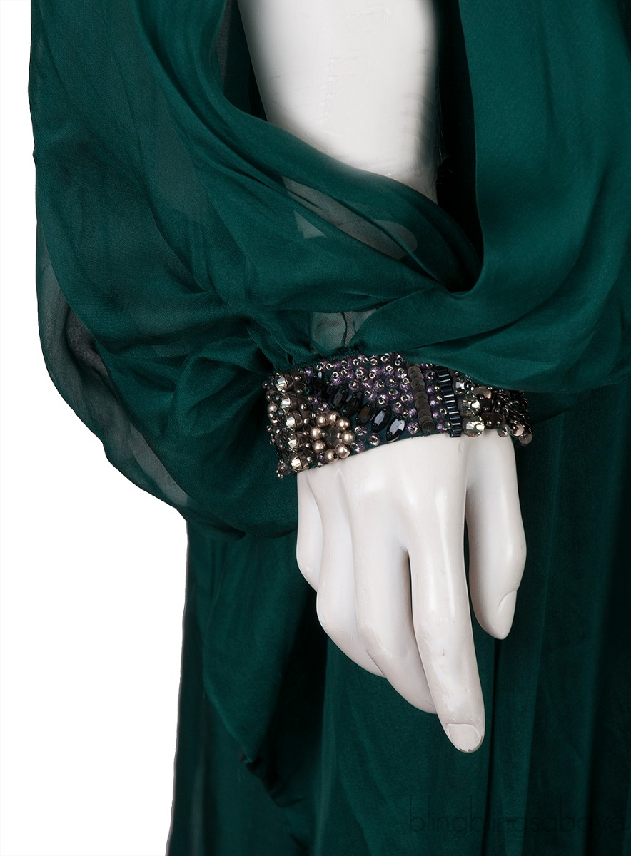 This Emerald Green Maxi Dress from Badgely Mischka is crafted from 100% Silk; Lining 97% Polyester, 3% Spandex in dark emerald hue. This dress features a deep v-neckline, gathered front ,batwing sleeves with open shoulder, beads embellished cuff sleeves, maxi length and zip closure at rear.