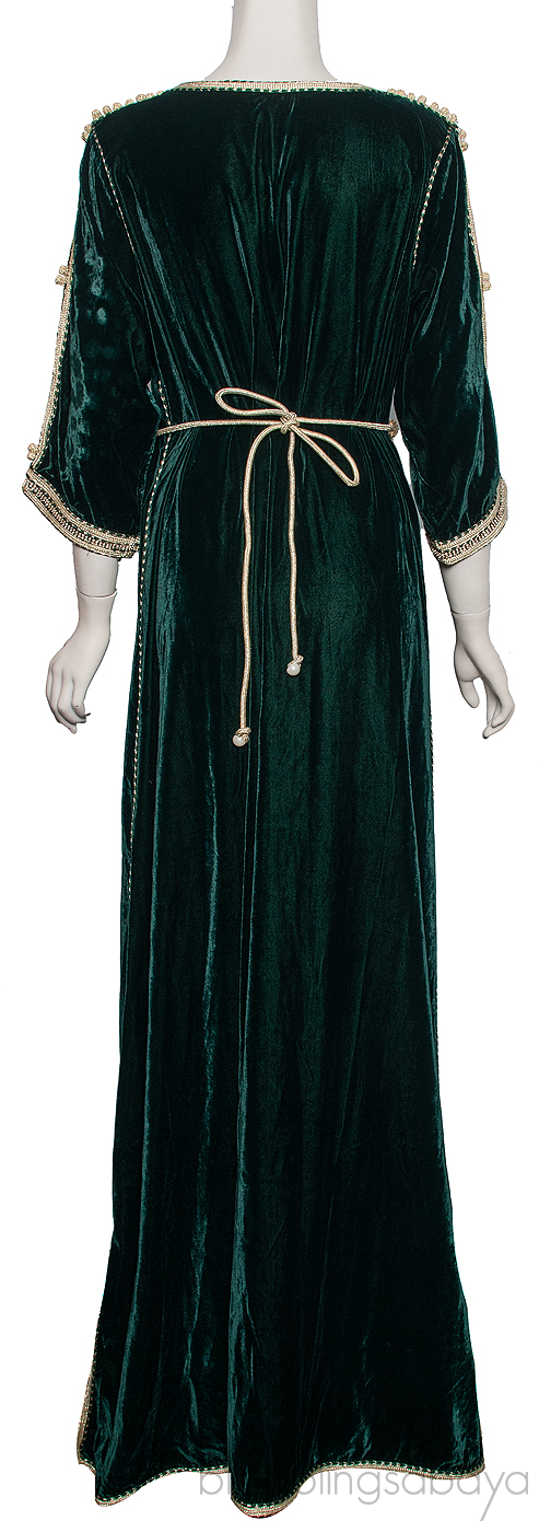 This Emerald Green Velvet Crystal Jalabiya is made of emerald green velvet fabric with metallic light golf trimming. This jalabiya dress features a round neckline, third quarter sleeves, crystal embellishment at front, hand cuffs and hemline, and maxi length. This stunning dress includes floral crystal and beads belt.