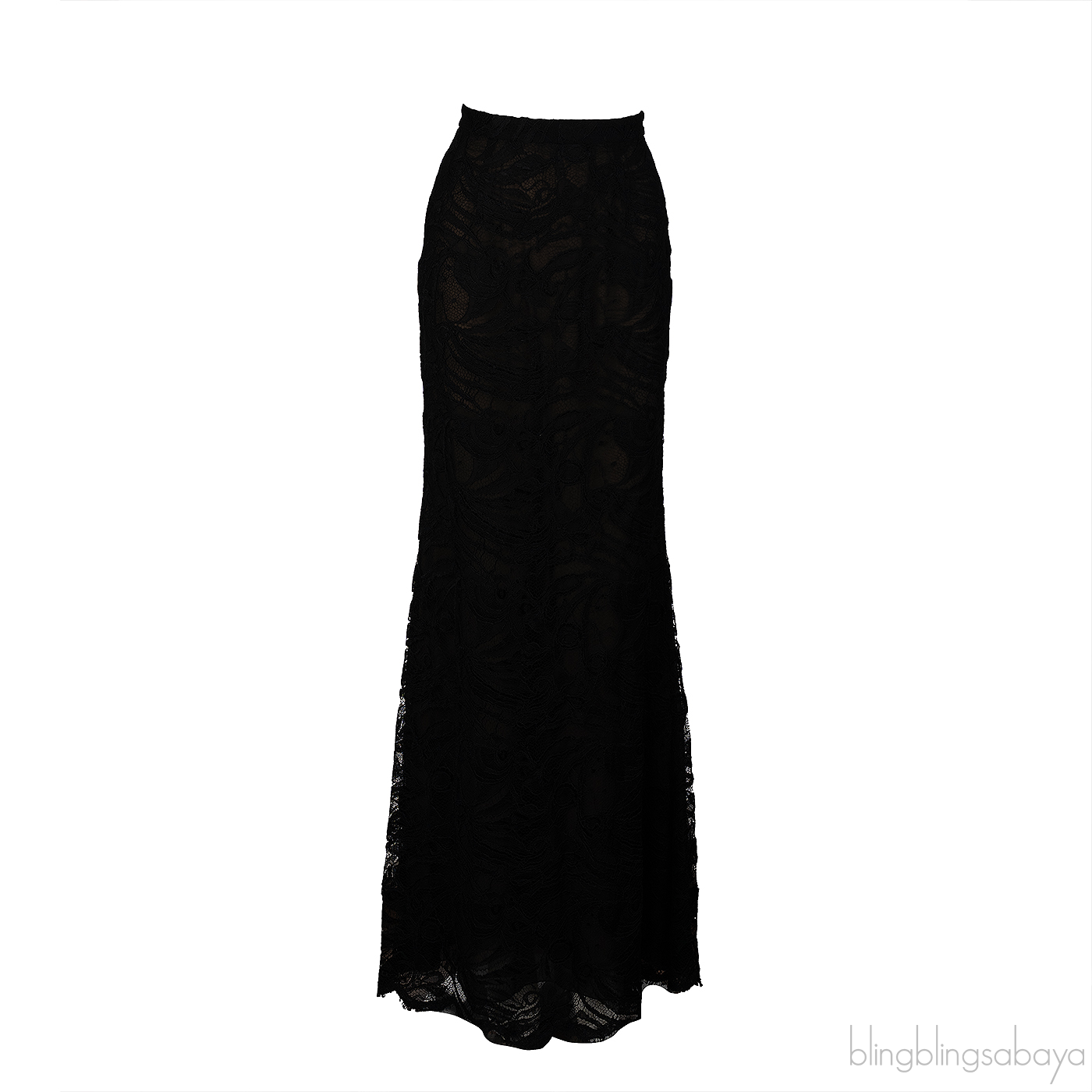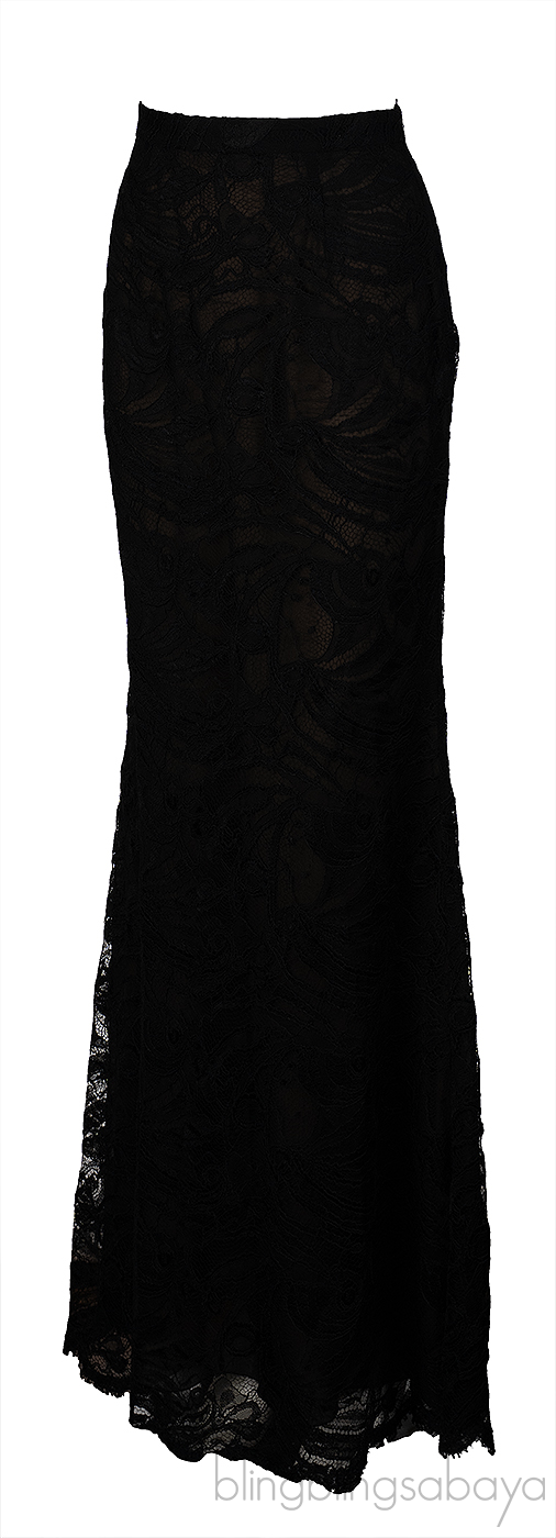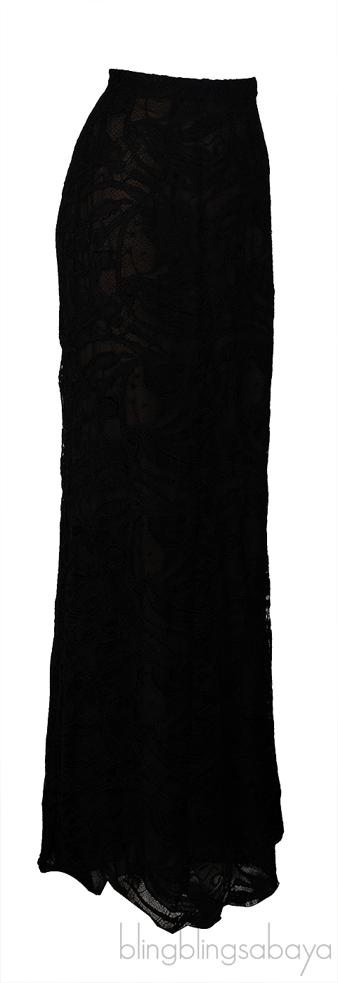 The coordinating black maxi skirt is crafted from 75% viscose and 25% polyamide, designed with a floral lace overlay and nude lining for subtle contrast. It features a discreet side zip fastening and a graceful floor-length silhouette.