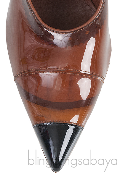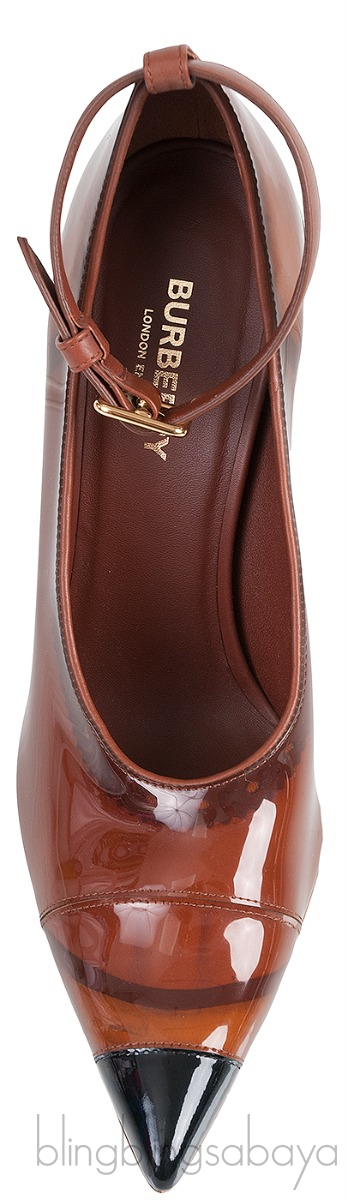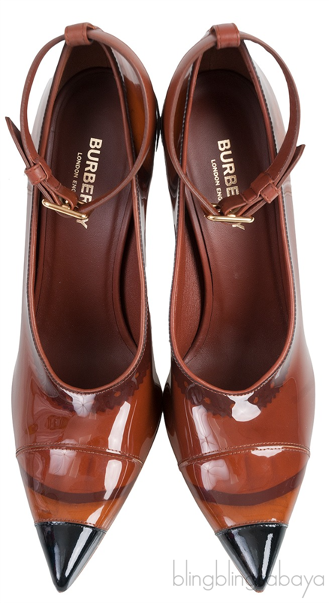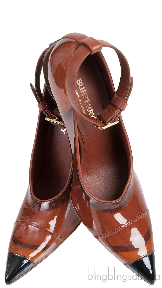These Evan 105 mm Patent Leather Pumps from Burberry are crafted from Brown PVC upper and leather lining. These stunning heels features a leather lined insole and sole, black cup pointed-toe, ghillies print trim along collar, brown leather slingback with gold buckle fastening, and curved heels measuring 105 mm high.