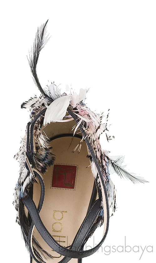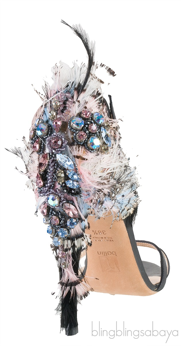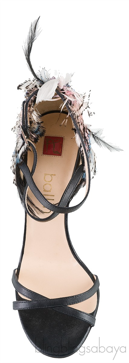 These Feather Detail Sandals from Ballin is crafted from black upper with nude leather lining. These heels features a criss-cross straps at vamp, open toe, slingback with silver fastening, leather lined insole, multi-color feather and crystal detailing on the heel counter, leather lined sole and feather covered heels measuring 110 mm high.
