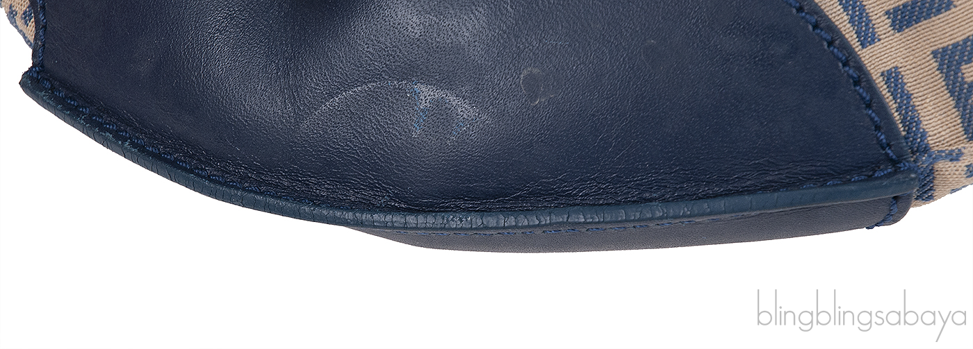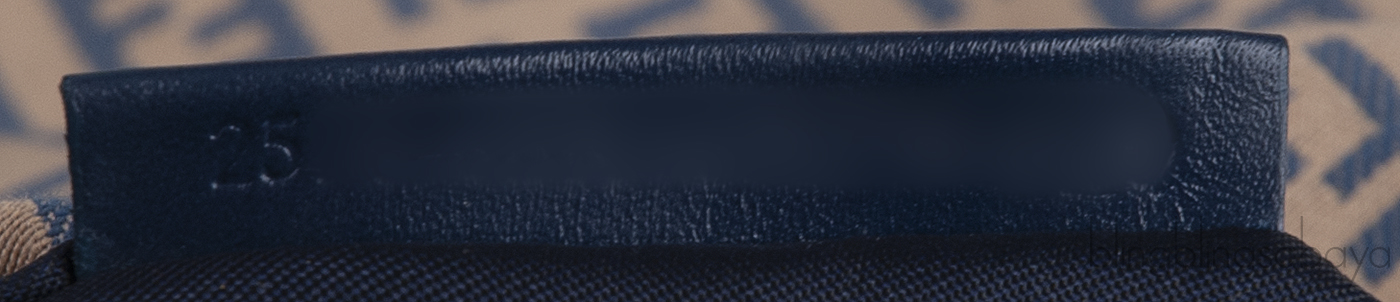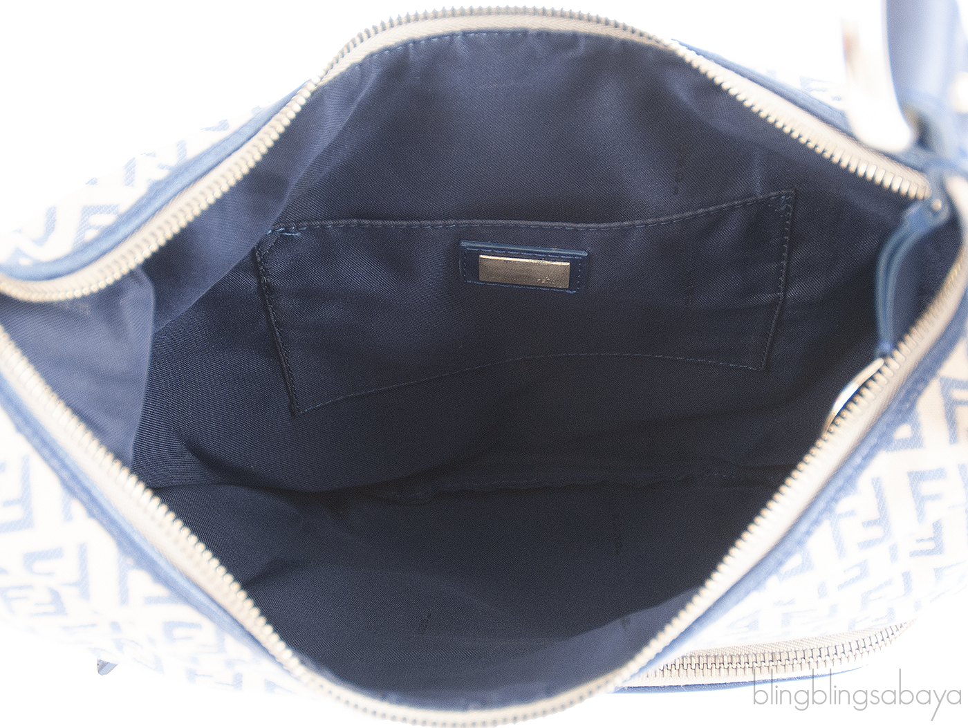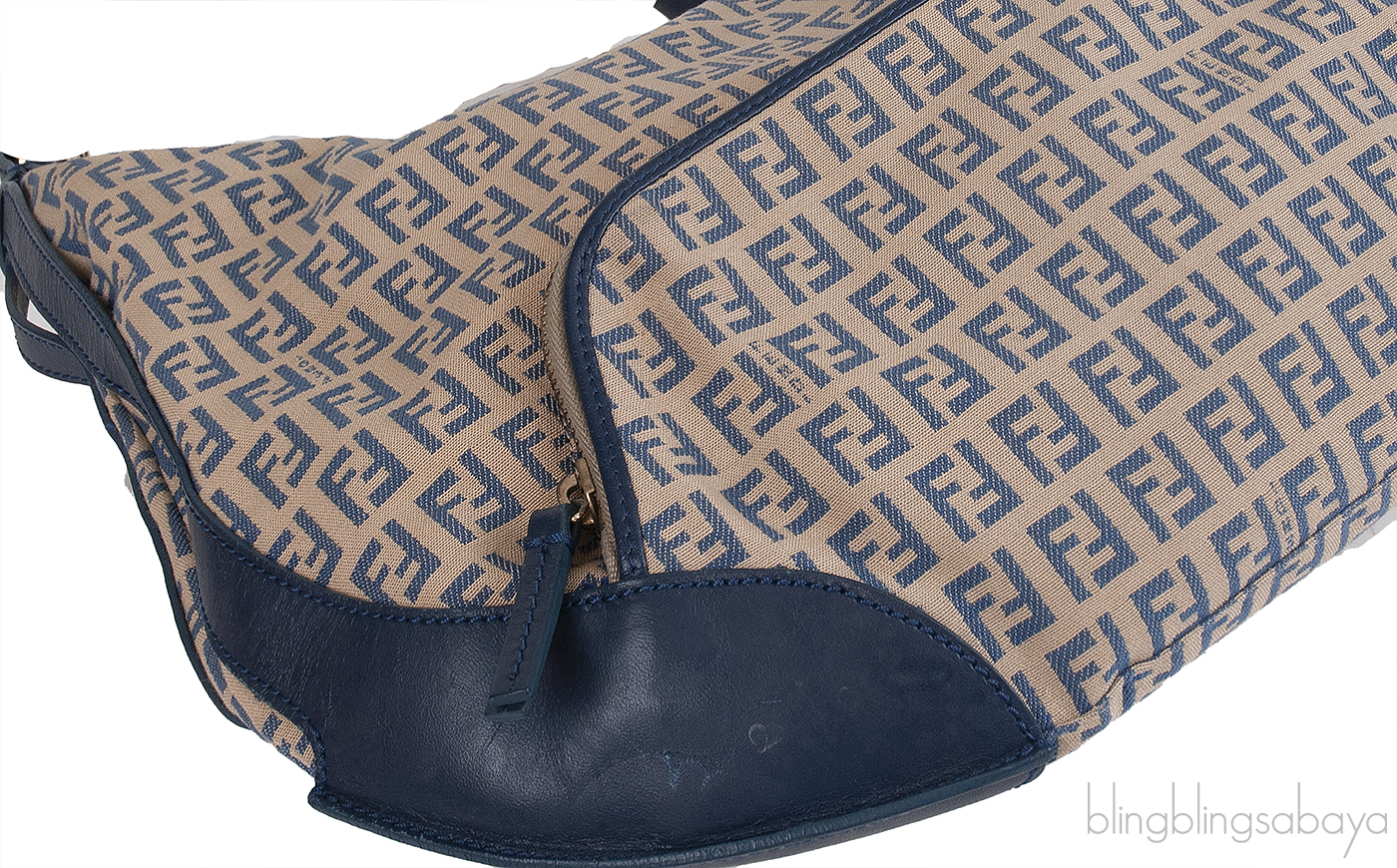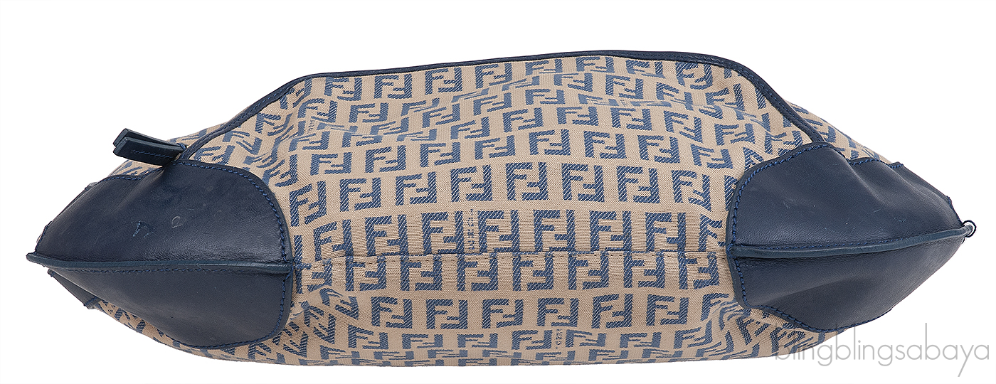 This bag features an FF Print all over the canvas, blue leather trim, zip pocket at front, short shoulder strap and has top zip opening. Interior is fully lined with canvas and has one zip pocket inside.