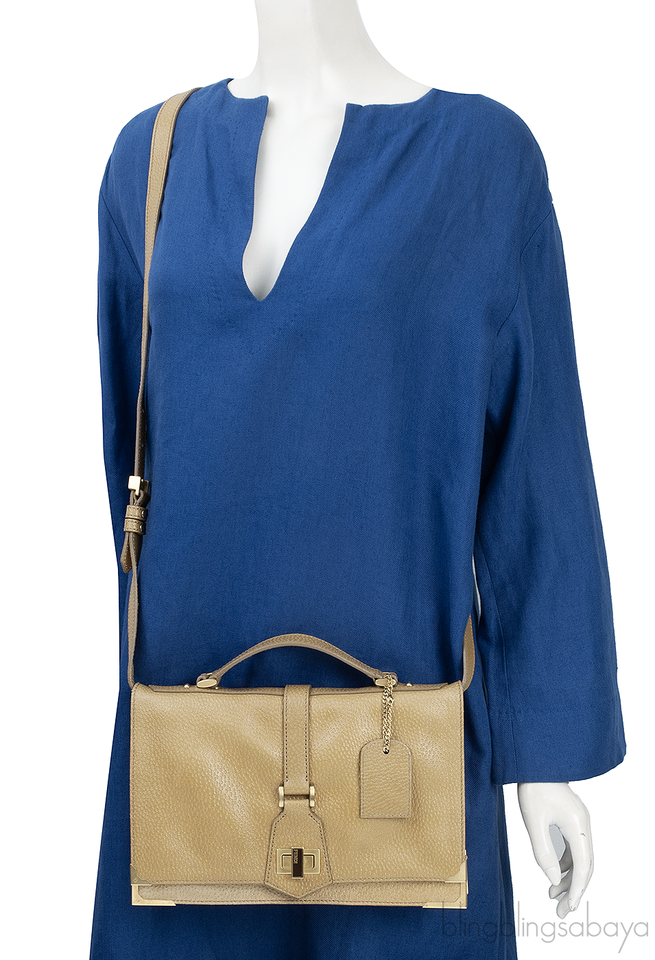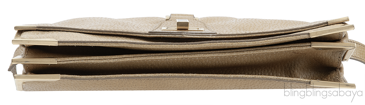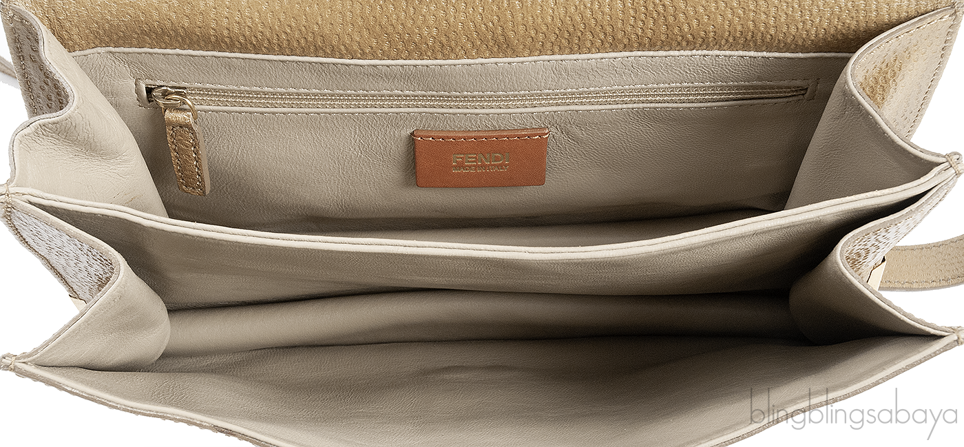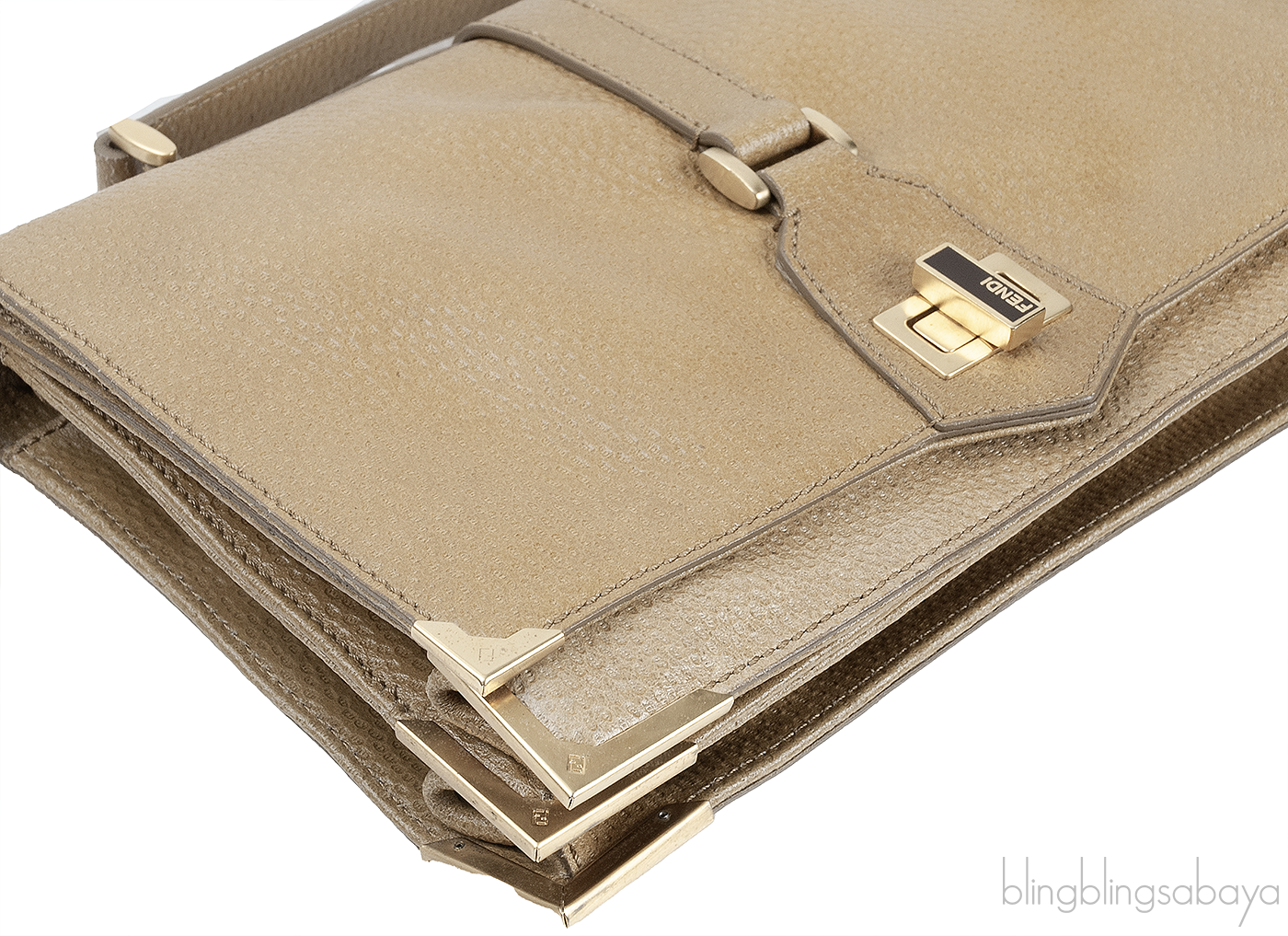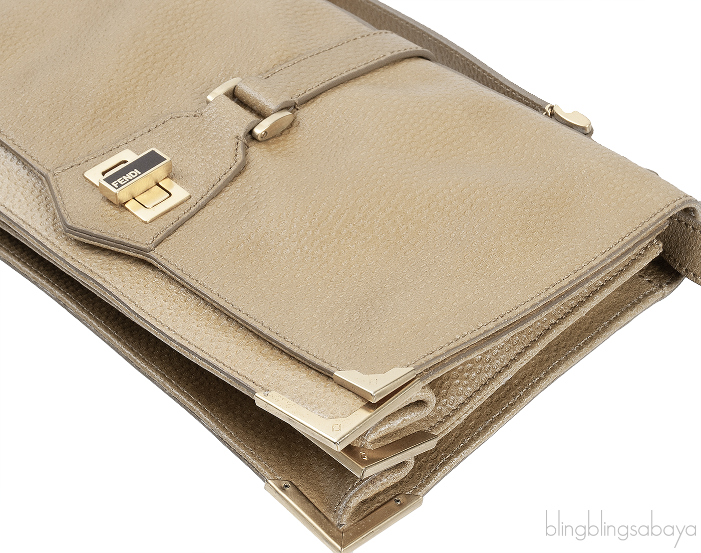 This Brown Clutch Shoulder Bag from Fendi is made from brown textured leather accented with brass metal. This clutch features a flap cover with with logo2 embossed turn-lock closures and gold metal cornering, nude leather interior lining with two major compartments and interior zip pocket. It has long detachable and adjustable shoulder strap and top handle for clutch use.