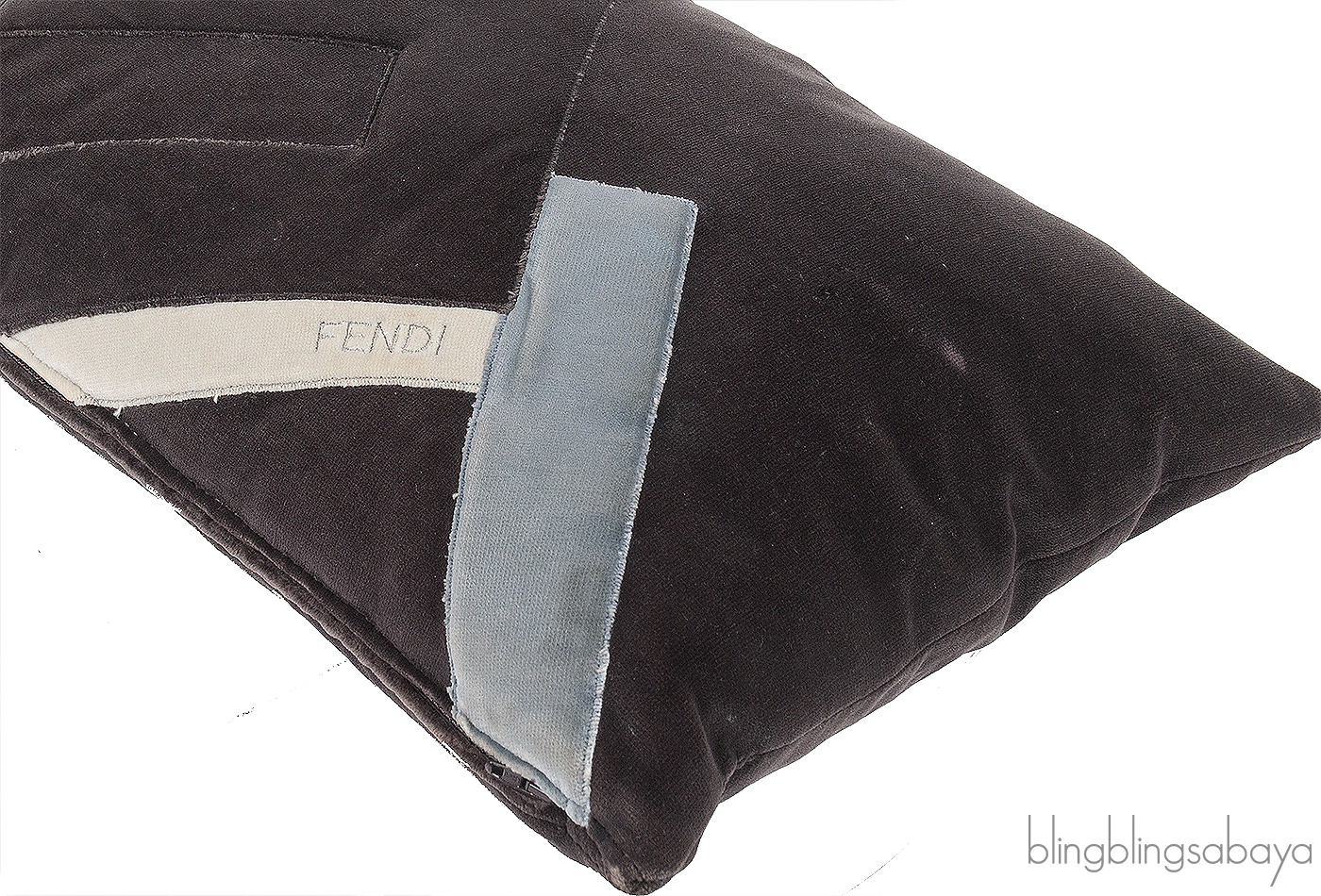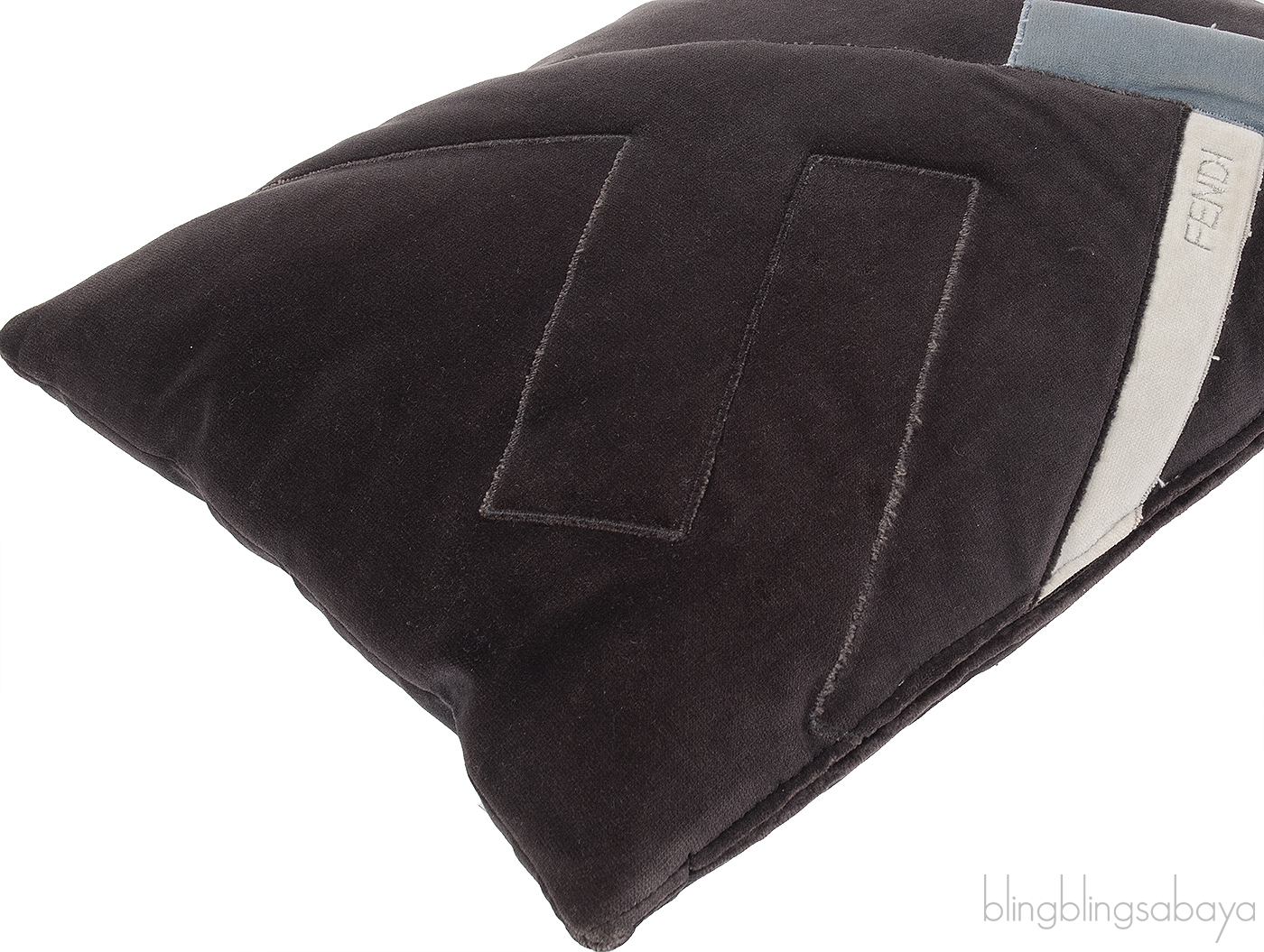 This Fendi Grey cushion is crafted in a soft charcoal velvety fabric, featuring a subtle embroidered geometric design. Accented with a light blue fabric band and iconic FENDI logo2 tag for a refined designer touch. Finished with a zip closure and and and FENDI metal plate label. Perfect for elevating any luxury interior.