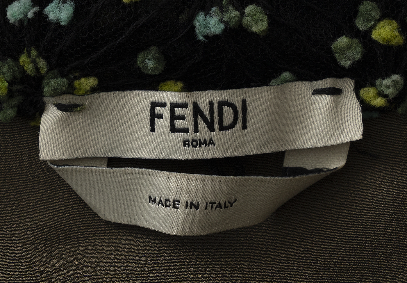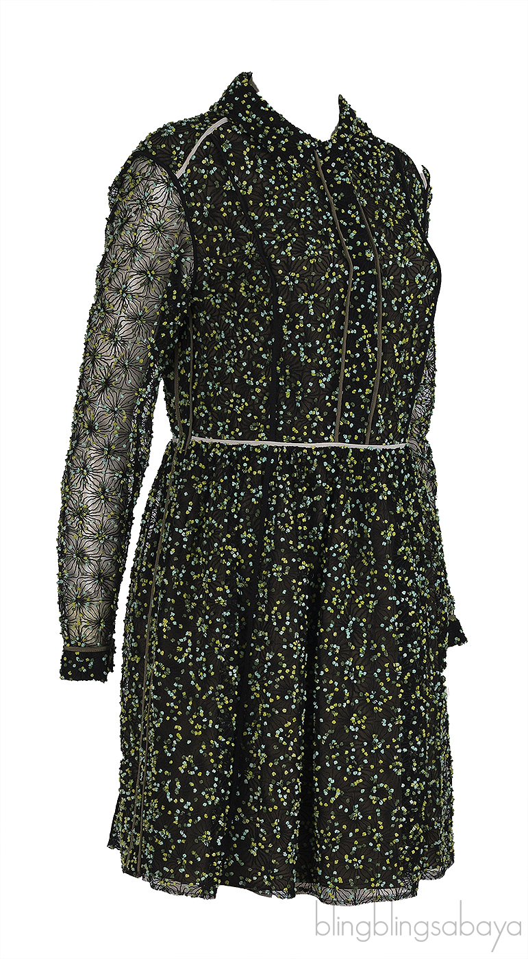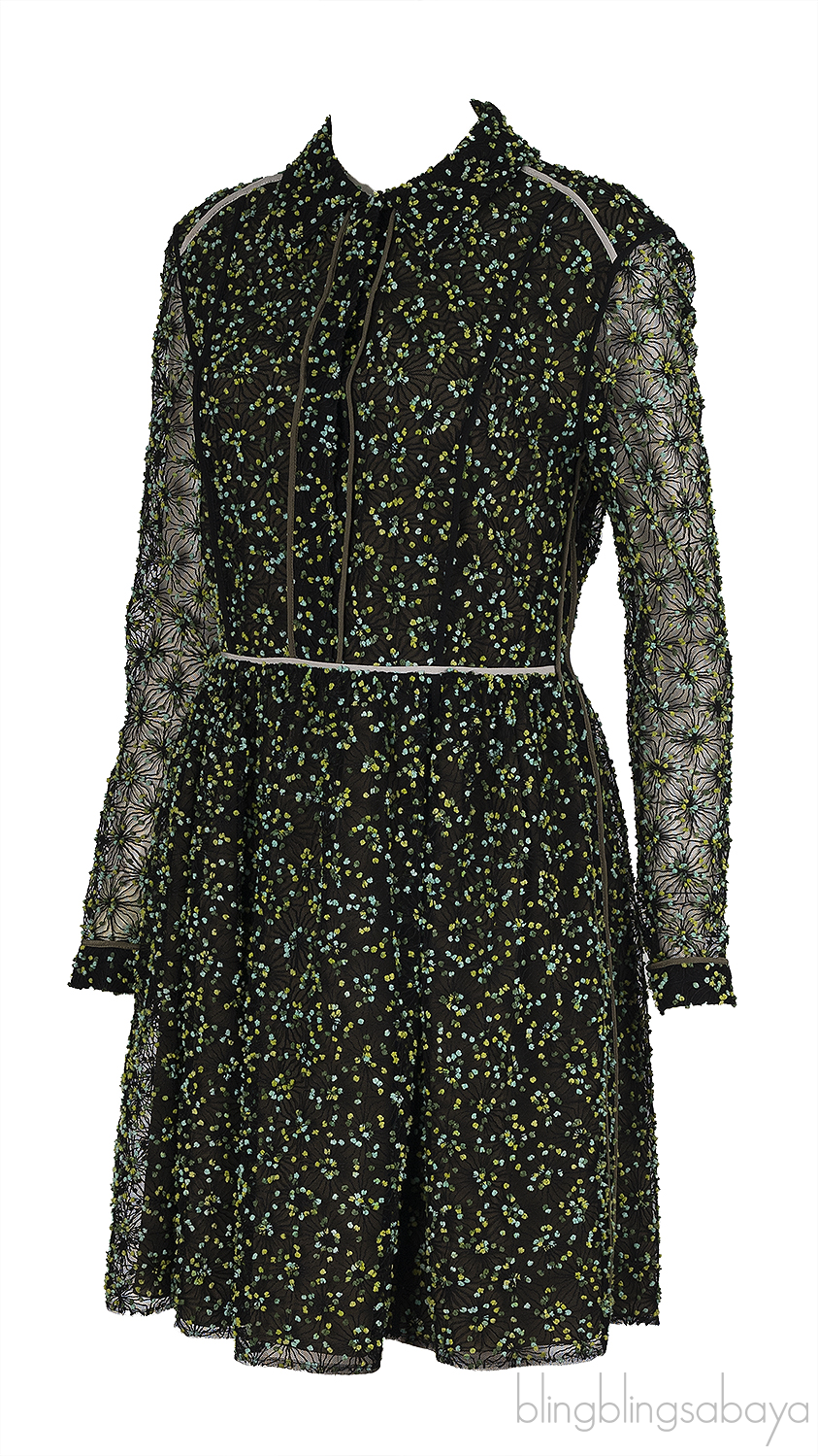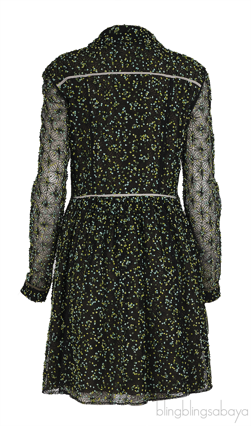 This Fendi Green Embellished Long Sleeve Mini Dress crafted in 20% Polyamide and 50% Acrylic and 100% Silk fabric featuring a floral embroidered dress with collar, button fastening at front, see-through embroidered long sleeves and mini length. Fully Lined.