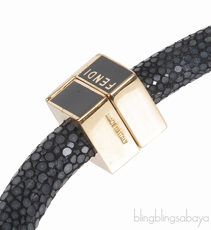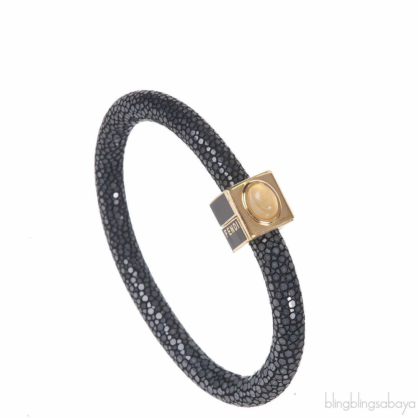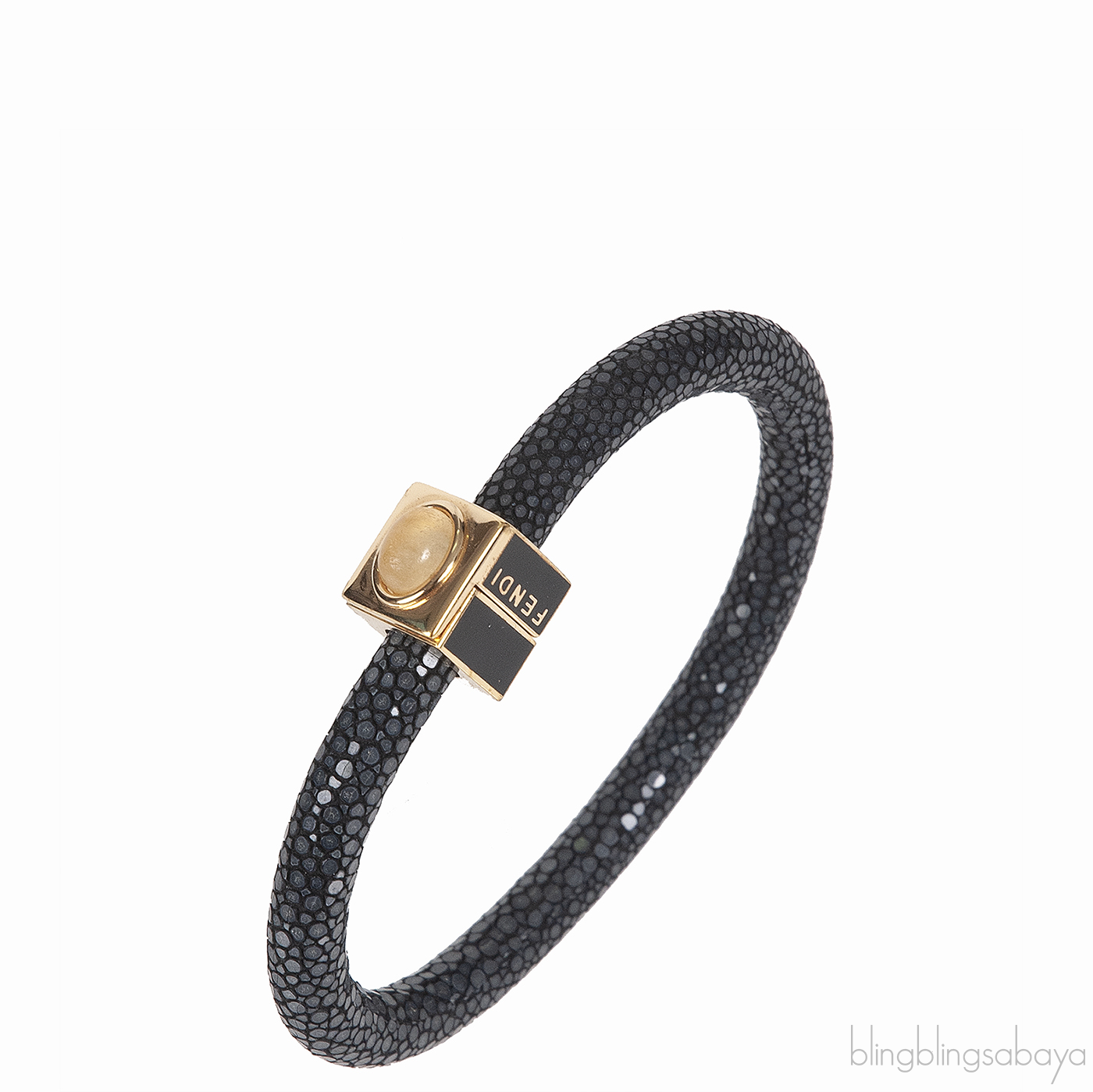 This Fendi Resin Cabochon Stingray Bangle Bracelet is expertly crafted from sleek black stingray leather. It features a chic gold-tone cube charm with enamel detailing, branded with the logo2, and a stunning cabochon centerpiece for an elevated, luxe look.