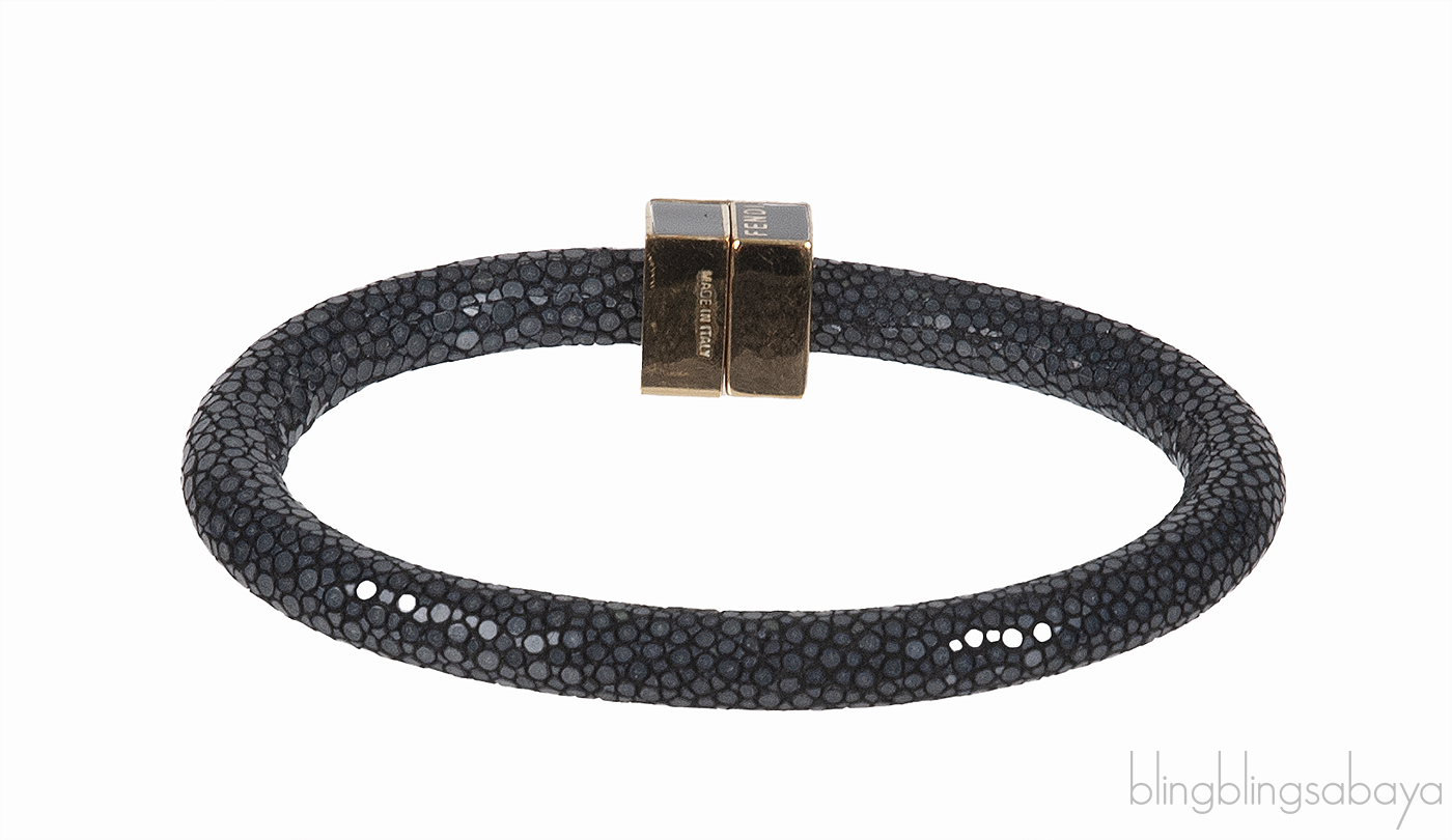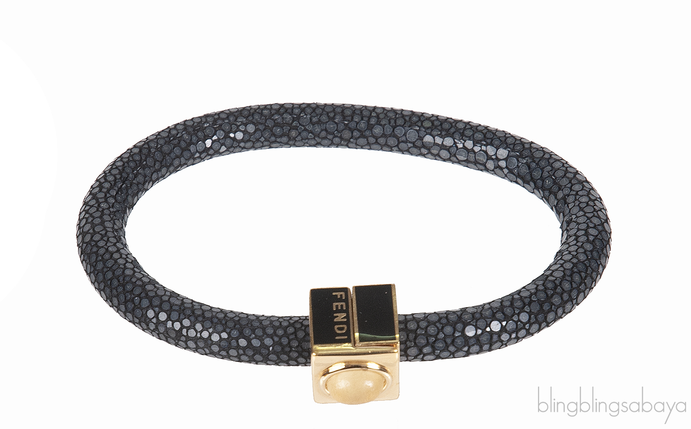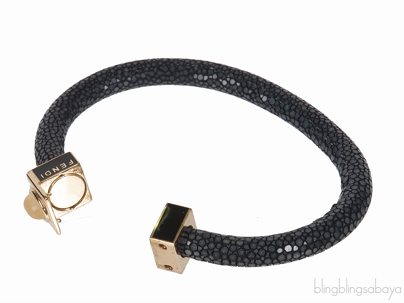 This Fendi Resin Cabochon Stingray Bangle Bracelet is expertly crafted from sleek black stingray leather. It features a chic gold-tone cube charm with enamel detailing, branded with the logo2, and a stunning cabochon centerpiece for an elevated, luxe look.